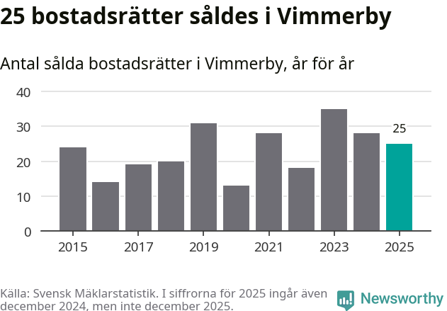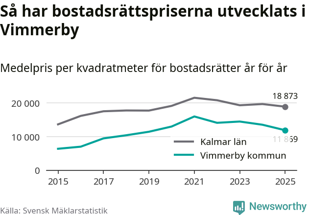Det såldes totalt 25 bostadsrätter i Vimmerby kommun under året. Genomsnittspriset per kvadratmeter landade på 11 869 kronor. Det är en minskning med tolv procent i kommunen på ett år.