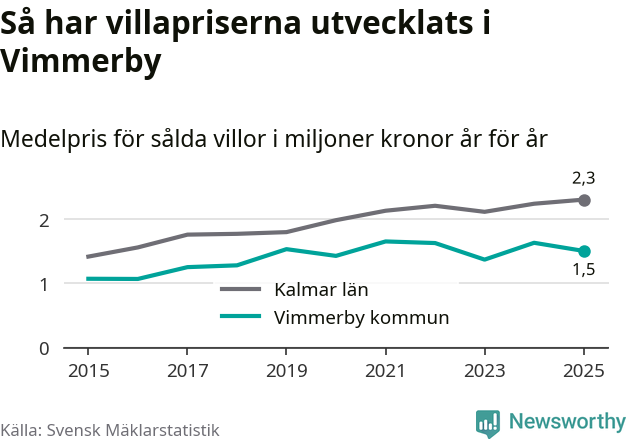 1,5 miljoner kronor är medelpriset för de villor som såldes i Vimmerby kommun under året, eller 12 913 kronor per kvadratmeter. Det innebär en prisminskning med åtta procent på ett år.