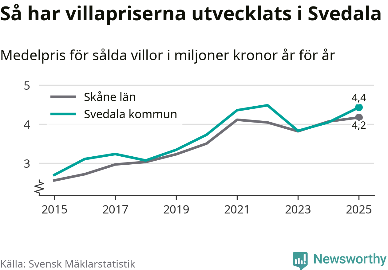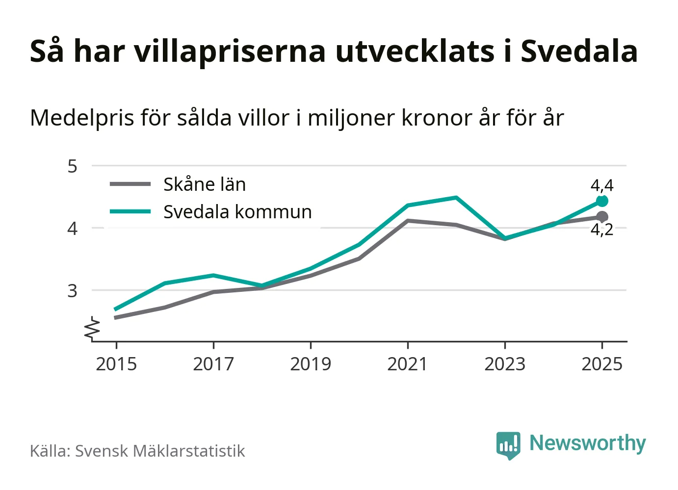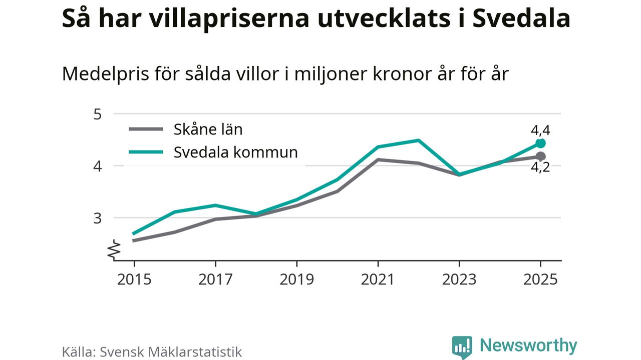 4,4 miljoner kronor är medelpriset för de villor som såldes i Svedala kommun under året, eller 33 148 kronor per kvadratmeter. Det innebär en prisökning med tio procent på ett år och är andra året i rad som priserna ökar i kommunen.