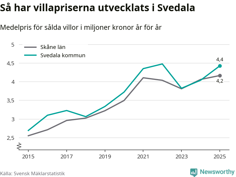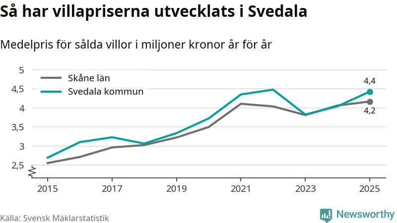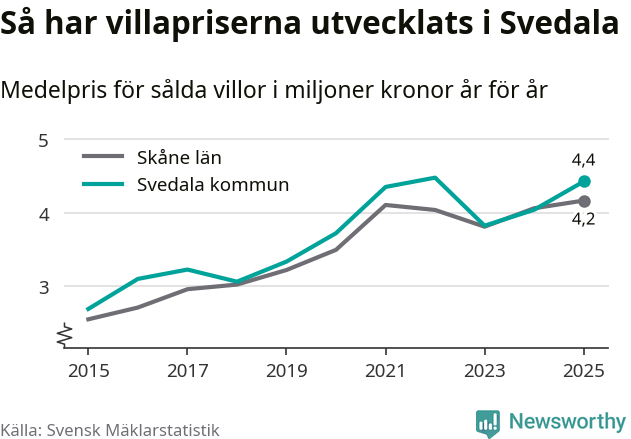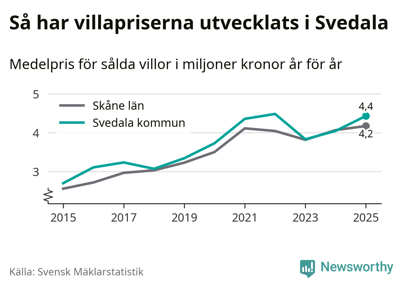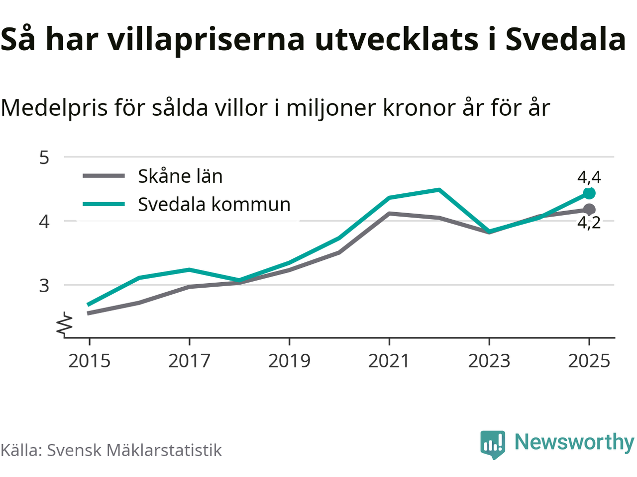 4,4 miljoner kronor är medelpriset för de villor som såldes i Svedala kommun under året, eller 33 148 kronor per kvadratmeter. Det innebär en prisökning med tio procent på ett år och är andra året i rad som priserna ökar i kommunen.