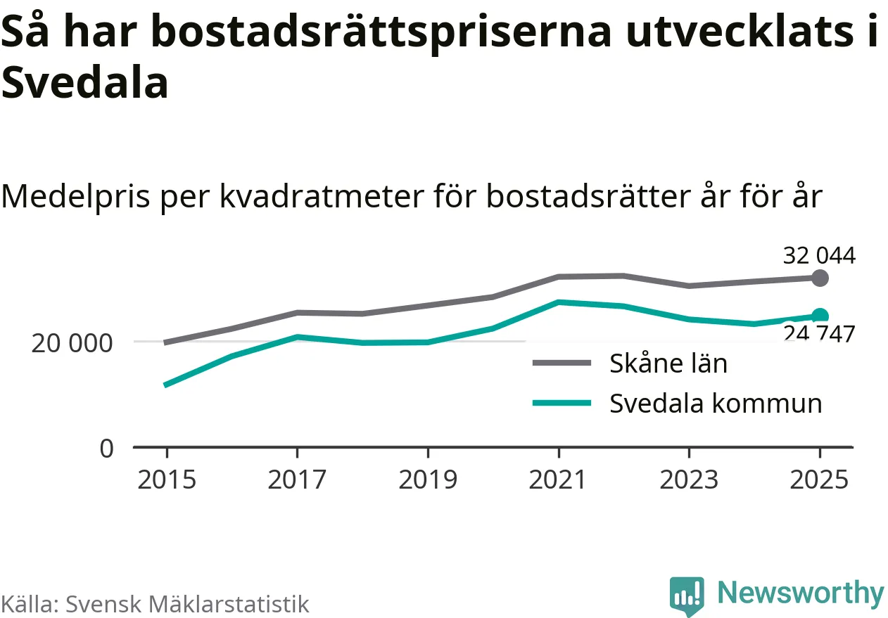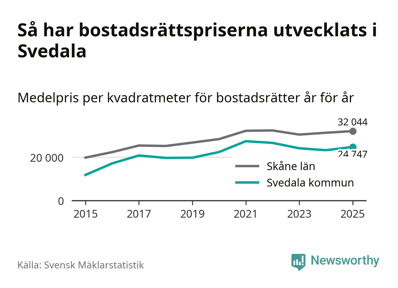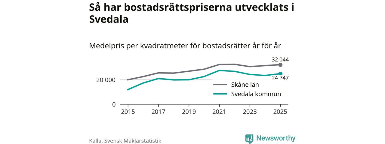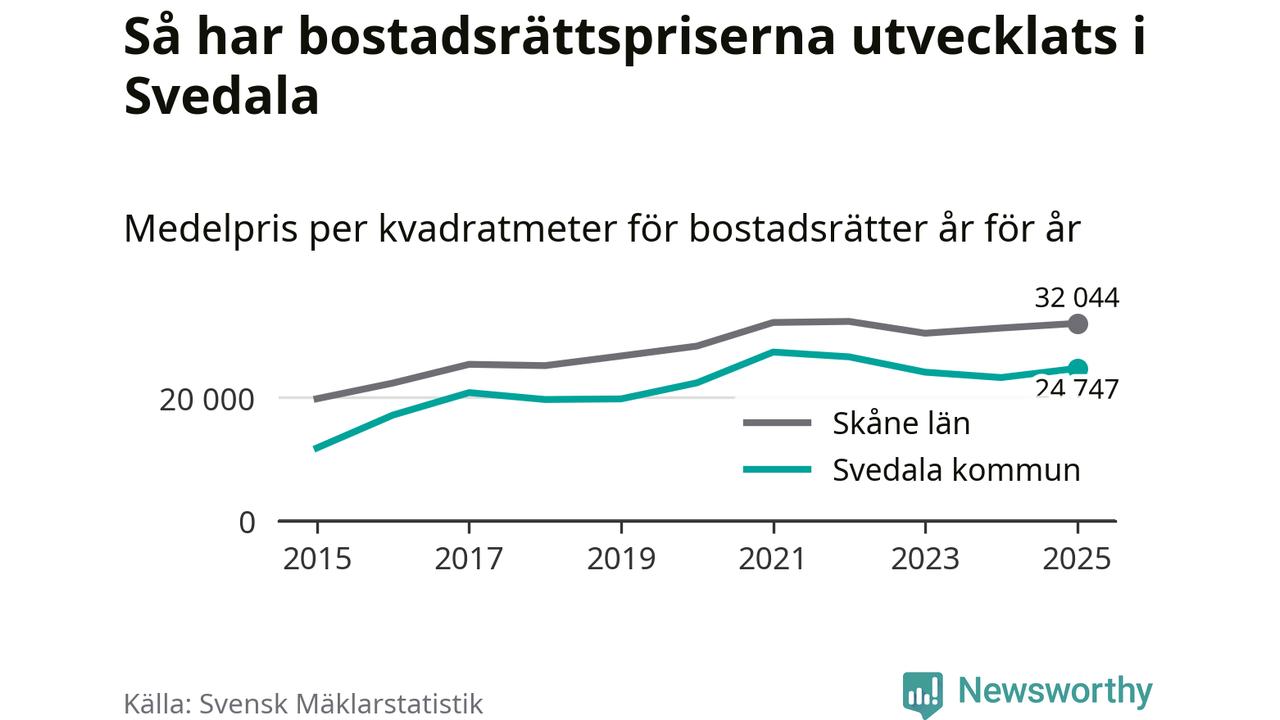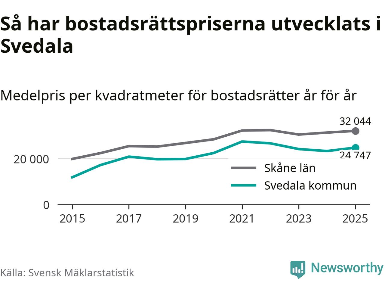 Det såldes totalt 189 bostadsrätter i Svedala kommun under året. Genomsnittspriset per kvadratmeter landade på 24 747 kronor. Det är en ökning med sex procent i kommunen på ett år.