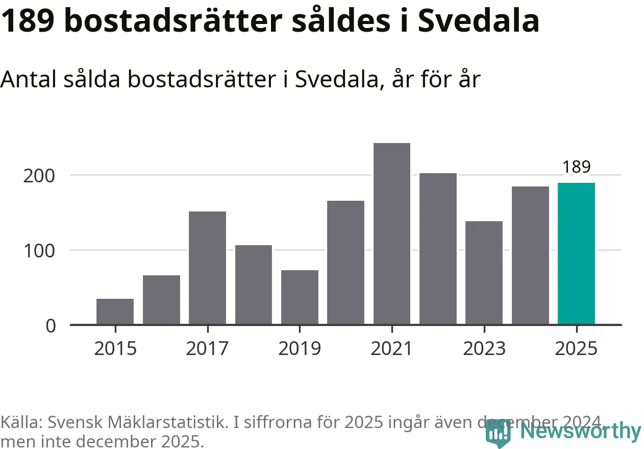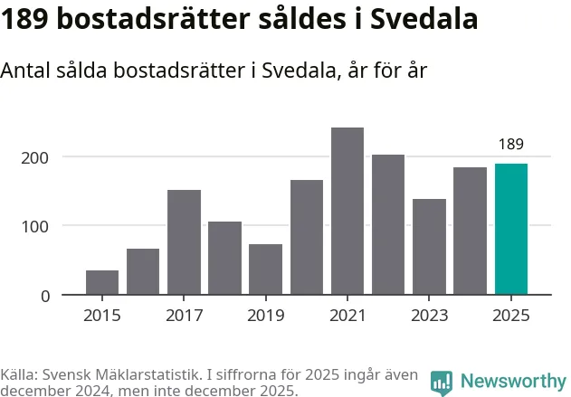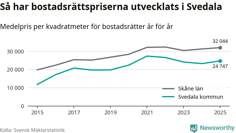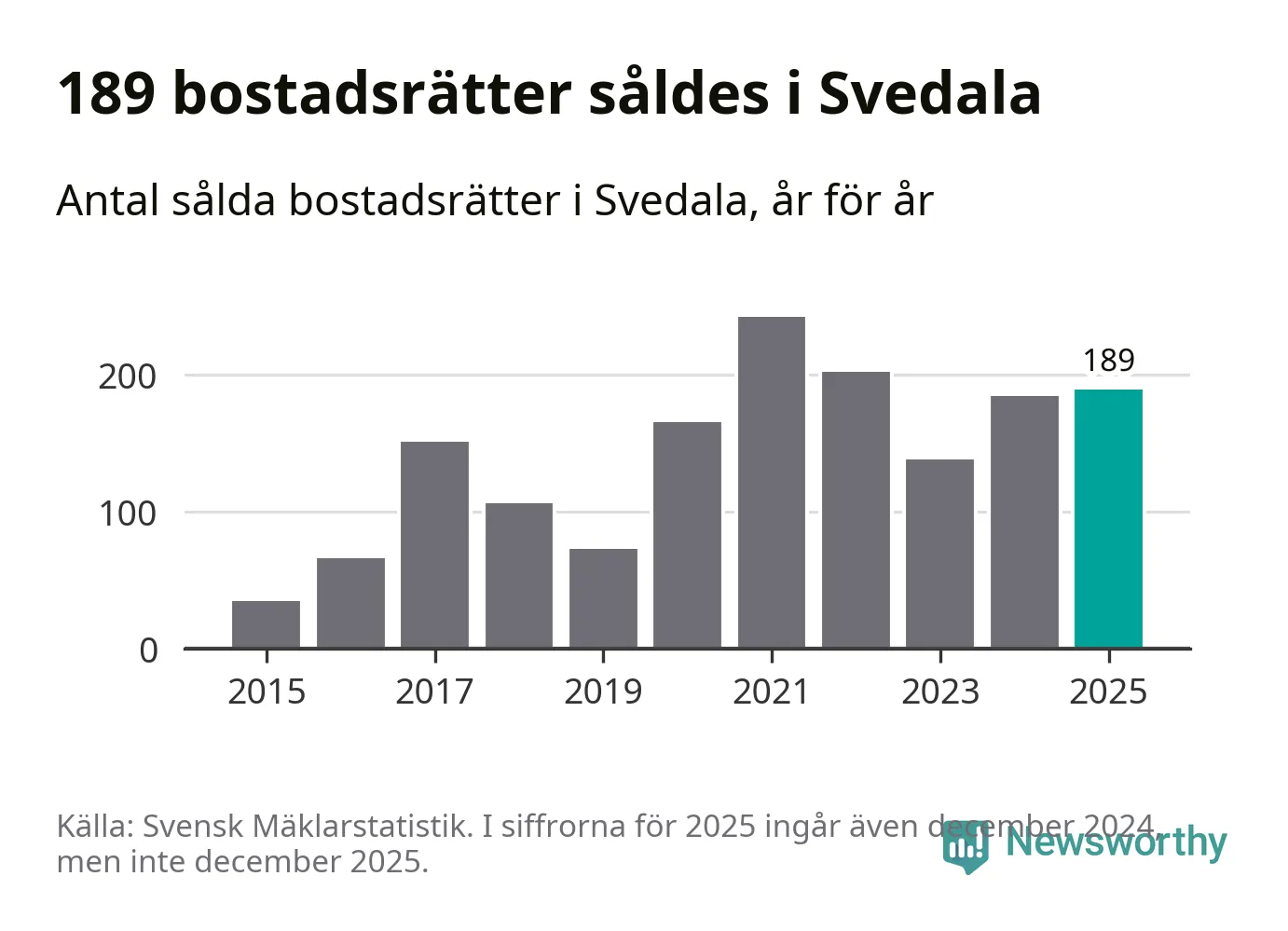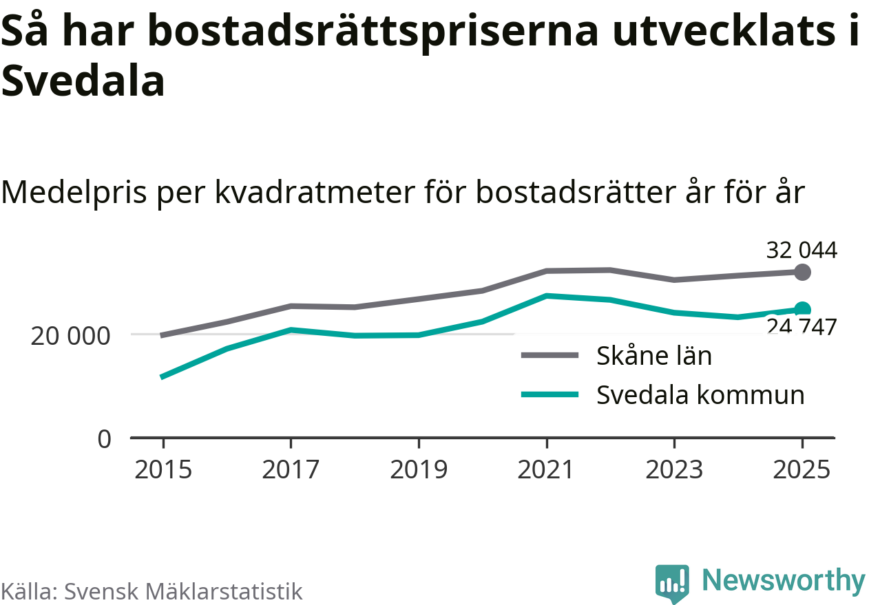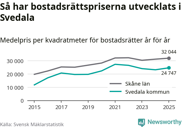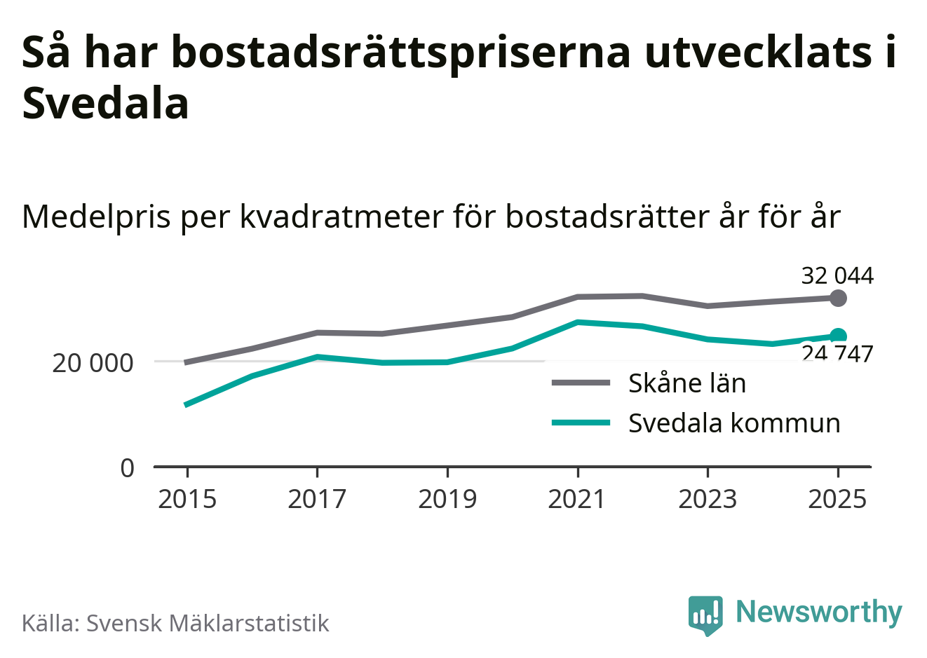 Det såldes totalt 189 bostadsrätter i Svedala kommun under året. Genomsnittspriset per kvadratmeter landade på 24 747 kronor. Det är en ökning med sex procent i kommunen på ett år.