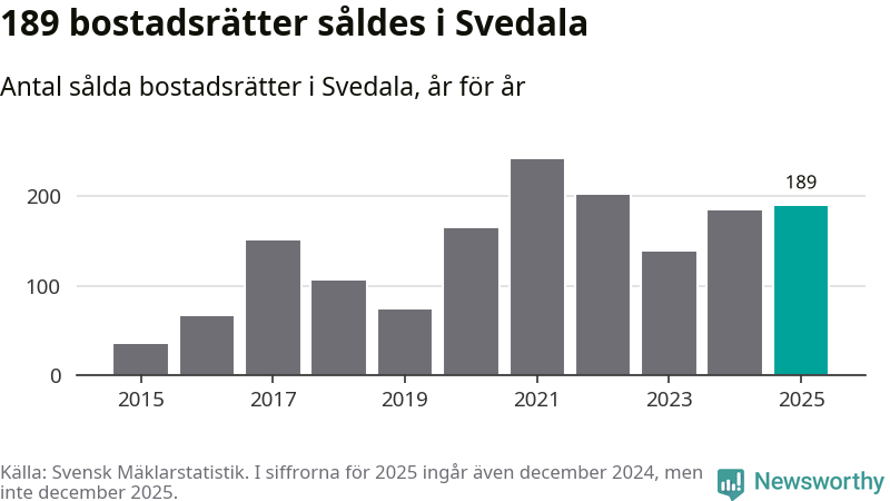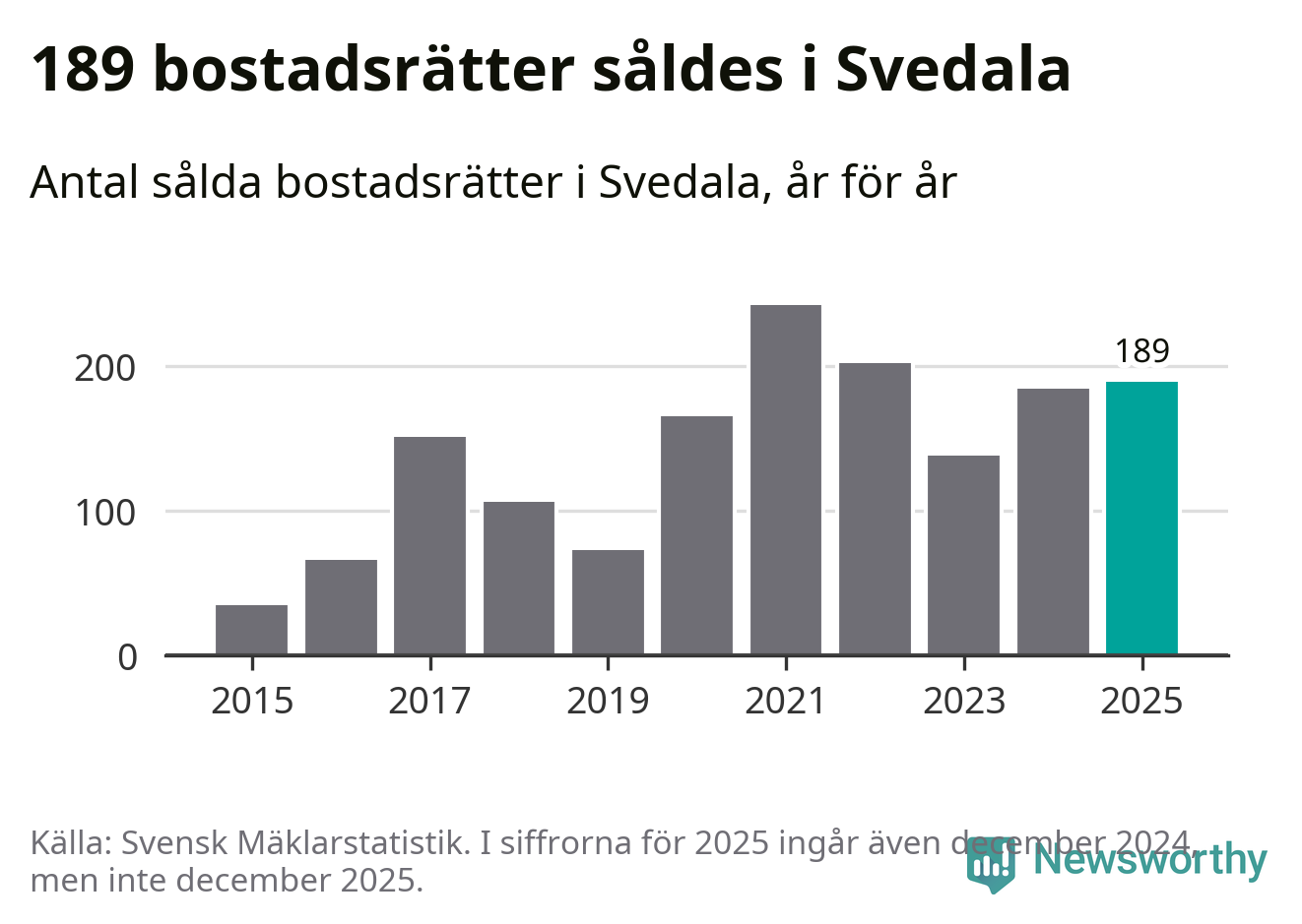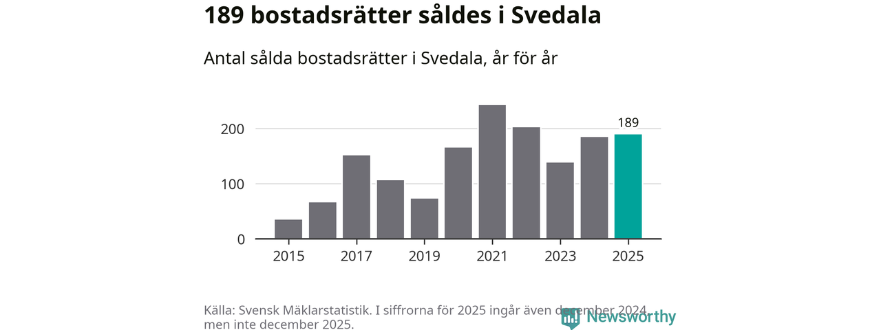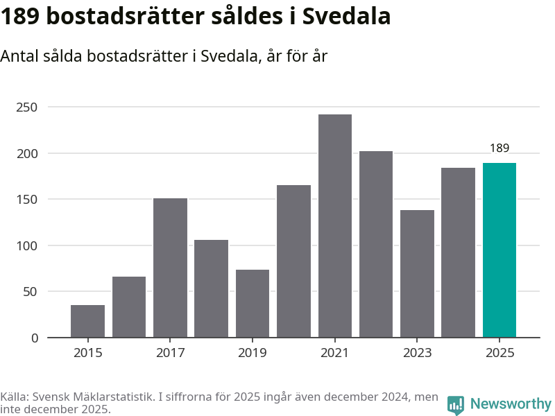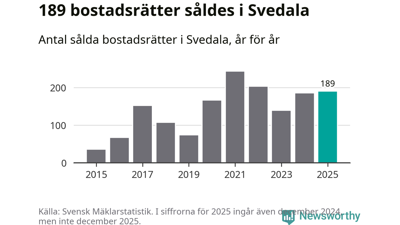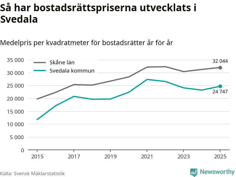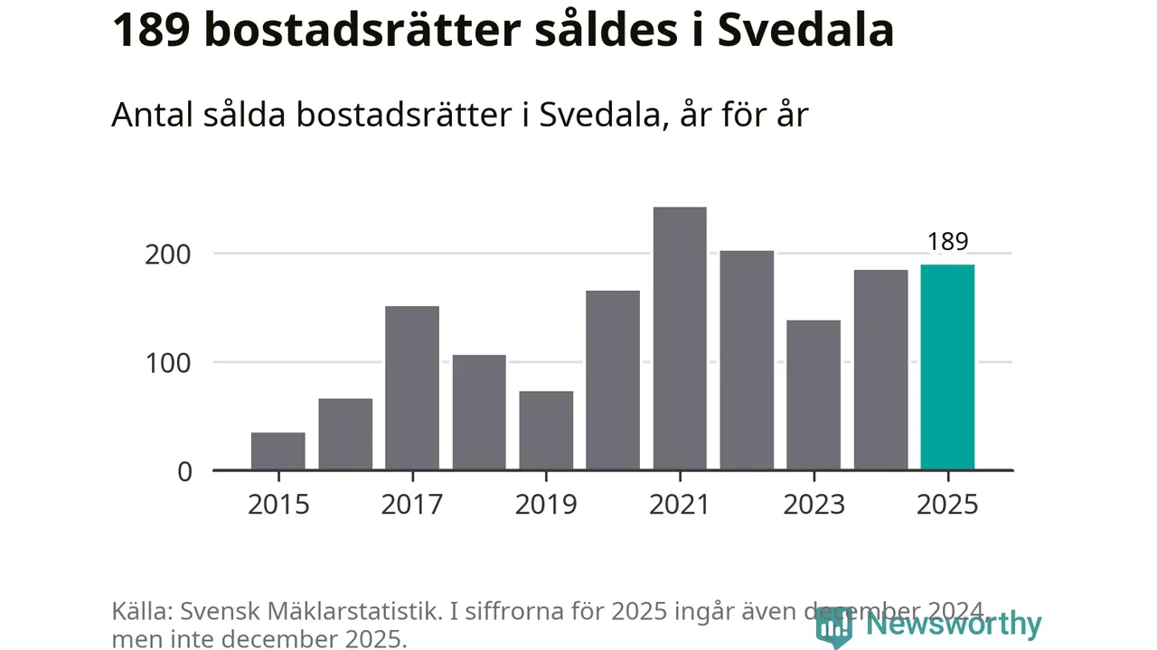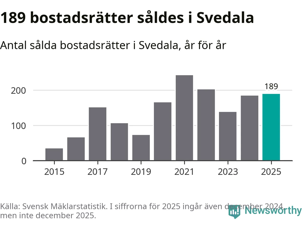 Det såldes totalt 189 bostadsrätter i Svedala kommun under året. Genomsnittspriset per kvadratmeter landade på 24 747 kronor. Det är en ökning med sex procent i kommunen på ett år.