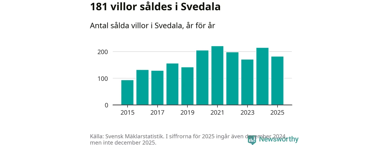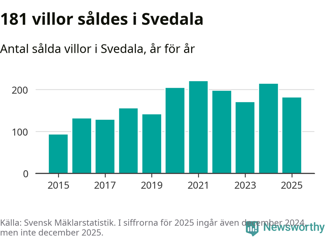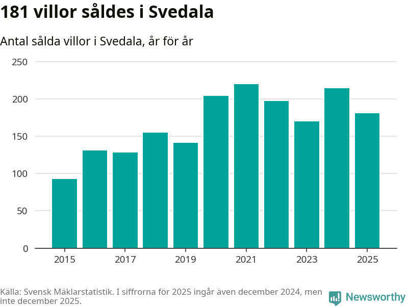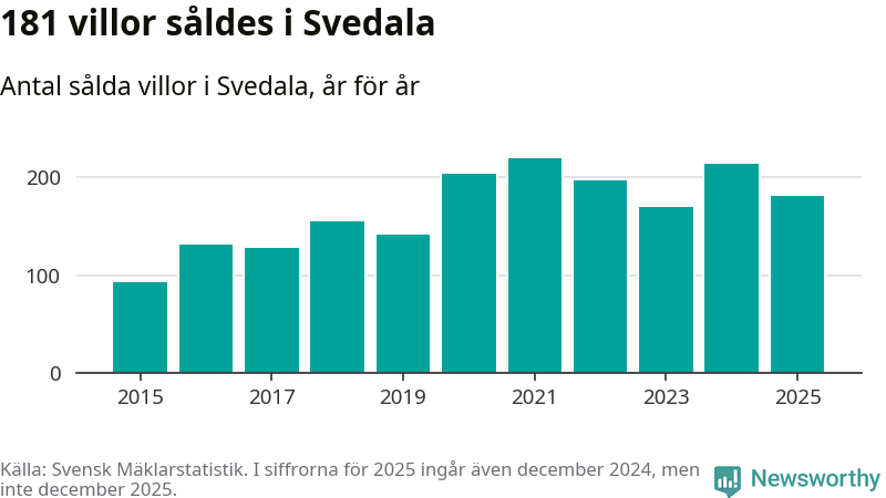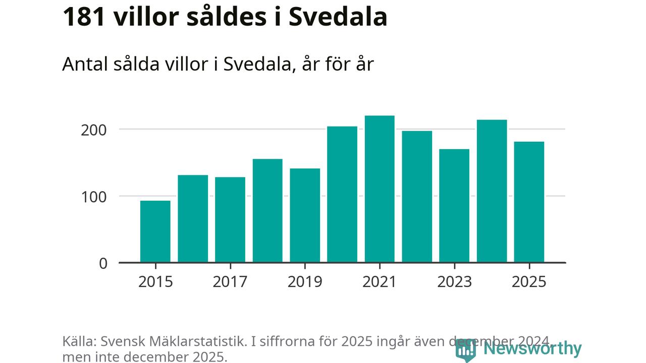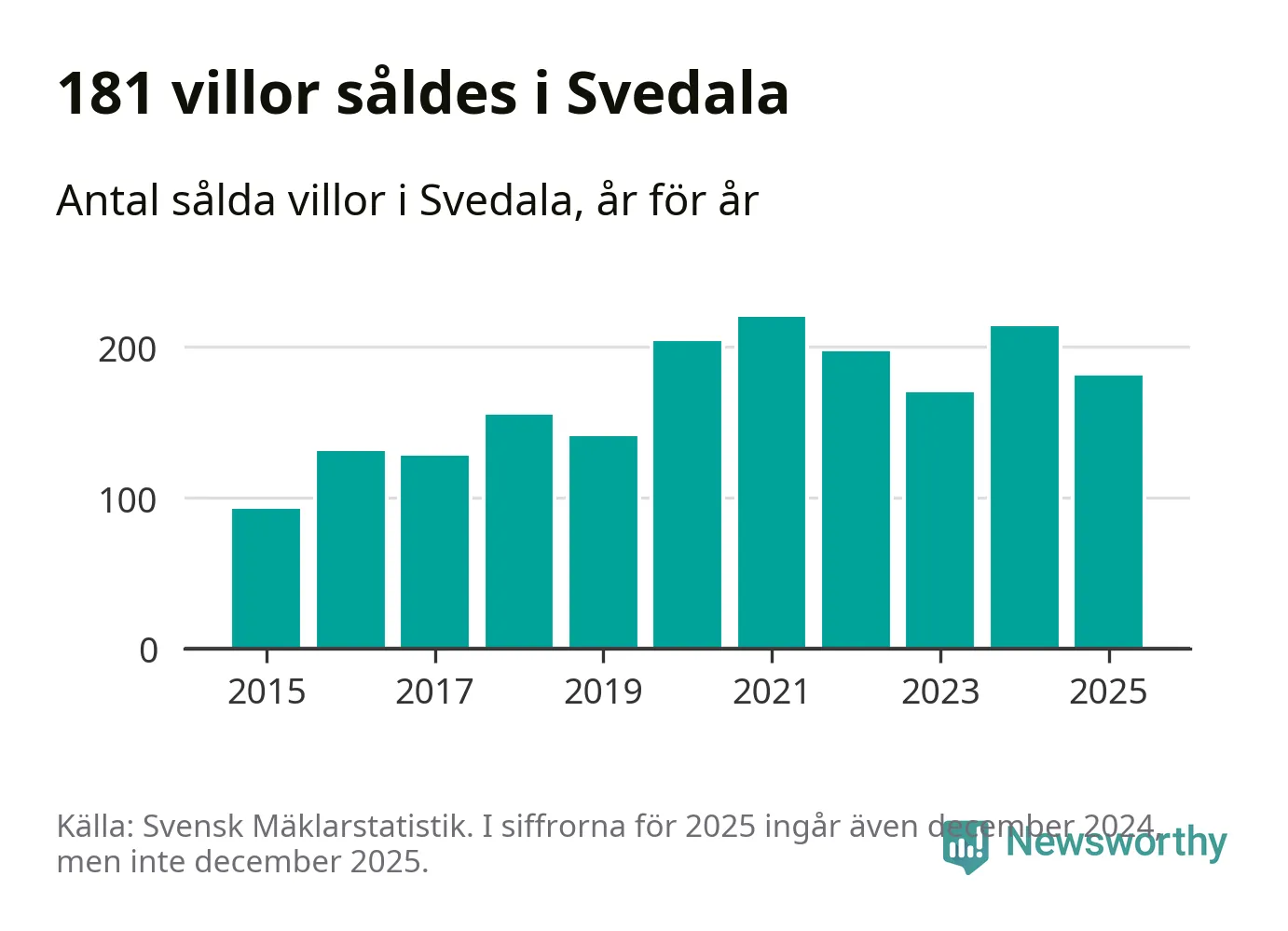 Däremot minskade antalet sålda villor. Totalt såldes 181 villor, att jämföra med 214 under 2024.