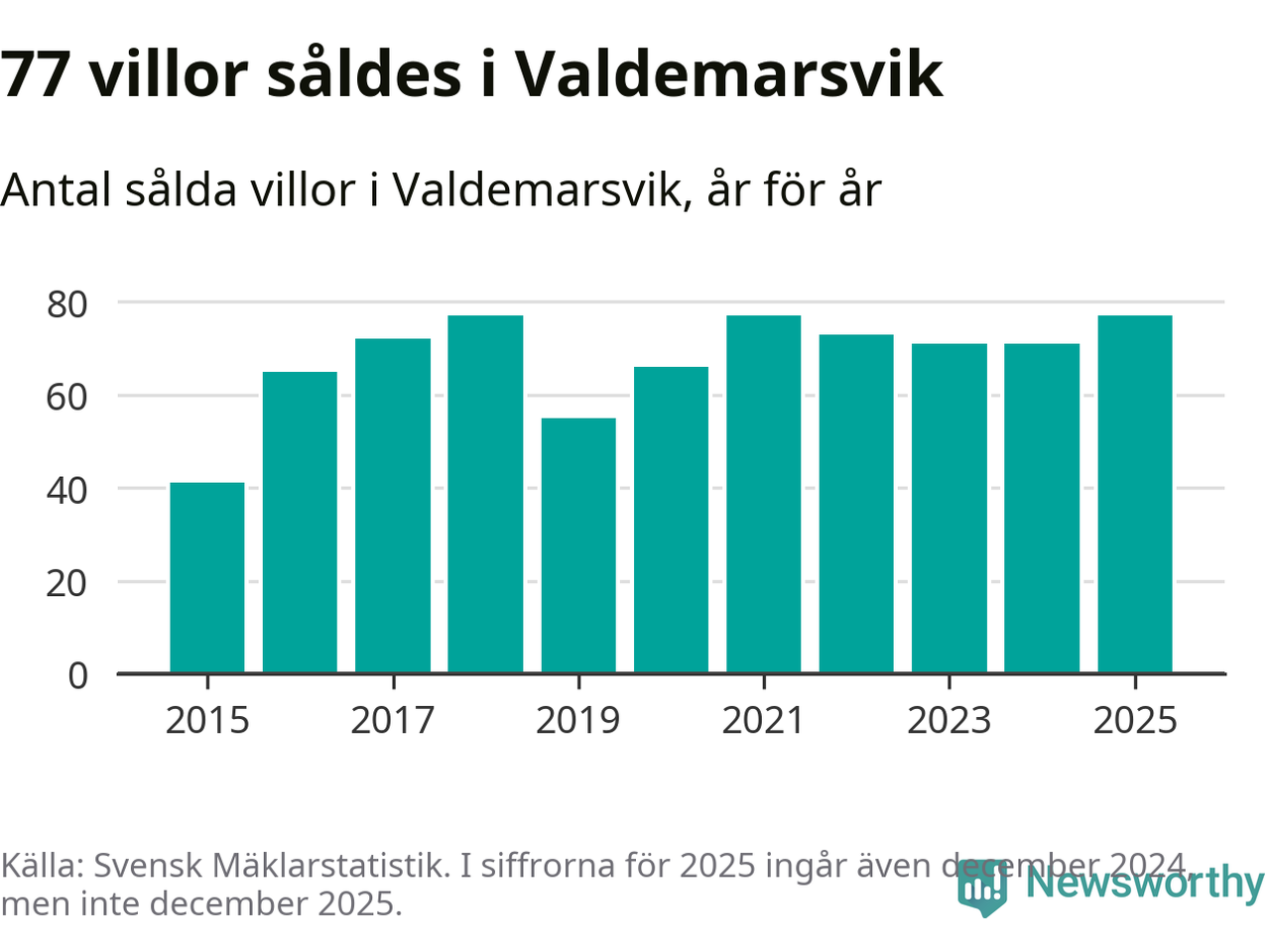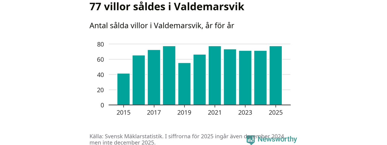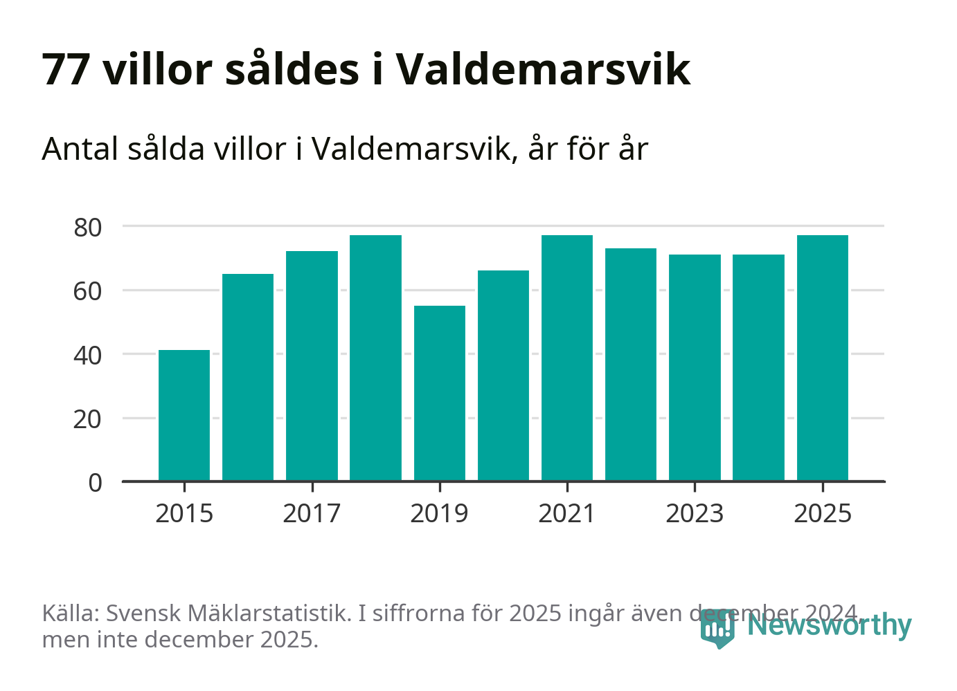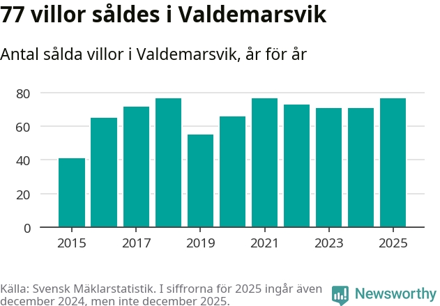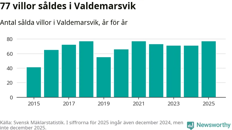 Däremot ökade antalet sålda villor. Totalt såldes 77 villor, att jämföra med 71 under 2024.