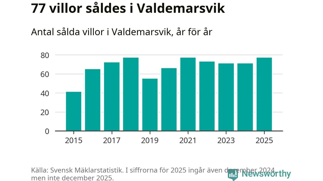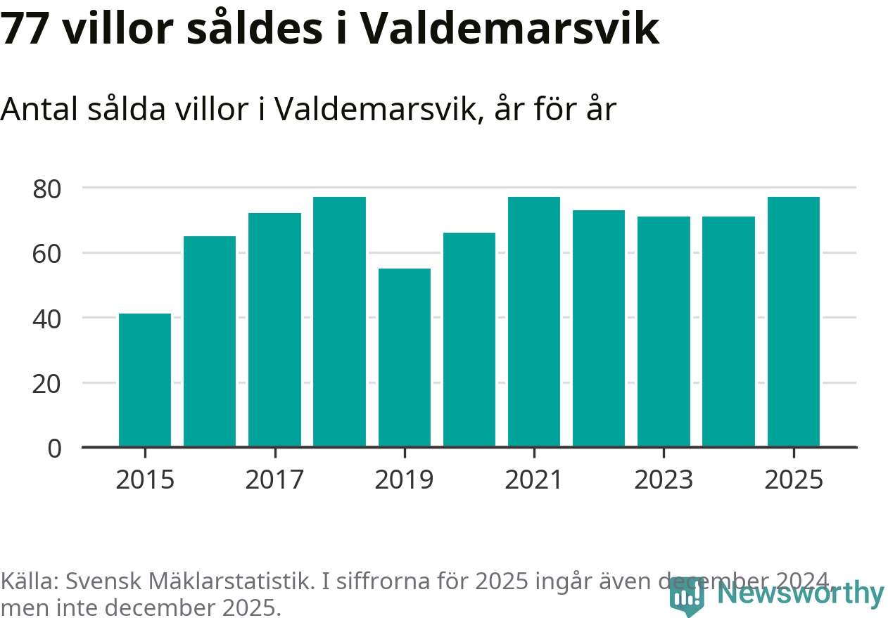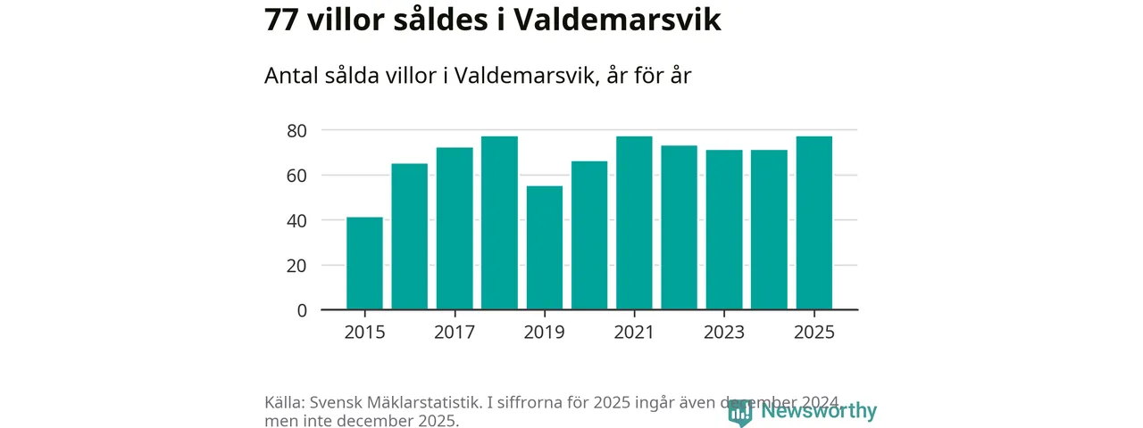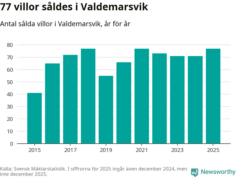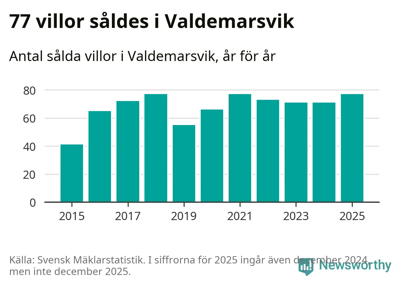 Däremot ökade antalet sålda villor. Totalt såldes 77 villor, att jämföra med 71 under 2024.