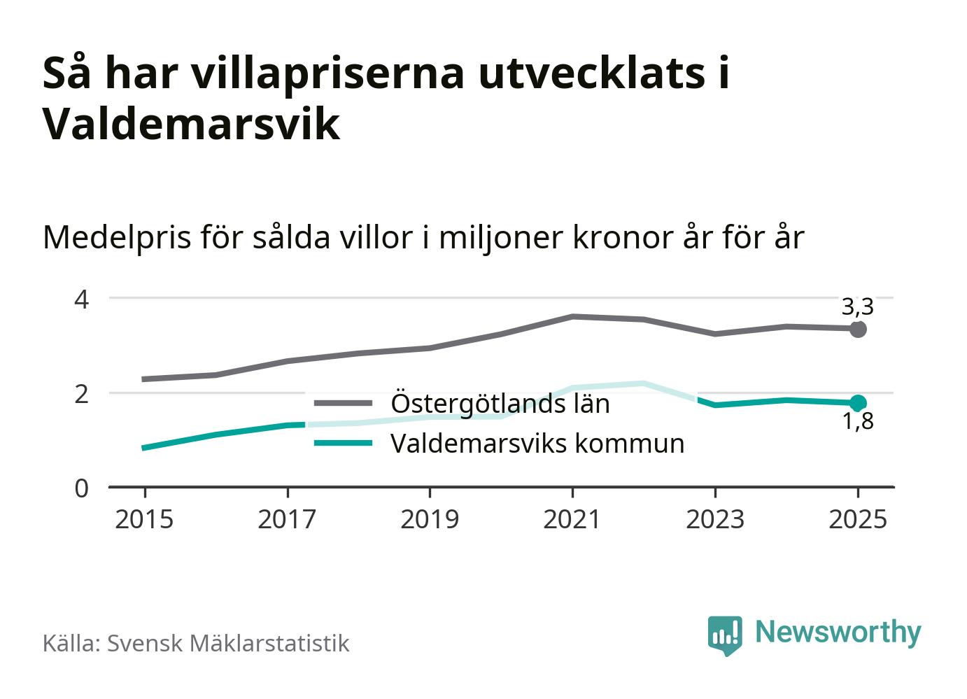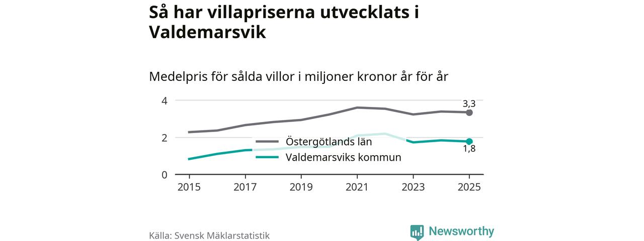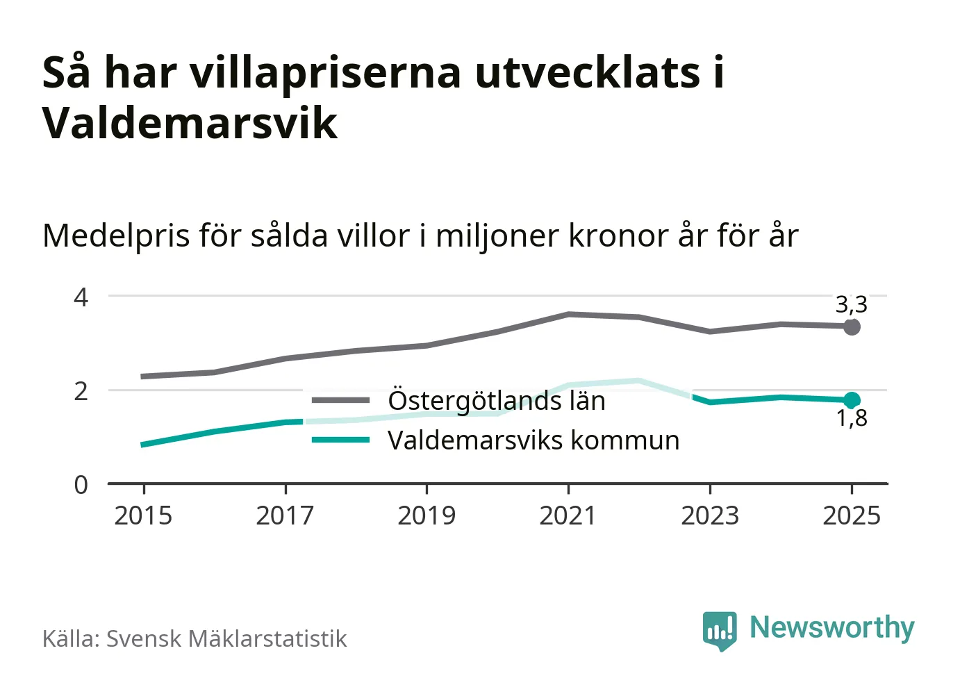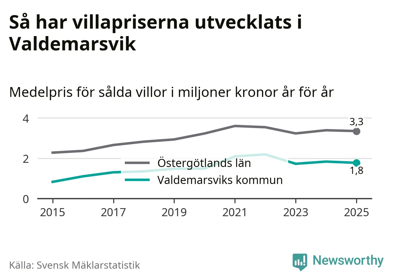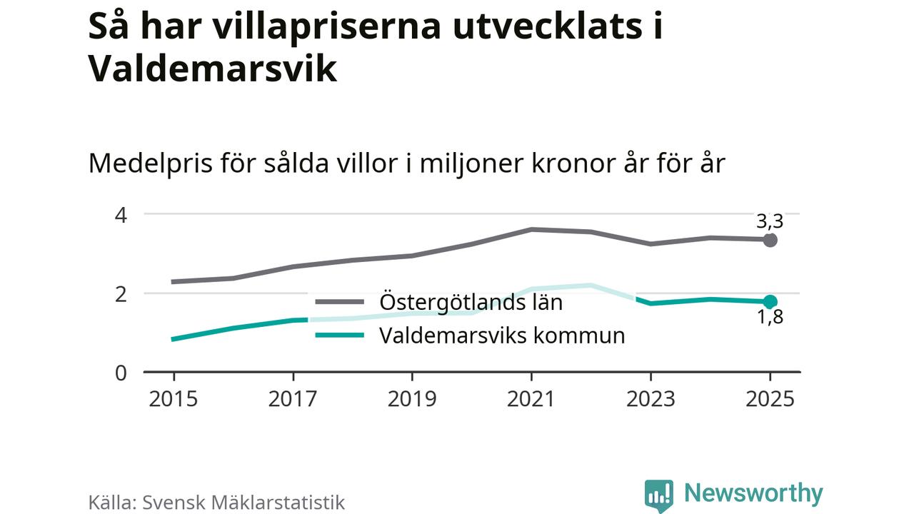 1,8 miljoner kronor är medelpriset för de villor som såldes i Valdemarsviks kommun under året, eller 16 081 kronor per kvadratmeter. Det innebär en prisminskning med tre procent på ett år.