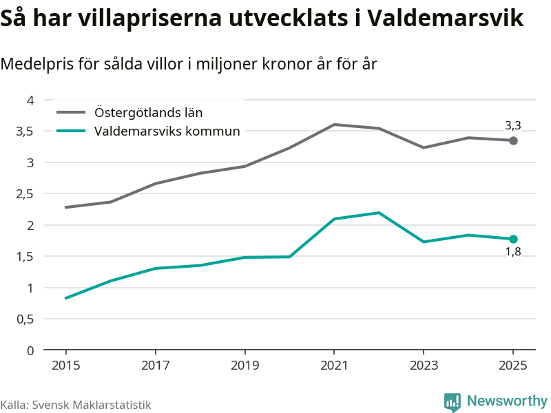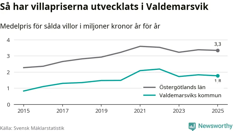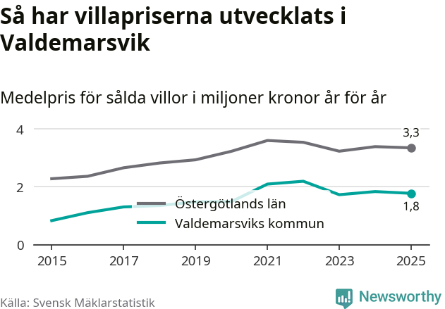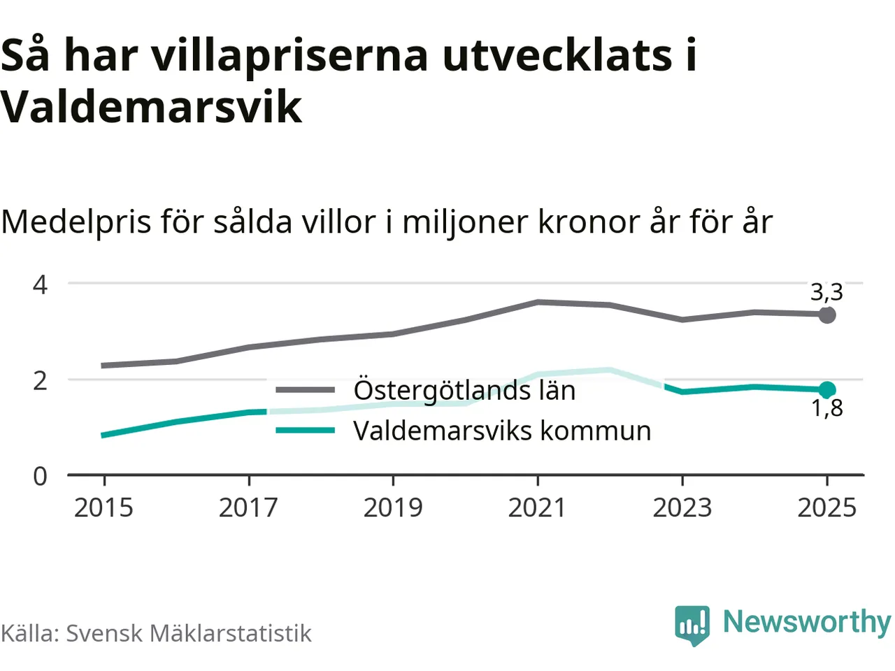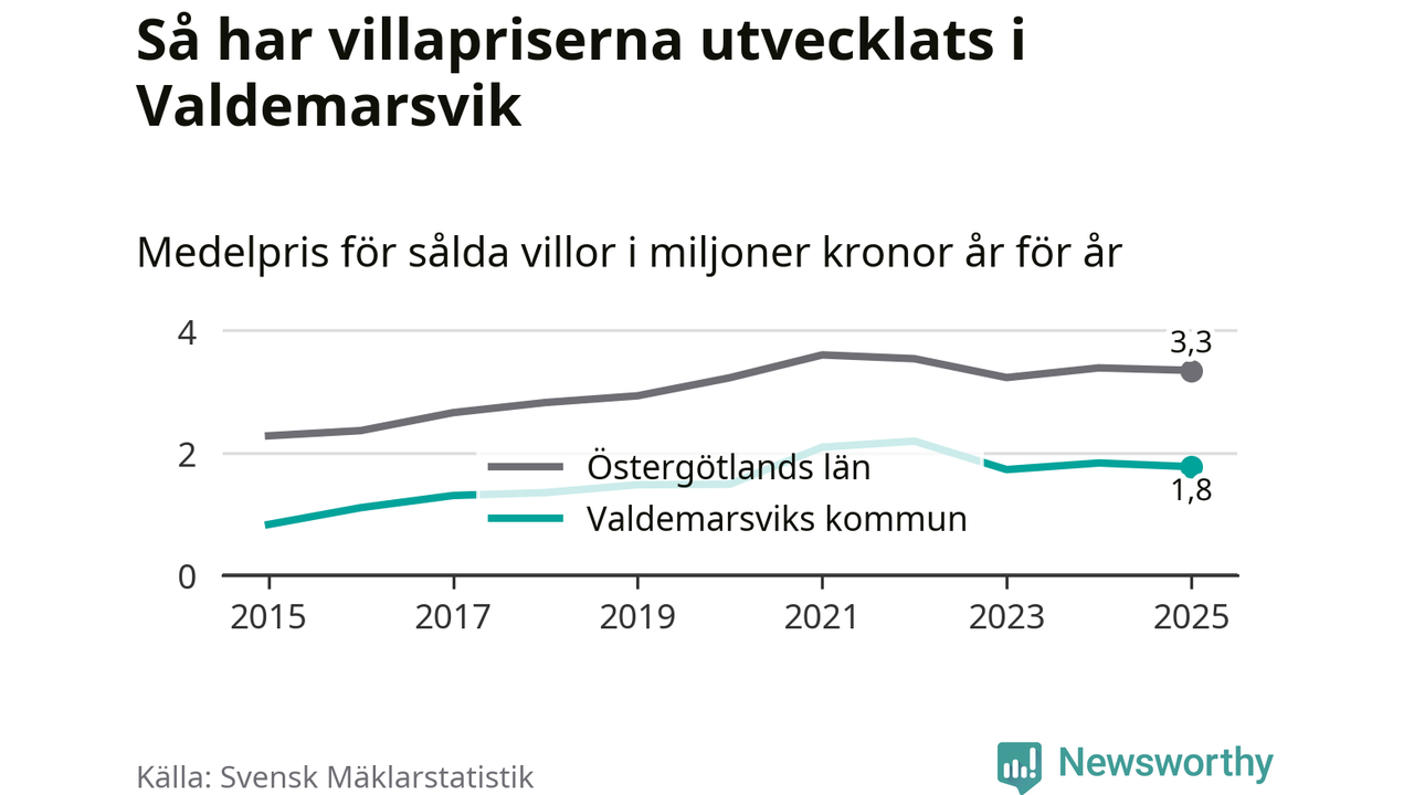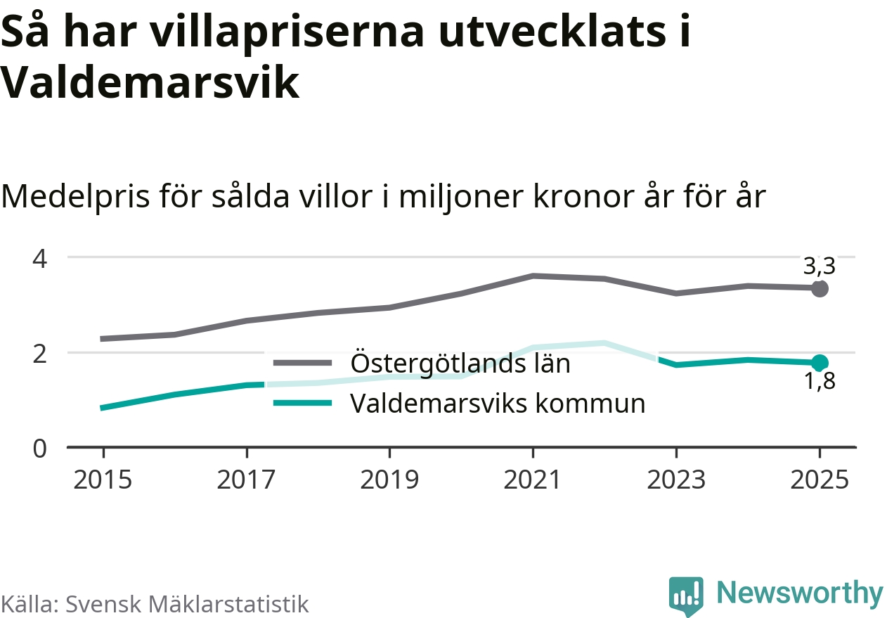 1,8 miljoner kronor är medelpriset för de villor som såldes i Valdemarsviks kommun under året, eller 16 081 kronor per kvadratmeter. Det innebär en prisminskning med tre procent på ett år.