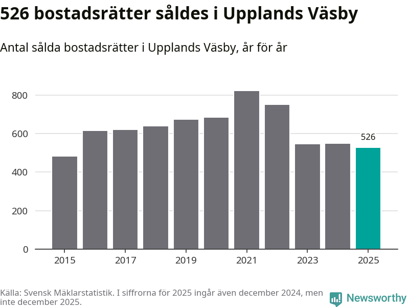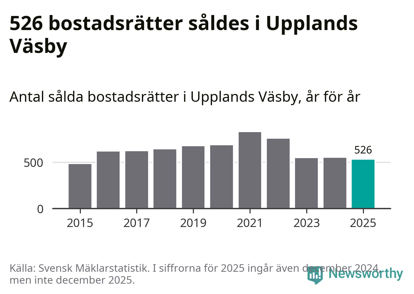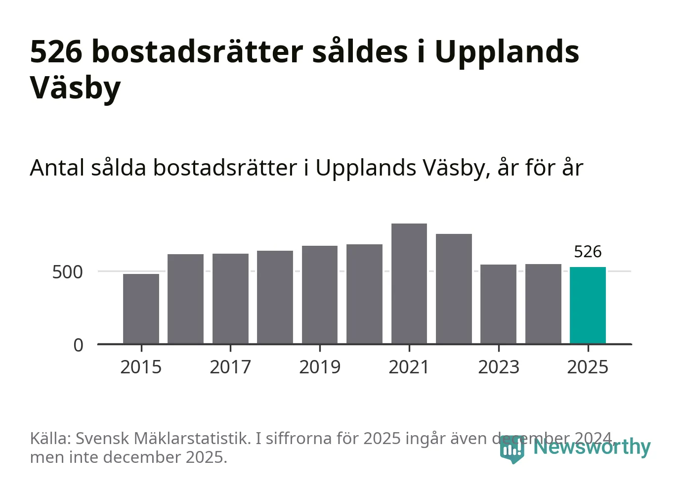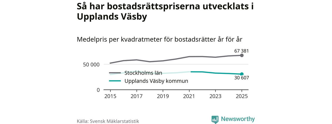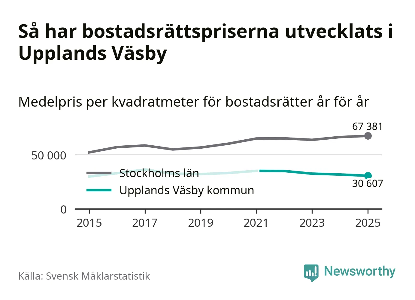 Det såldes totalt 526 bostadsrätter i Upplands Väsby kommun under året. Genomsnittspriset per kvadratmeter landade på 30 607 kronor. Det är en minskning med fyra procent i kommunen på ett år.