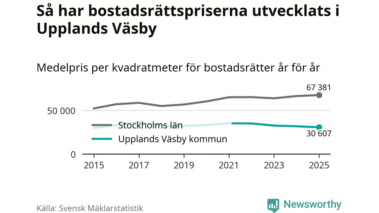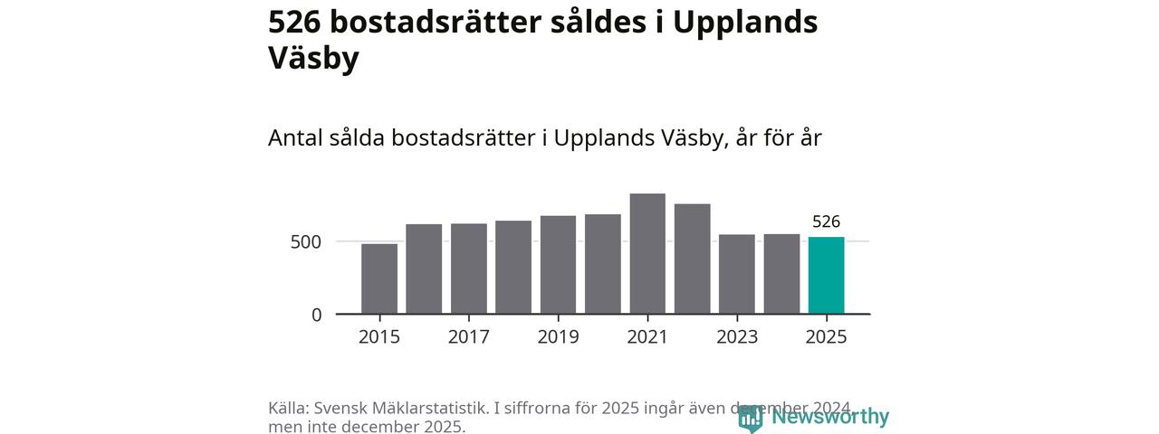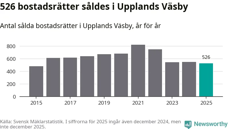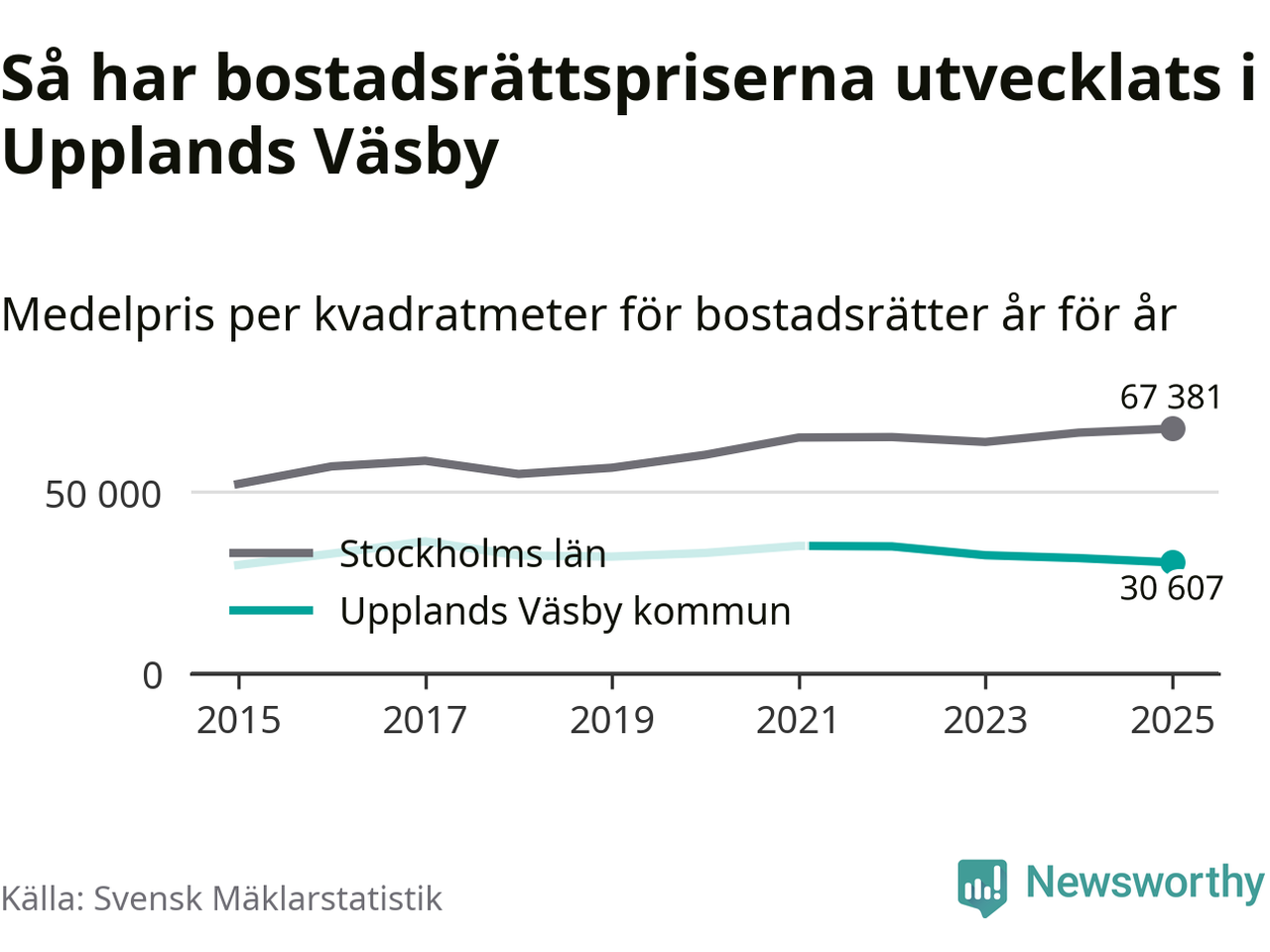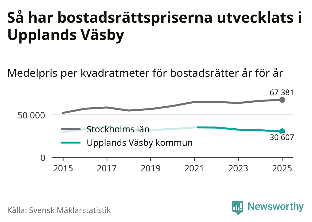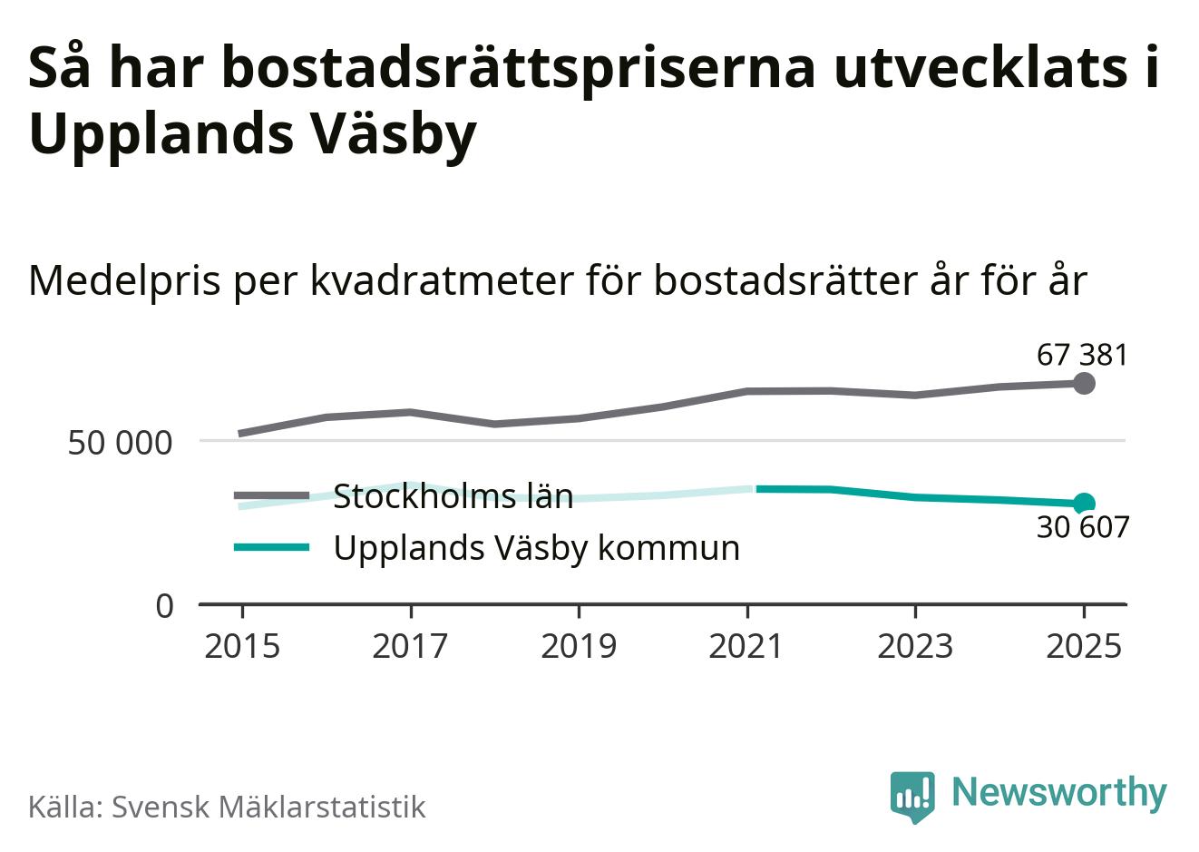 Det såldes totalt 526 bostadsrätter i Upplands Väsby kommun under året. Genomsnittspriset per kvadratmeter landade på 30 607 kronor. Det är en minskning med fyra procent i kommunen på ett år.