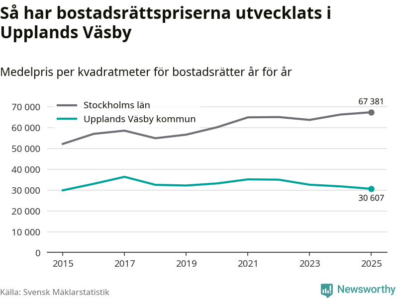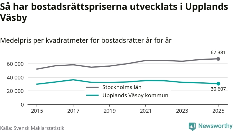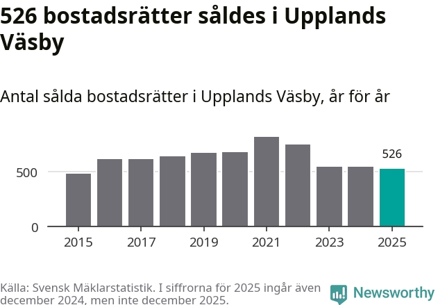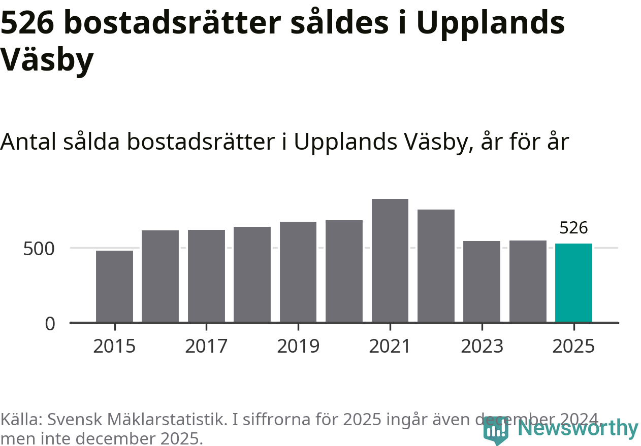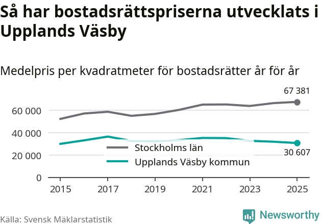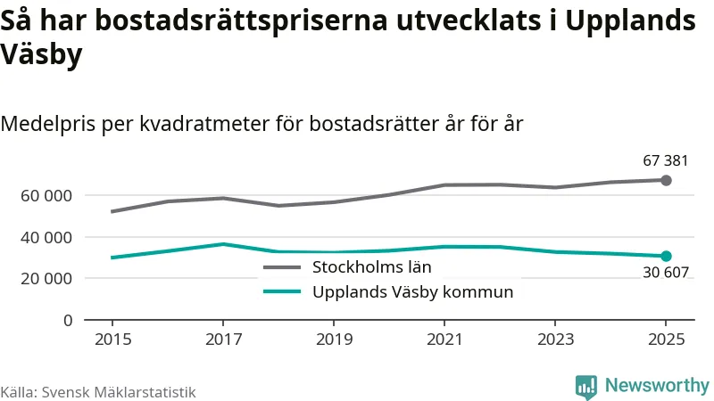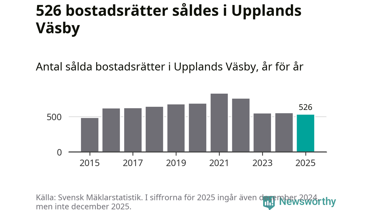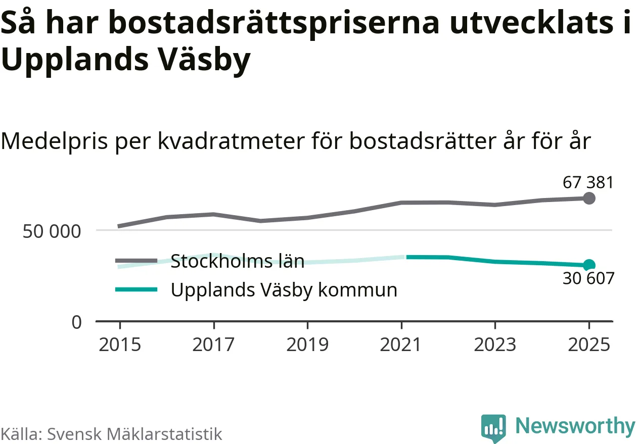 Det såldes totalt 526 bostadsrätter i Upplands Väsby kommun under året. Genomsnittspriset per kvadratmeter landade på 30 607 kronor. Det är en minskning med fyra procent i kommunen på ett år.