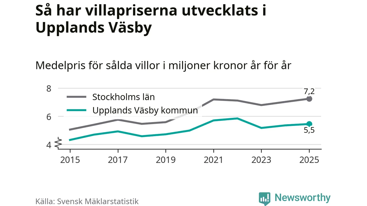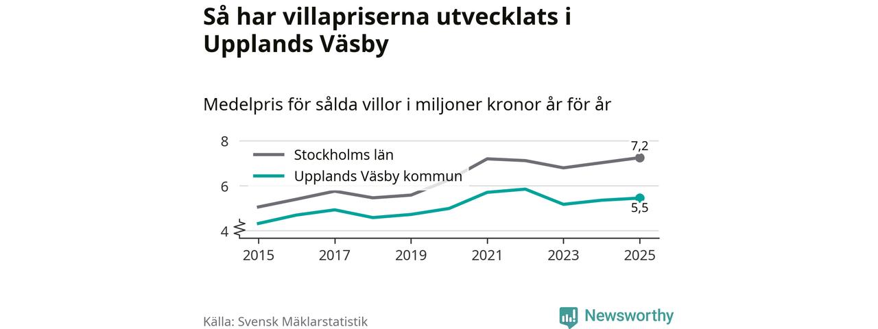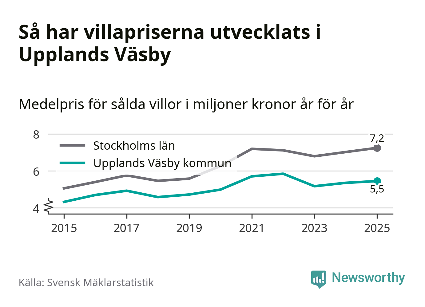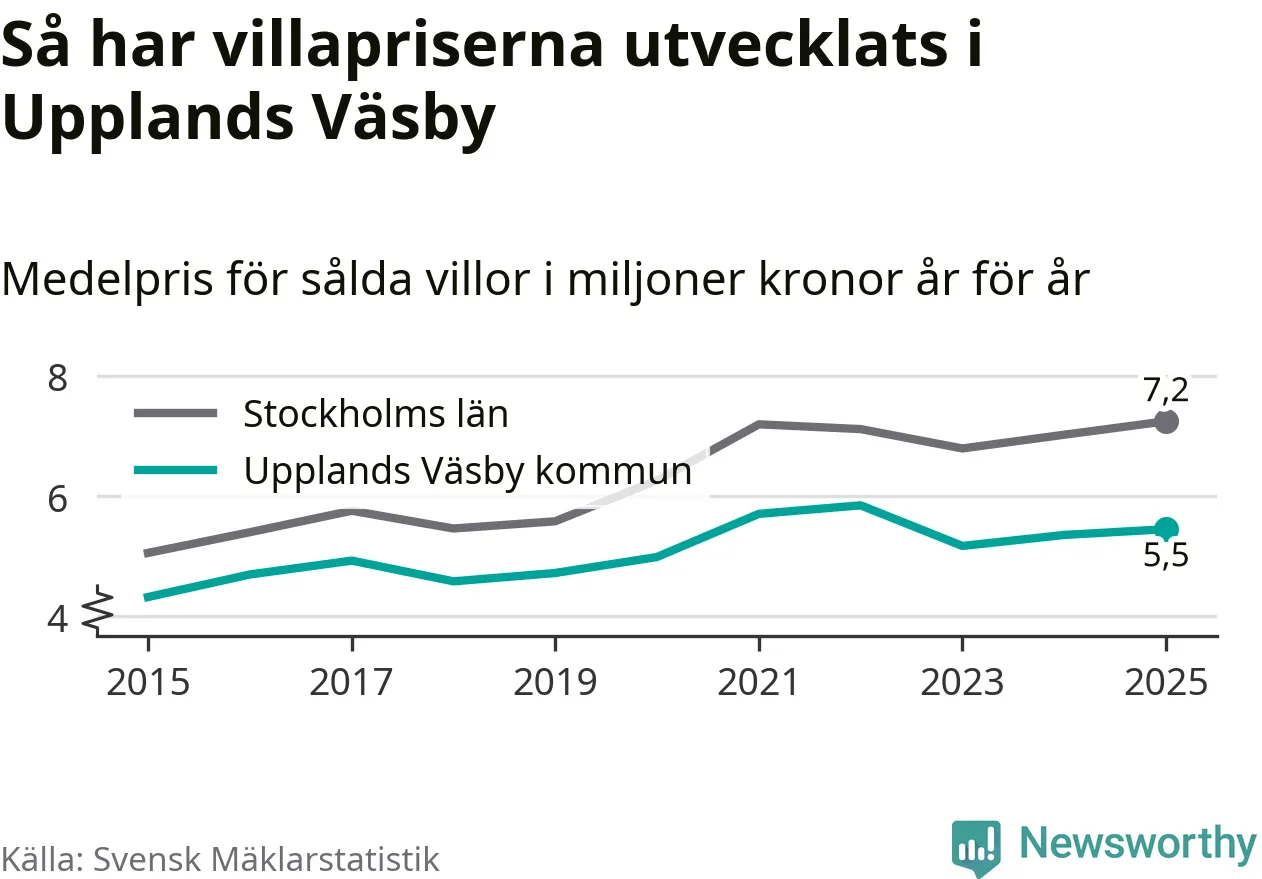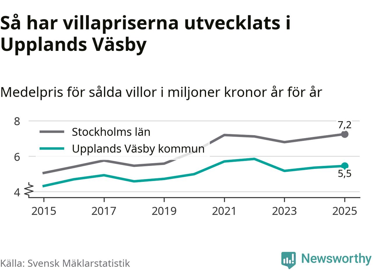 5,5 miljoner kronor är medelpriset för de villor som såldes i Upplands Väsby kommun under året, eller 40 808 kronor per kvadratmeter. Det innebär en prisökning med två procent på ett år och är andra året i rad som priserna ökar i kommunen.