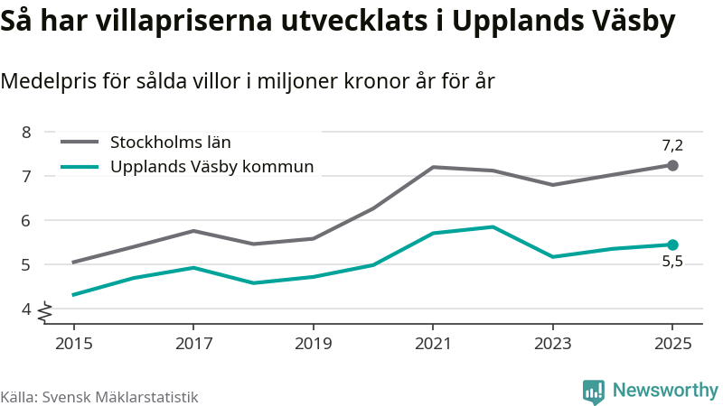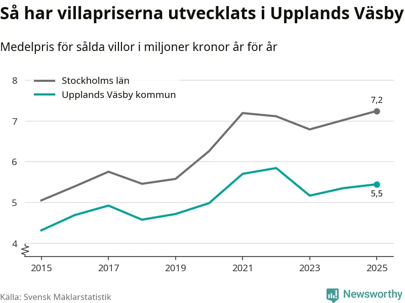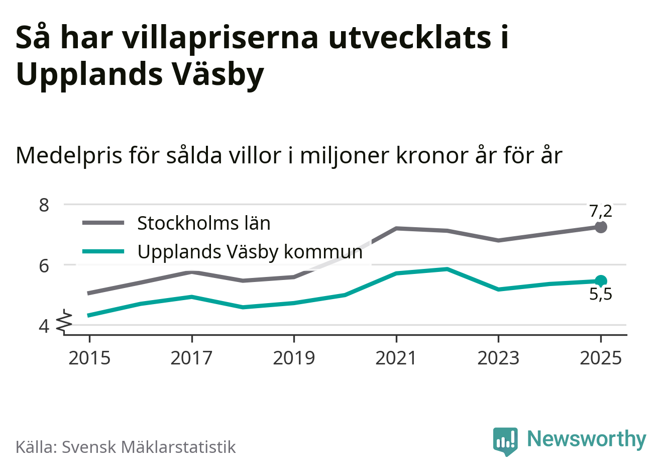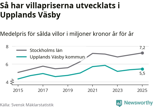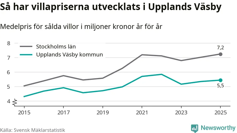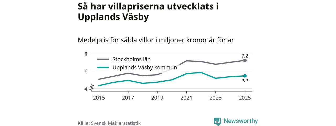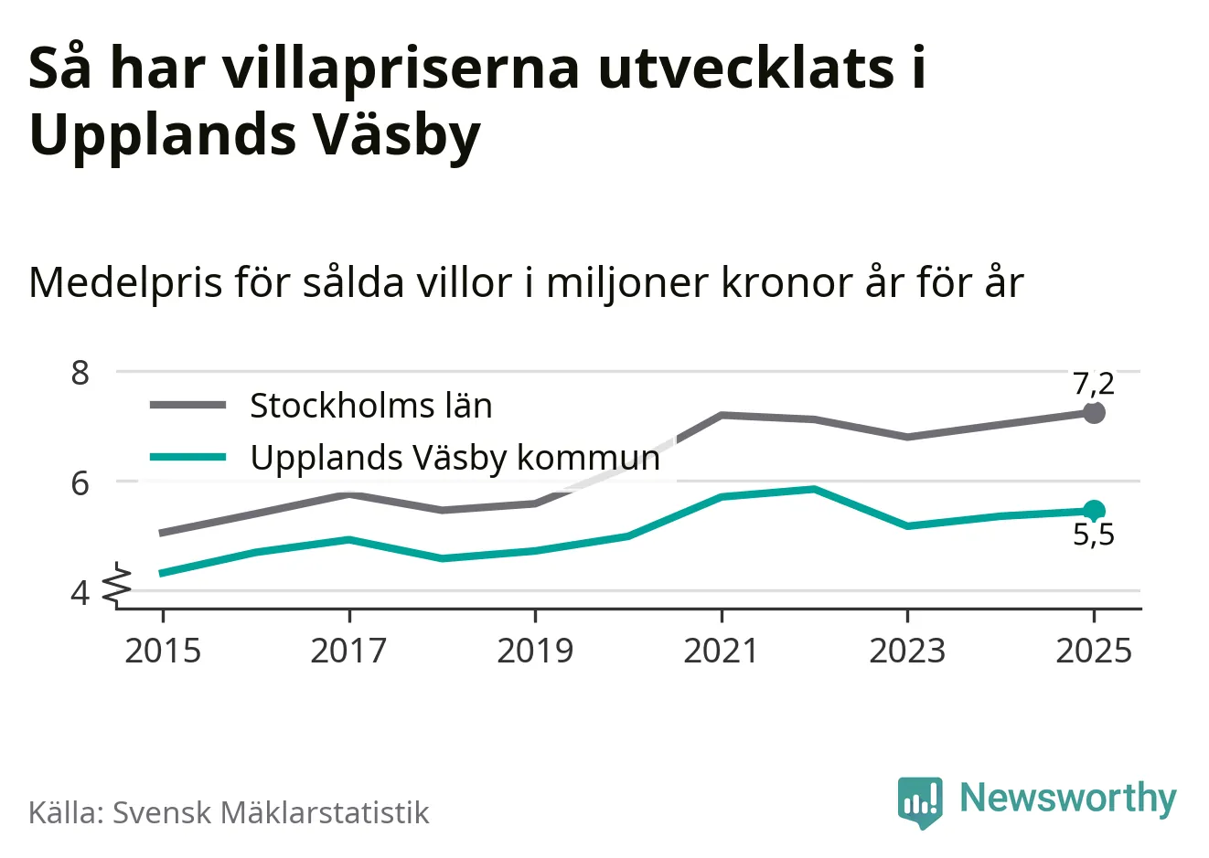 5,5 miljoner kronor är medelpriset för de villor som såldes i Upplands Väsby kommun under året, eller 40 808 kronor per kvadratmeter. Det innebär en prisökning med två procent på ett år och är andra året i rad som priserna ökar i kommunen.