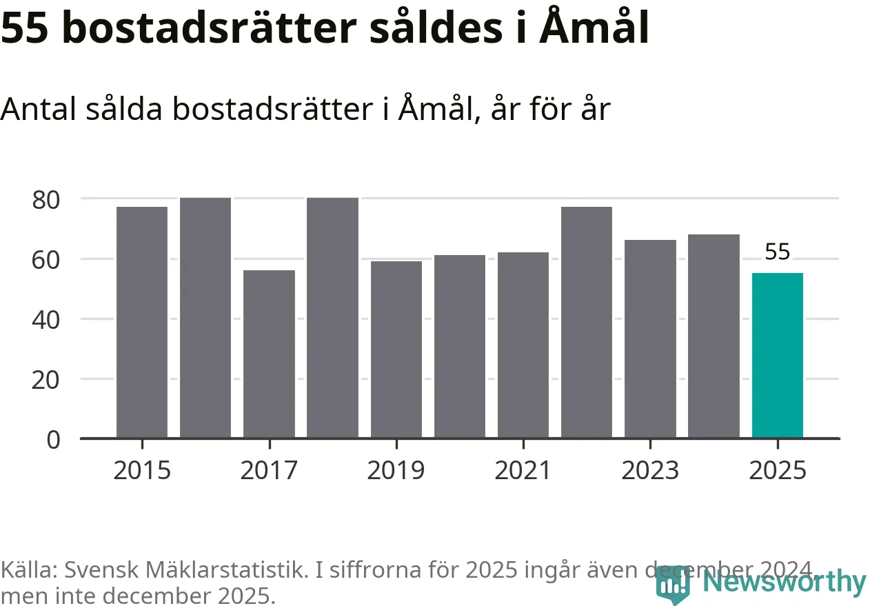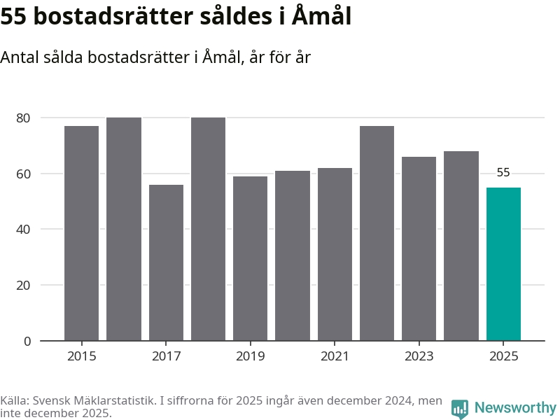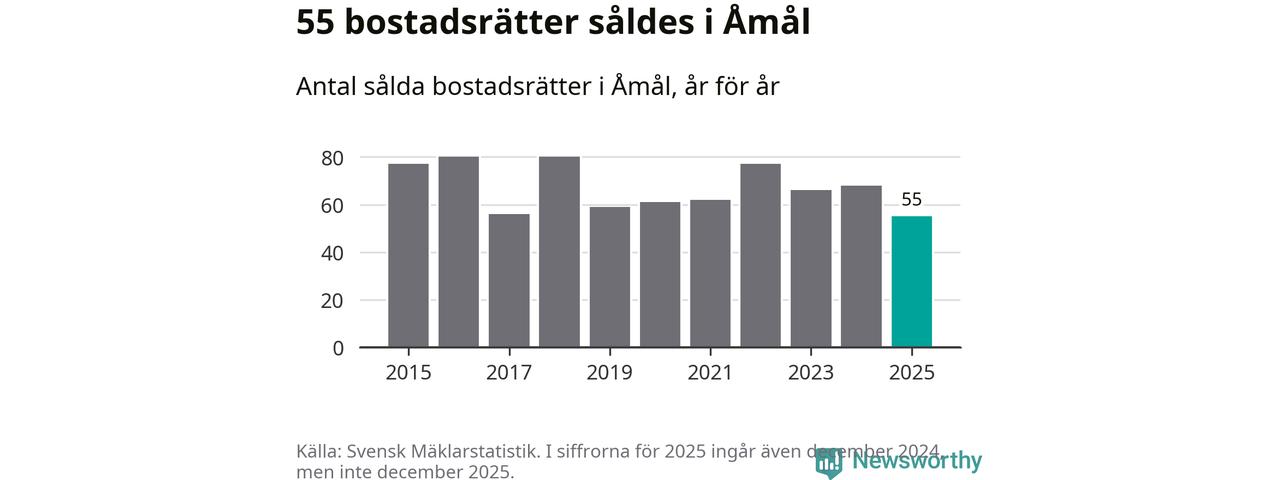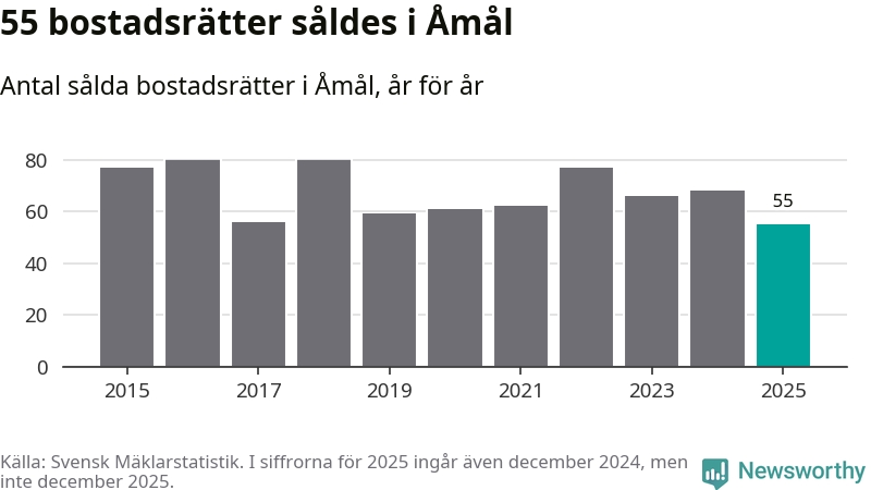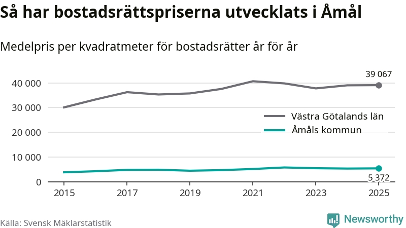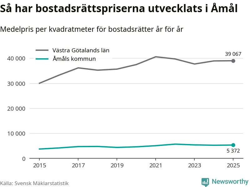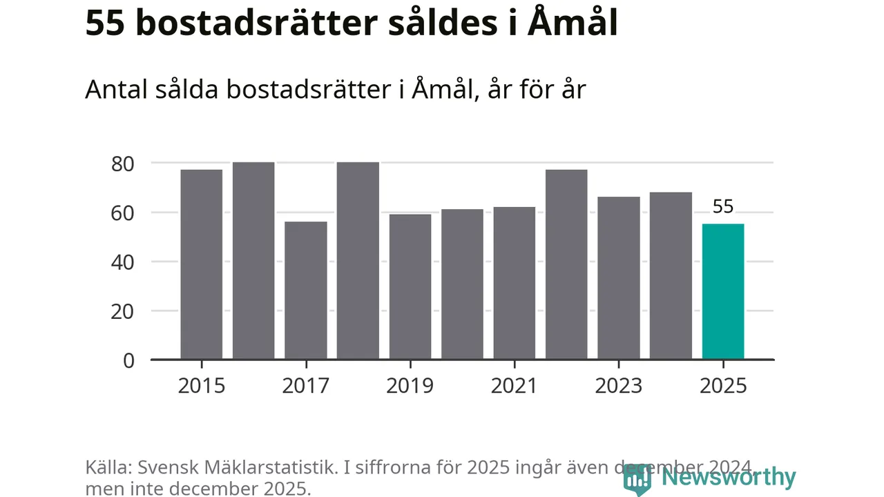Det såldes totalt 55 bostadsrätter i Åmåls kommun under året. Det är färre än något annat år sedan 2015. Genomsnittspriset per kvadratmeter landade på 5 372 kronor. Det är en ökning med en procent i kommunen på ett år.