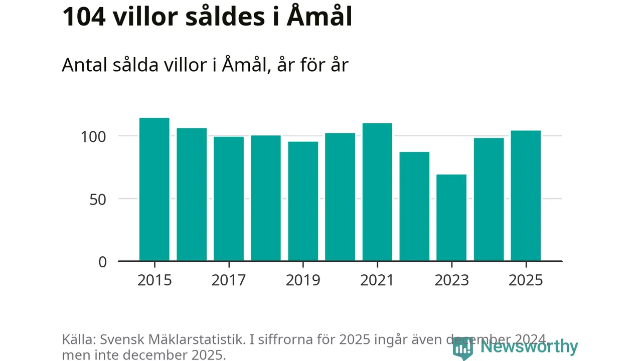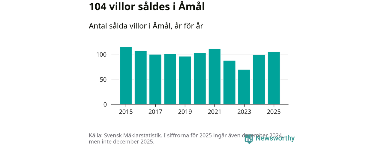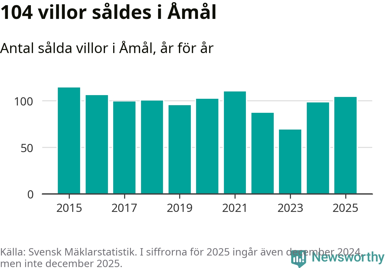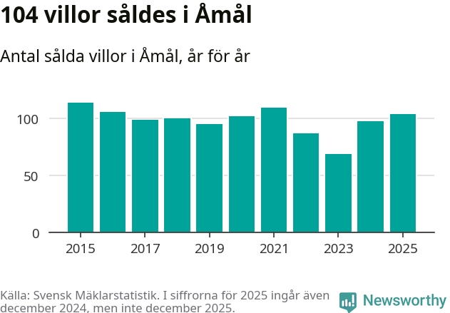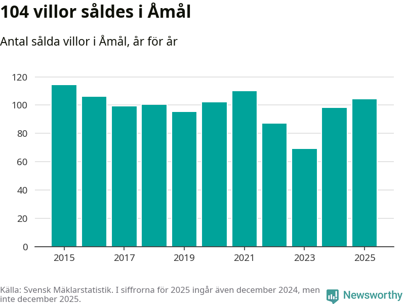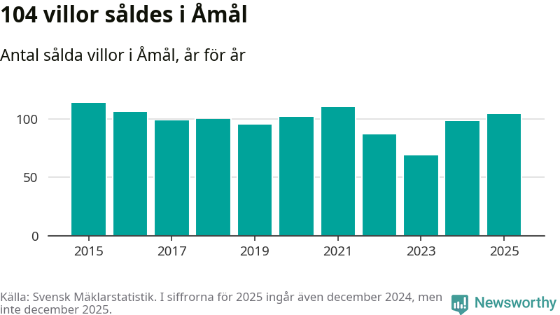Antalet sålda villor ökade också. Totalt såldes 104 villor, att jämföra med 98 under 2024. Det är andra året i rad som antalet sålda villor ökar i kommunen.