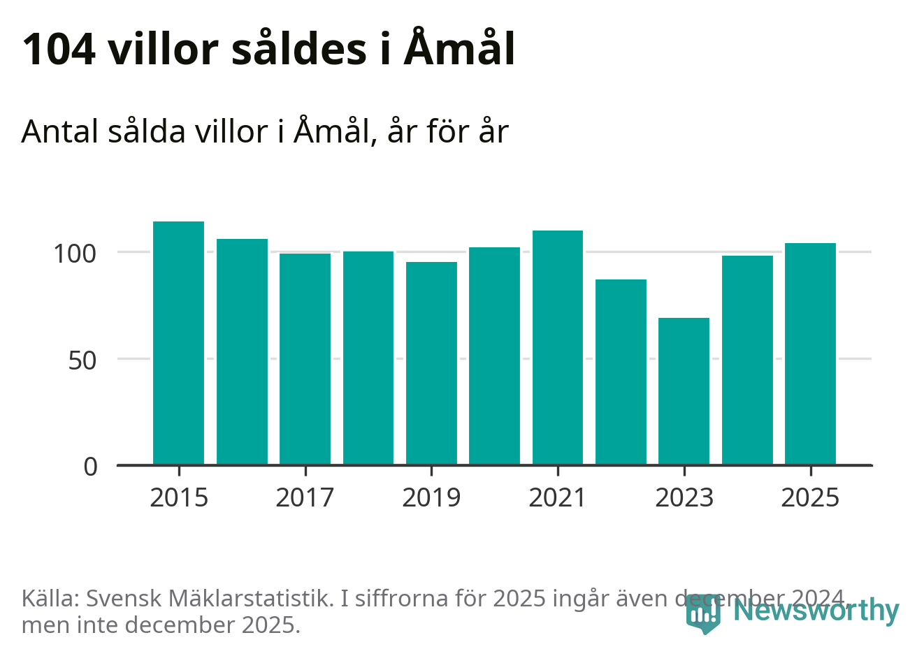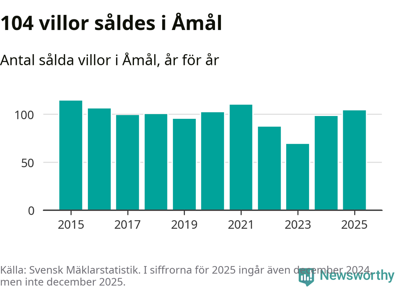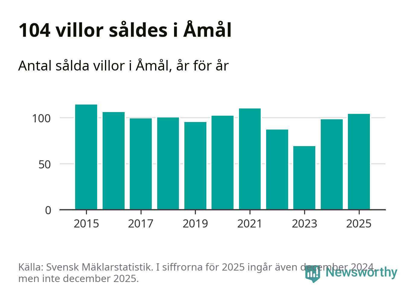 Antalet sålda villor ökade också. Totalt såldes 104 villor, att jämföra med 98 under 2024. Det är andra året i rad som antalet sålda villor ökar i kommunen.