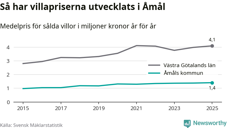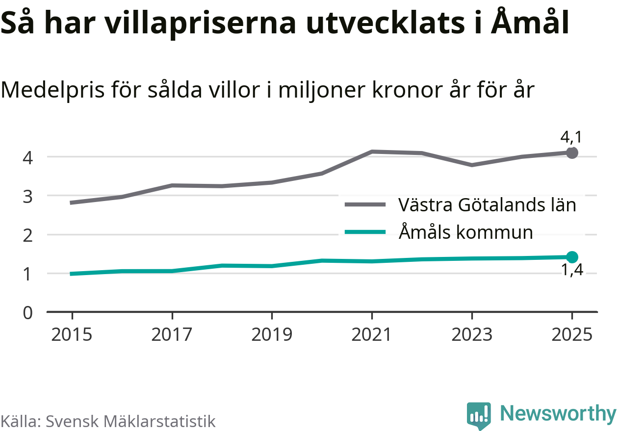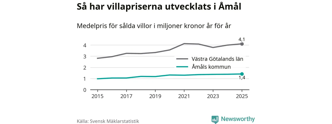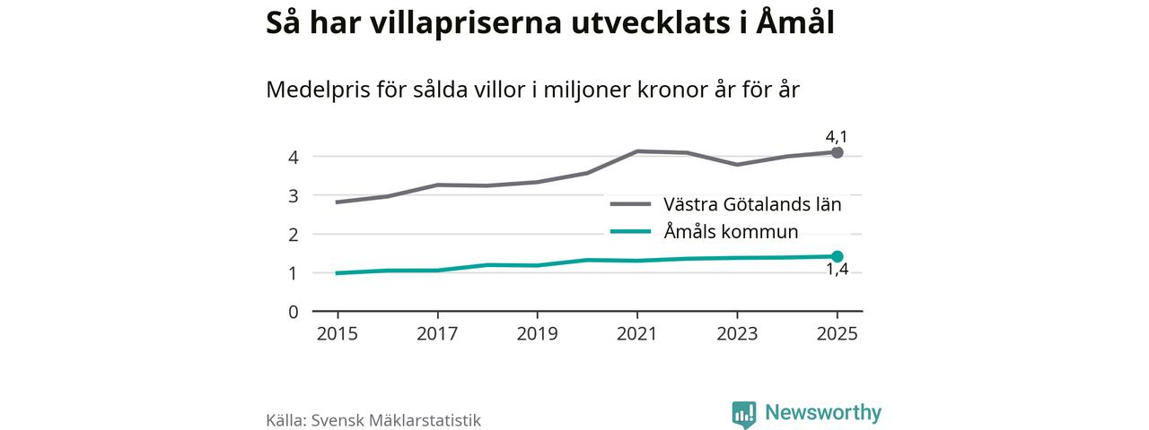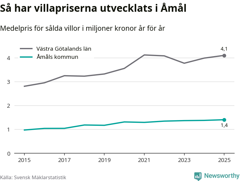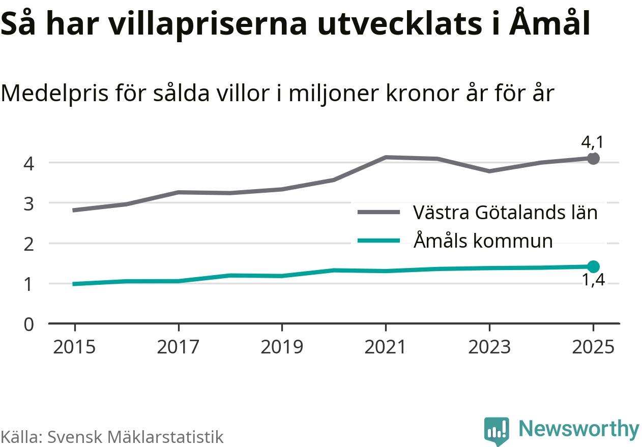 1,4 miljoner kronor är medelpriset för de villor som såldes i Åmåls kommun under året, eller 11 367 kronor per kvadratmeter. Det innebär en prisökning med två procent på ett år. Det är det högsta årssnittet på åtminstone tio år.
