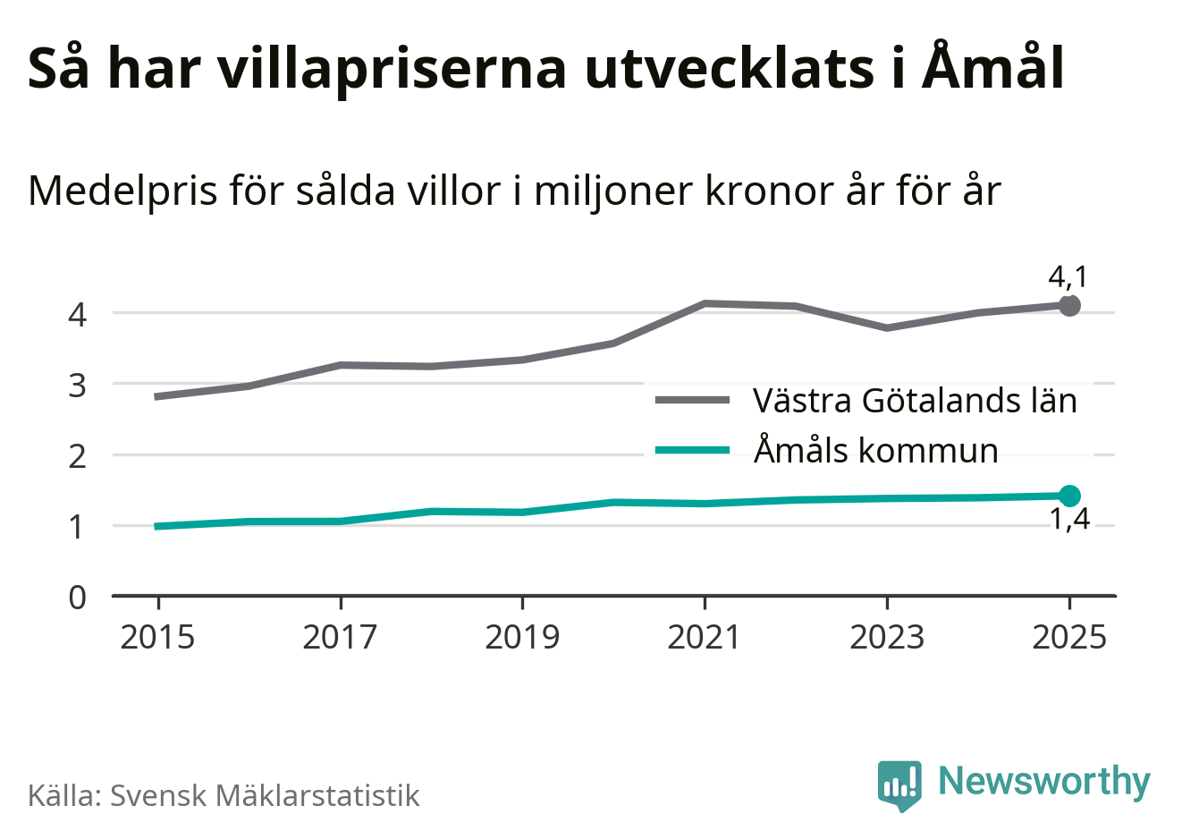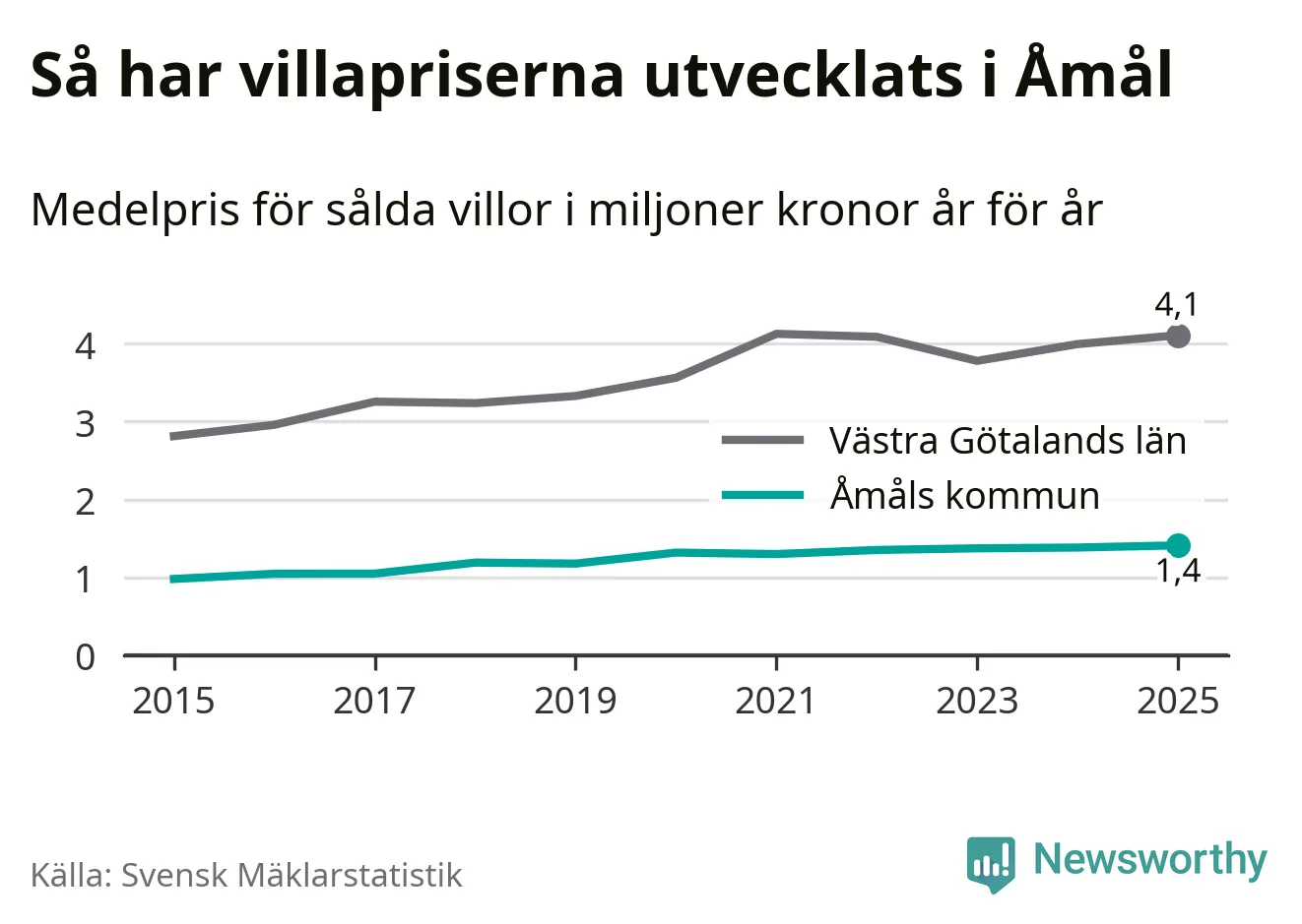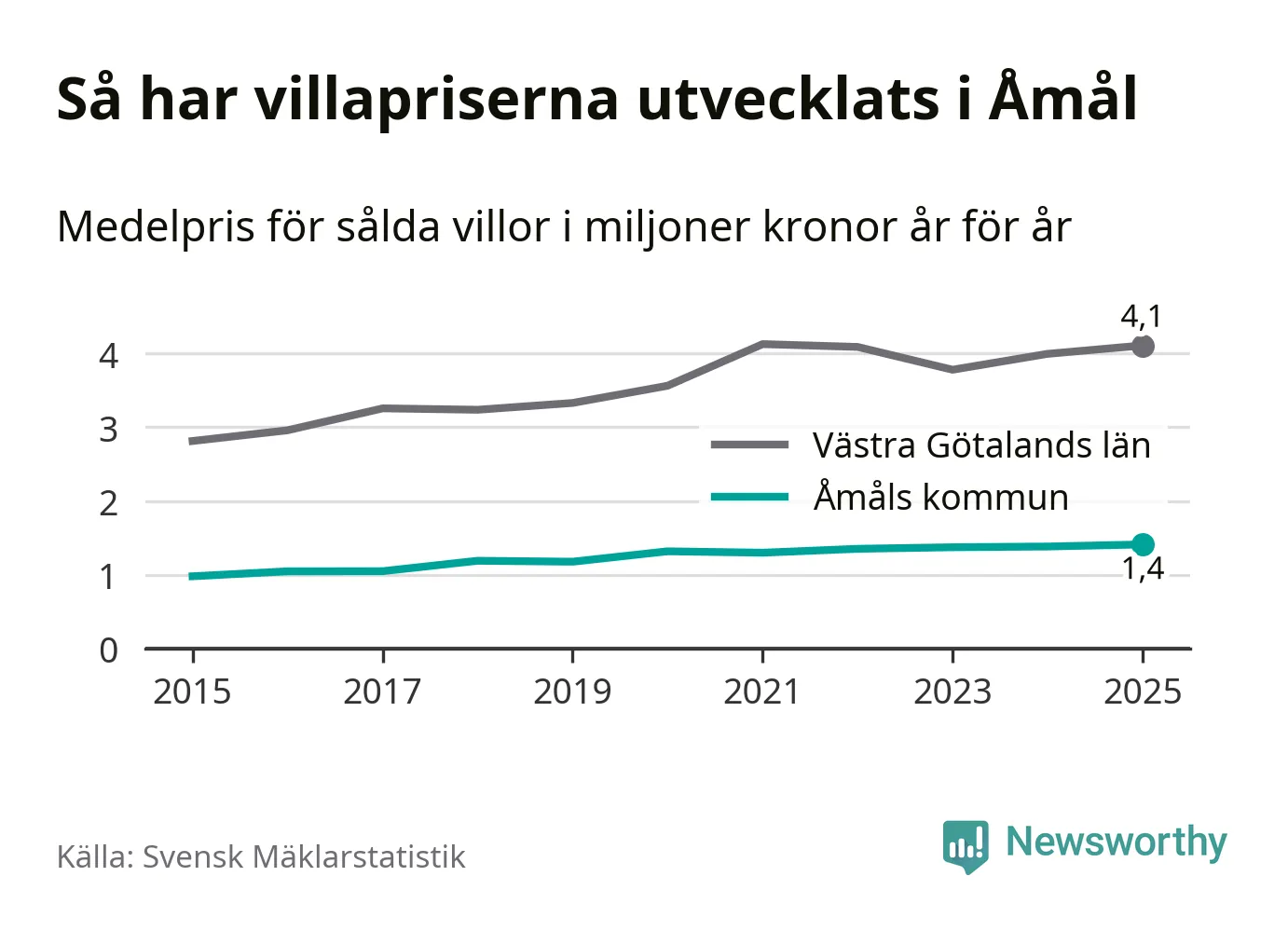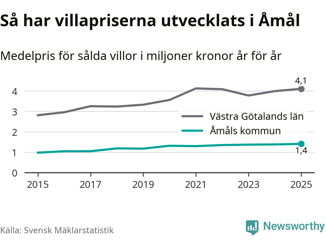 1,4 miljoner kronor är medelpriset för de villor som såldes i Åmåls kommun under året, eller 11 367 kronor per kvadratmeter. Det innebär en prisökning med två procent på ett år. Det är det högsta årssnittet på åtminstone tio år.