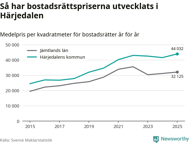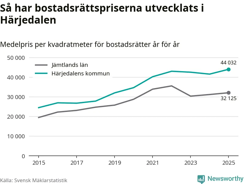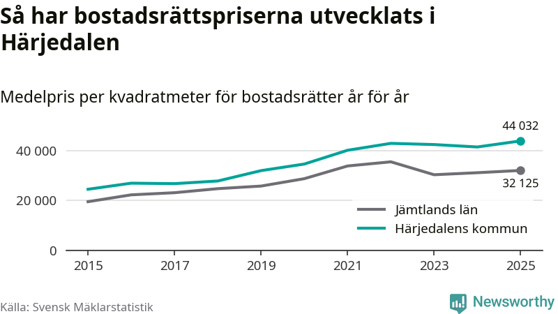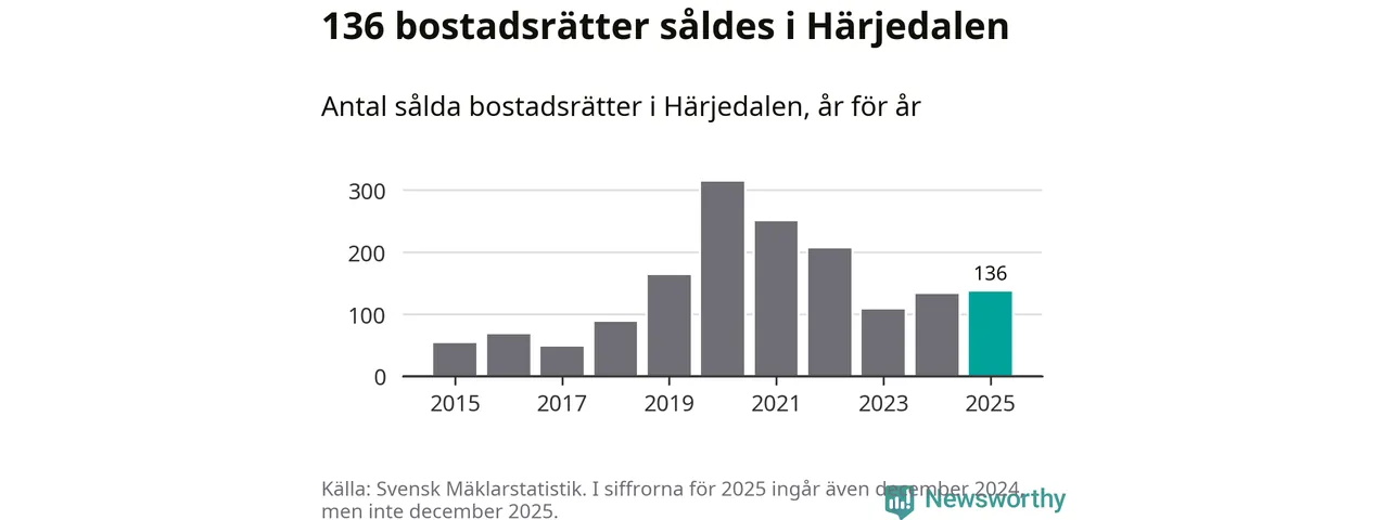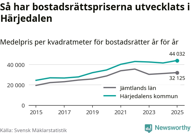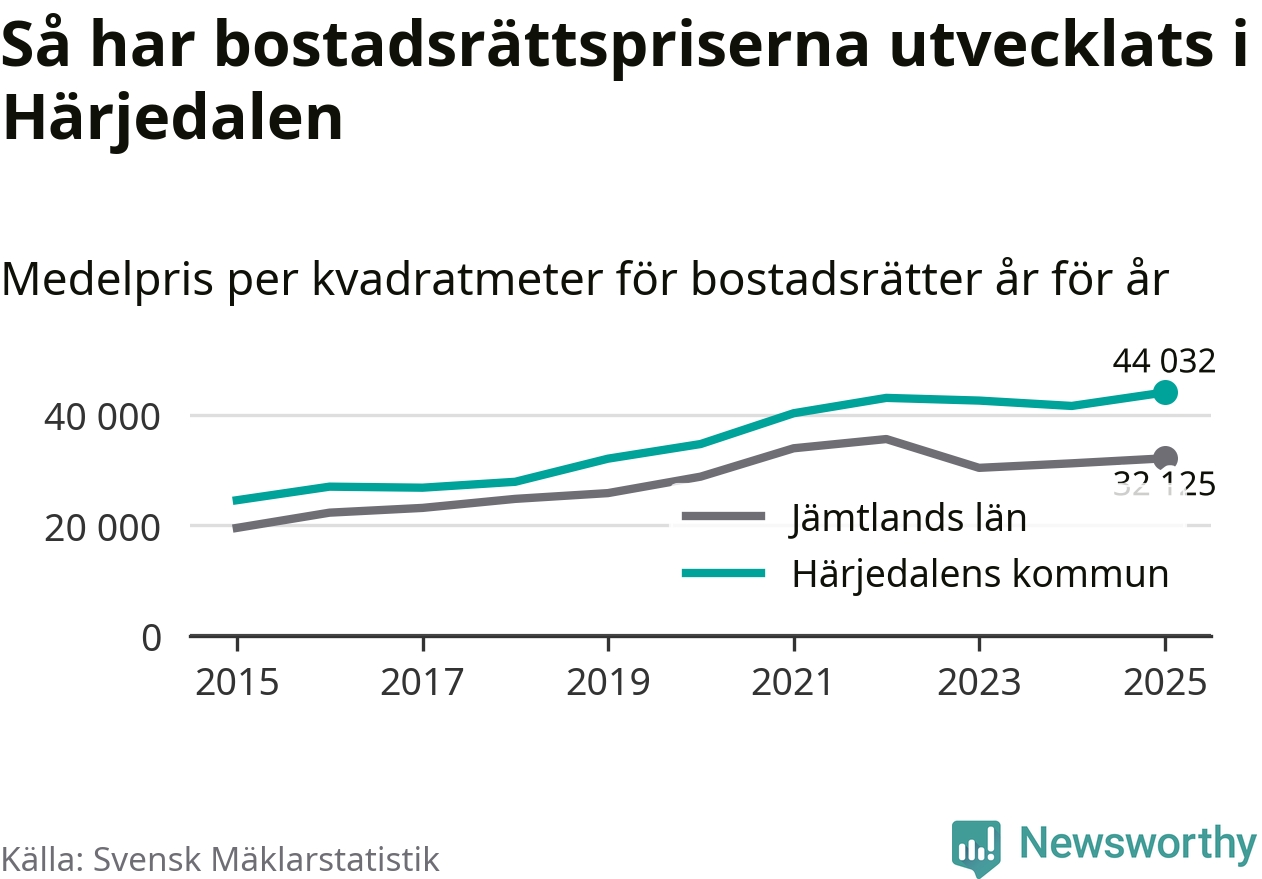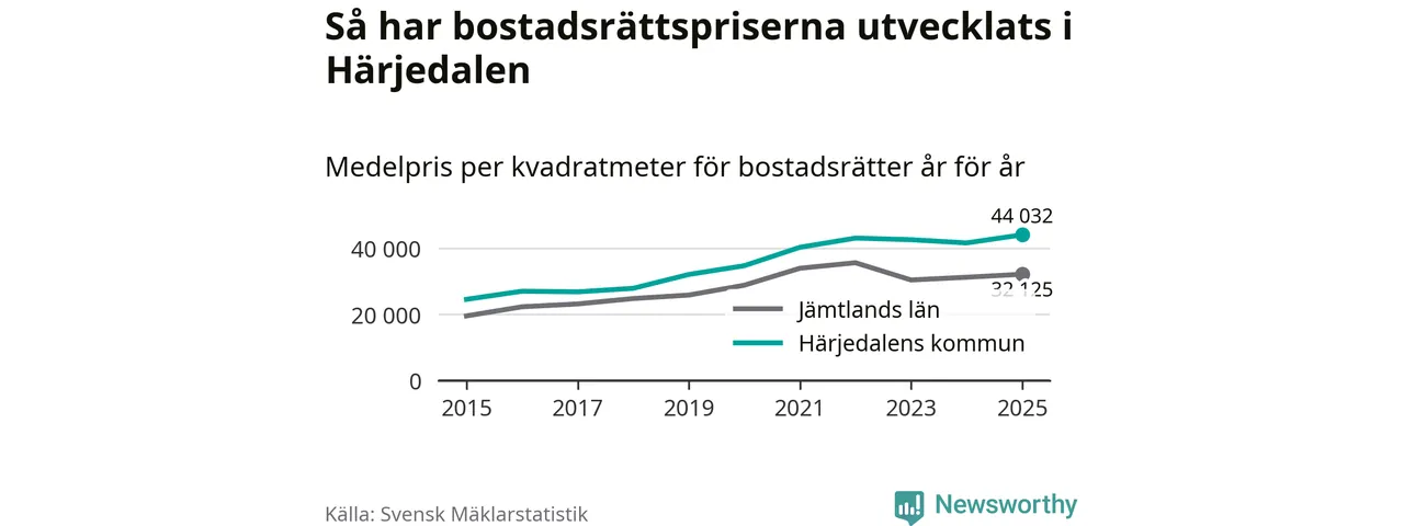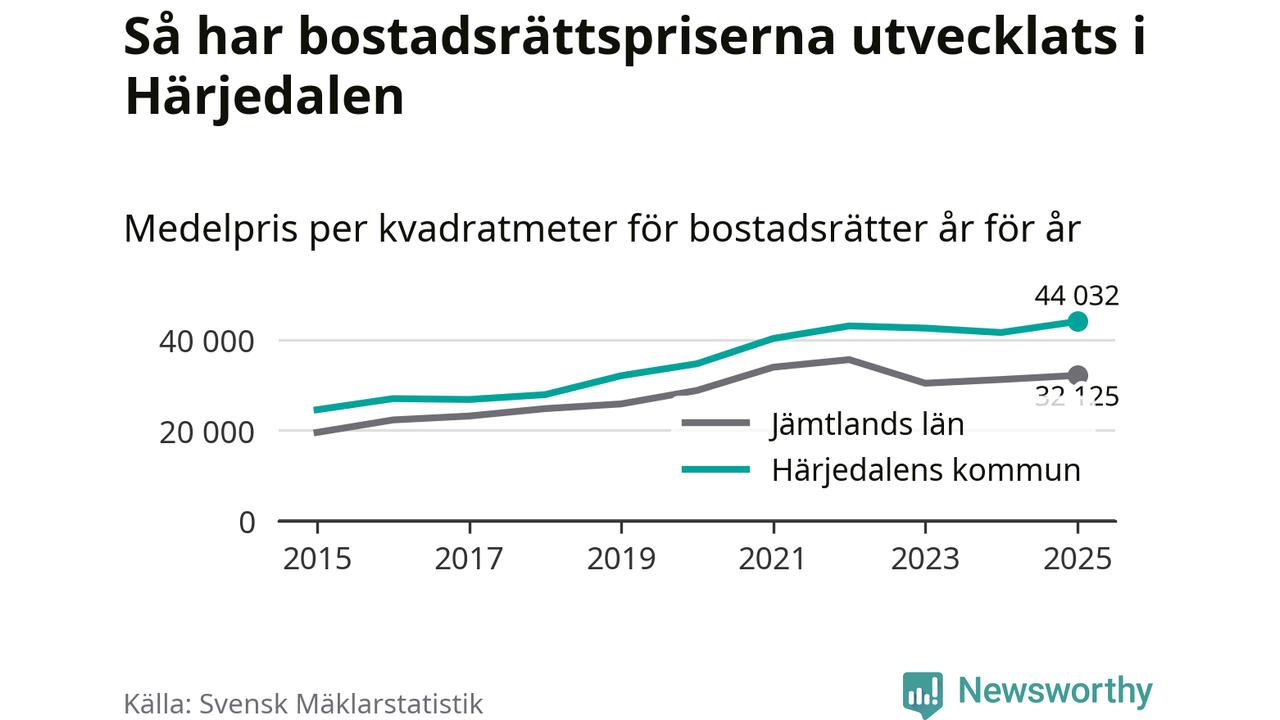 Det såldes totalt 136 bostadsrätter i Härjedalens kommun under året. Genomsnittspriset per kvadratmeter landade på 44 032 kronor. Det är en ökning med sex procent i kommunen på ett år och den högsta årsnivån på över ett decennium.