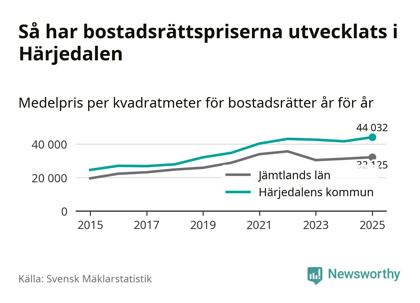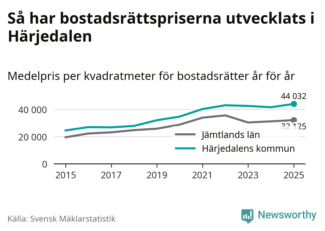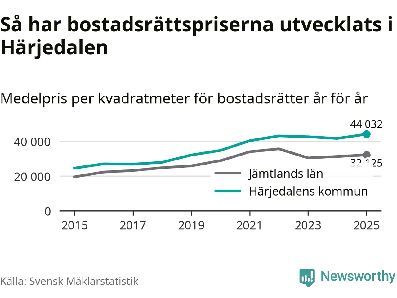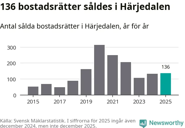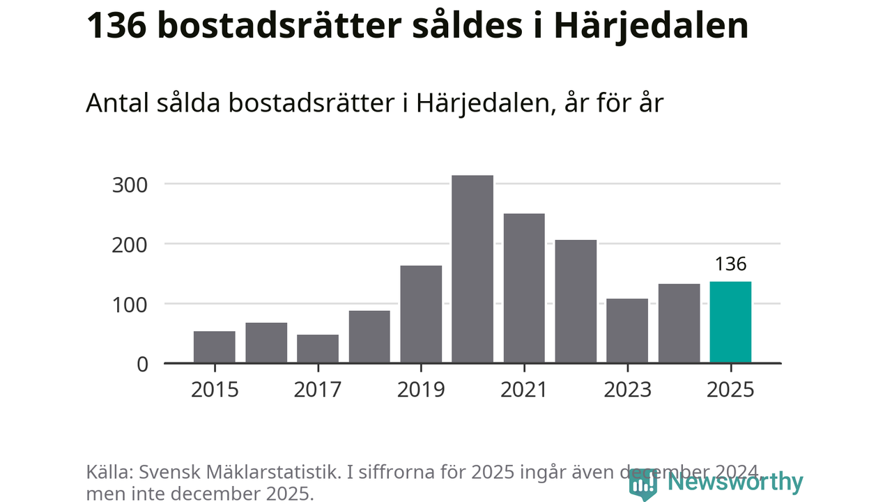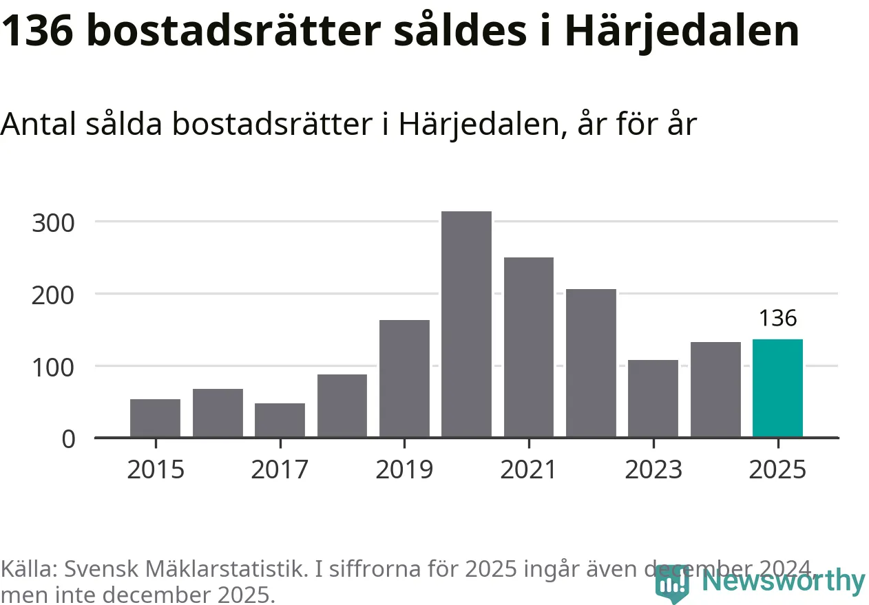Det såldes totalt 136 bostadsrätter i Härjedalens kommun under året. Genomsnittspriset per kvadratmeter landade på 44 032 kronor. Det är en ökning med sex procent i kommunen på ett år och den högsta årsnivån på över ett decennium.