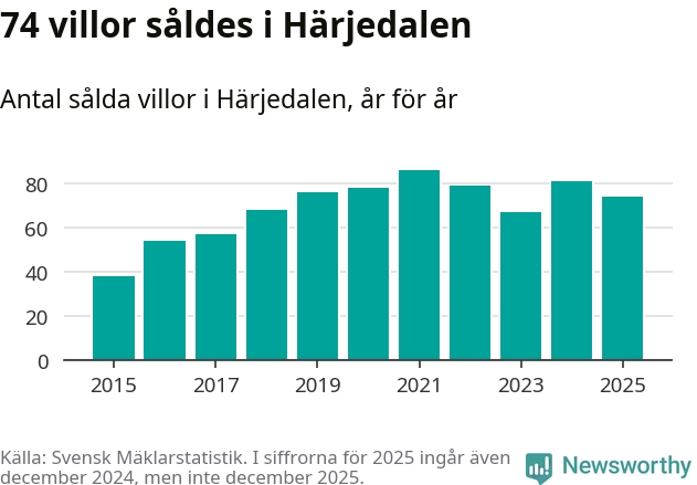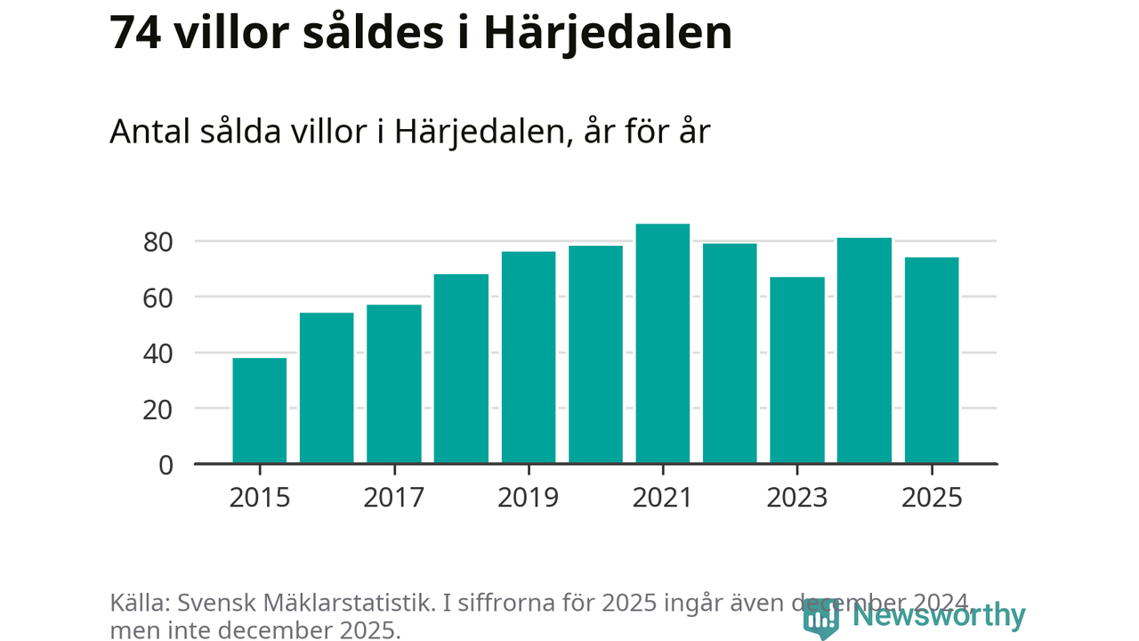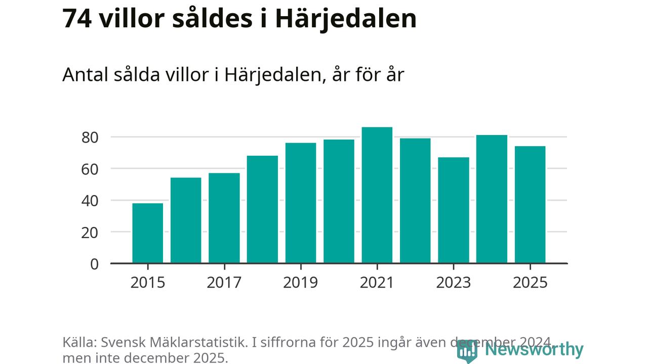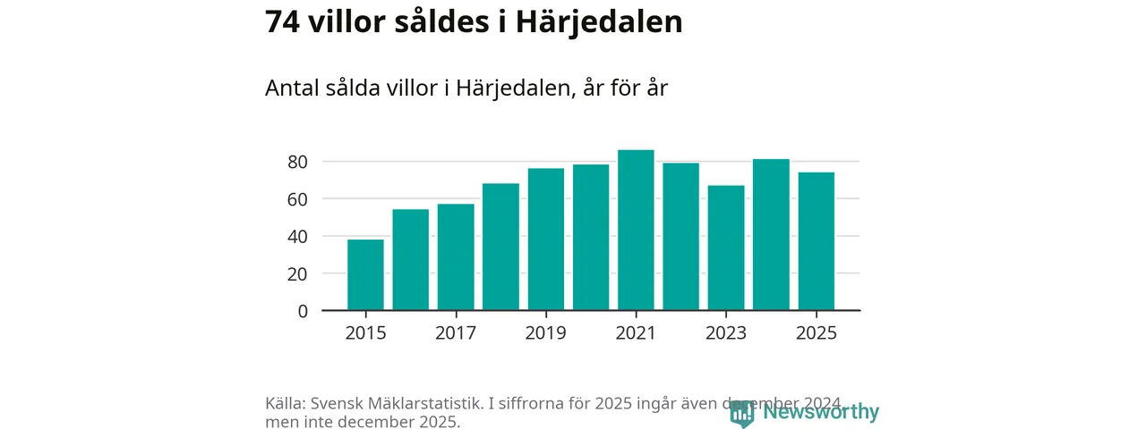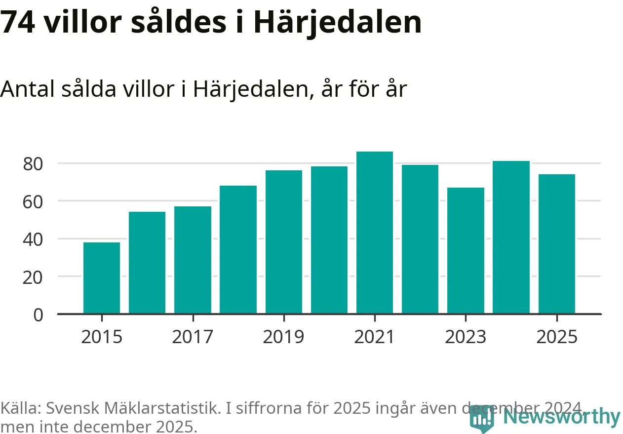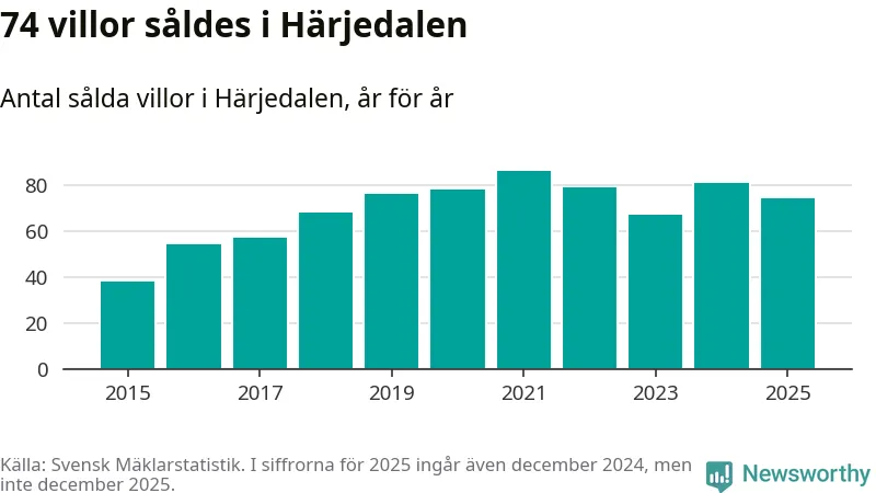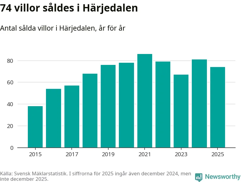 Däremot minskade antalet sålda villor. Totalt såldes 74 villor, att jämföra med 81 under 2024.