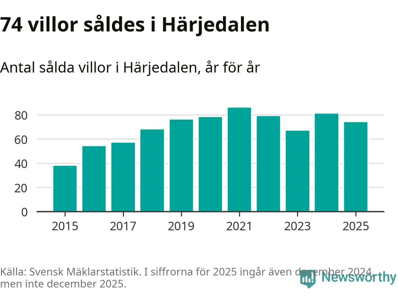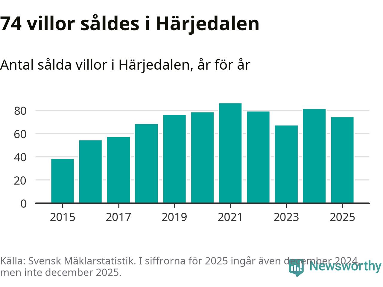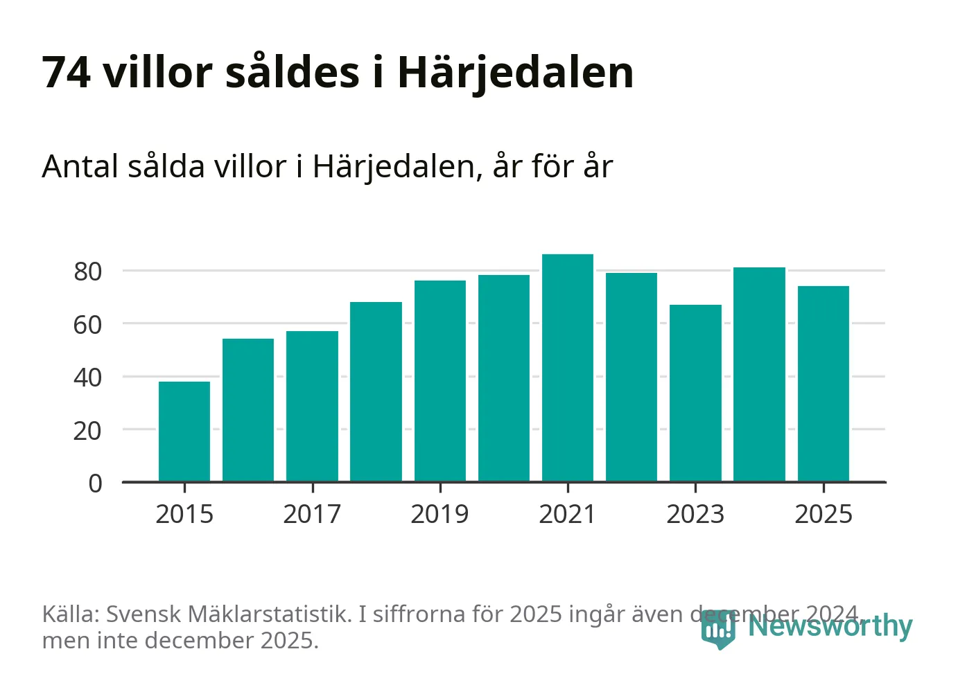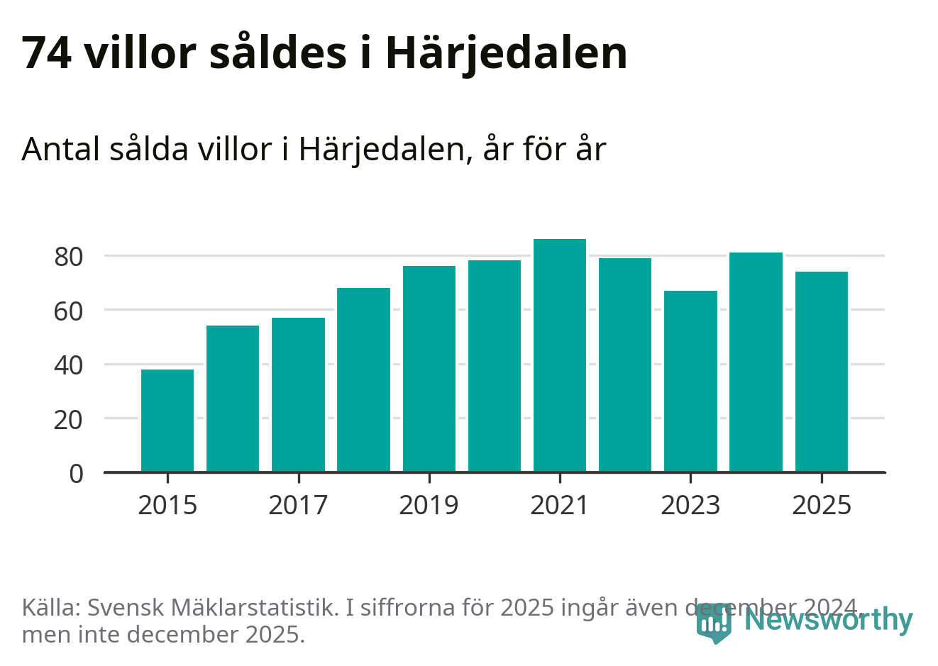 Däremot minskade antalet sålda villor. Totalt såldes 74 villor, att jämföra med 81 under 2024.