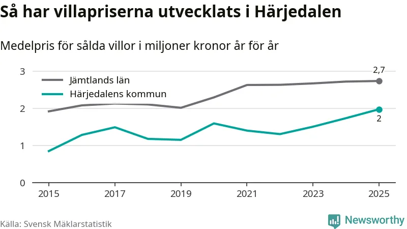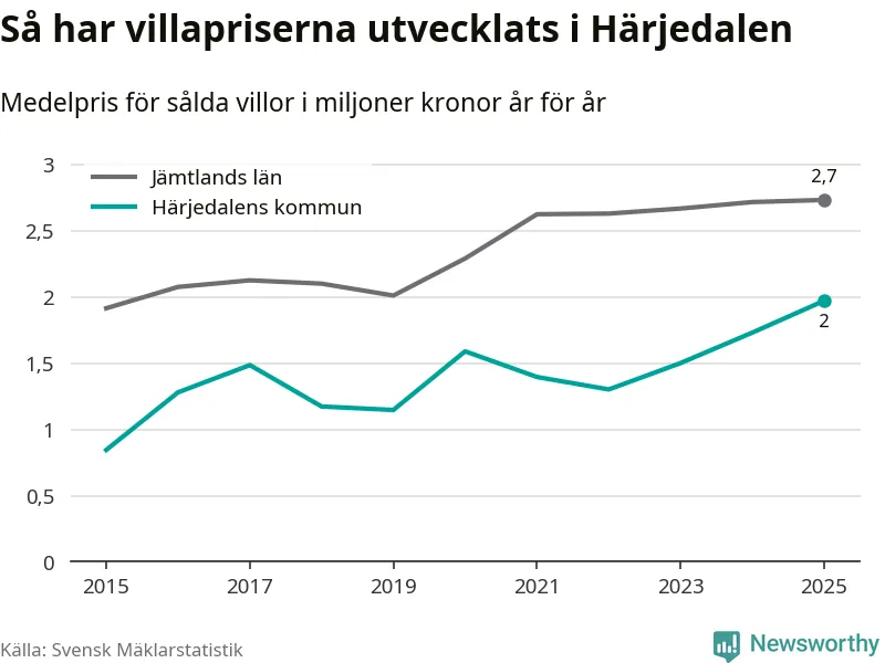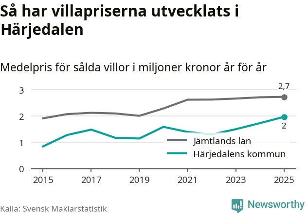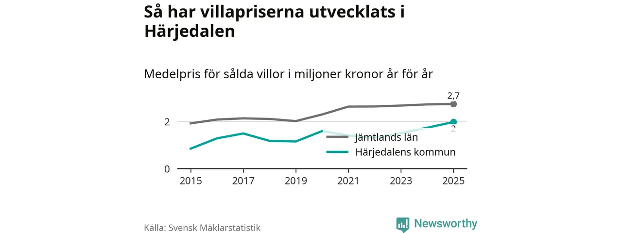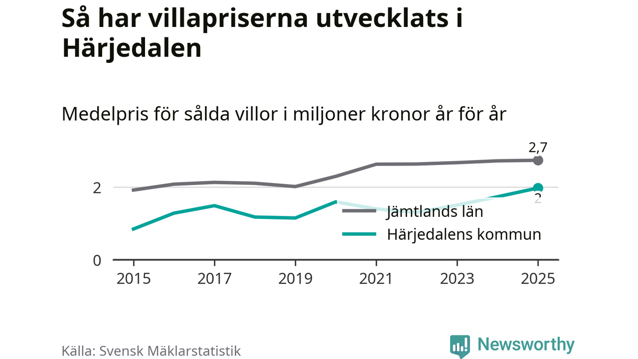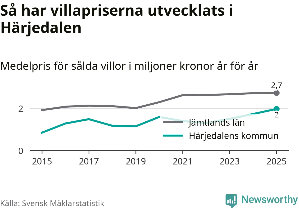 Två miljoner kronor är medelpriset för de villor som såldes i Härjedalens kommun under året, eller 17 208 kronor per kvadratmeter. Det innebär en prisökning med 14 procent på ett år. Det är det högsta årssnittet på åtminstone tio år. Bryter man upp siffrorna per kvartal har dock ännu högre villapriser noterats i Härjedalen vintern 2024/25.
