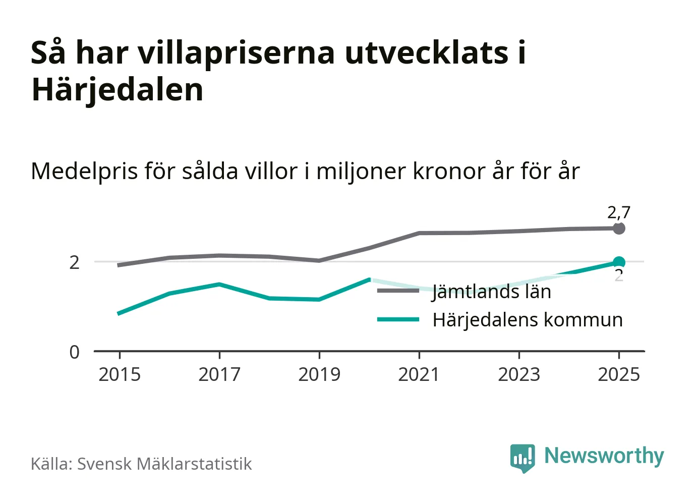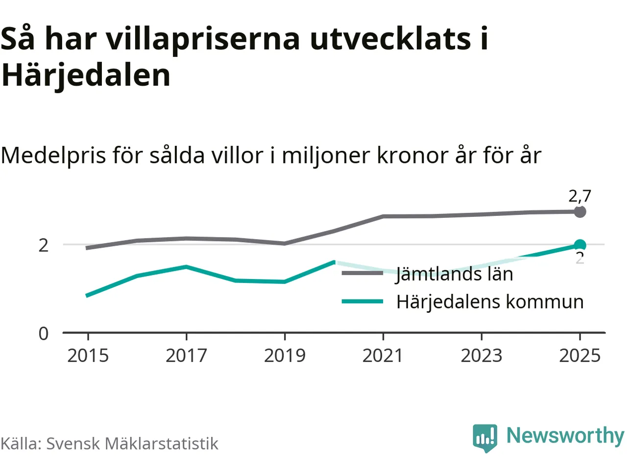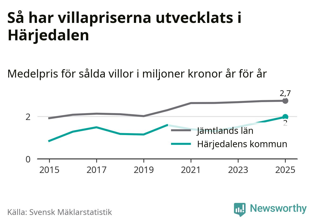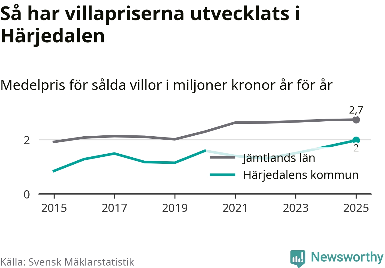 Två miljoner kronor är medelpriset för de villor som såldes i Härjedalens kommun under året, eller 17 208 kronor per kvadratmeter. Det innebär en prisökning med 14 procent på ett år. Det är det högsta årssnittet på åtminstone tio år. Bryter man upp siffrorna per kvartal har dock ännu högre villapriser noterats i Härjedalen vintern 2024/25.
