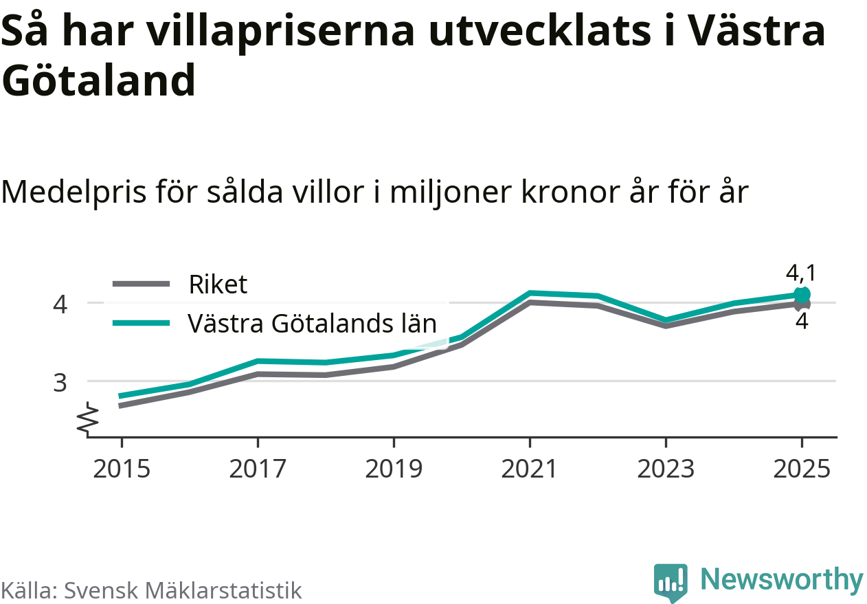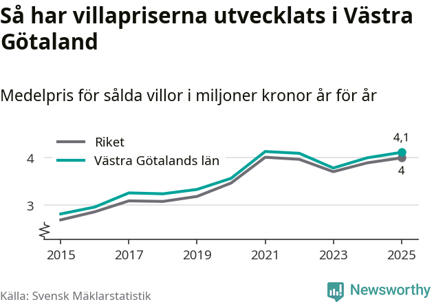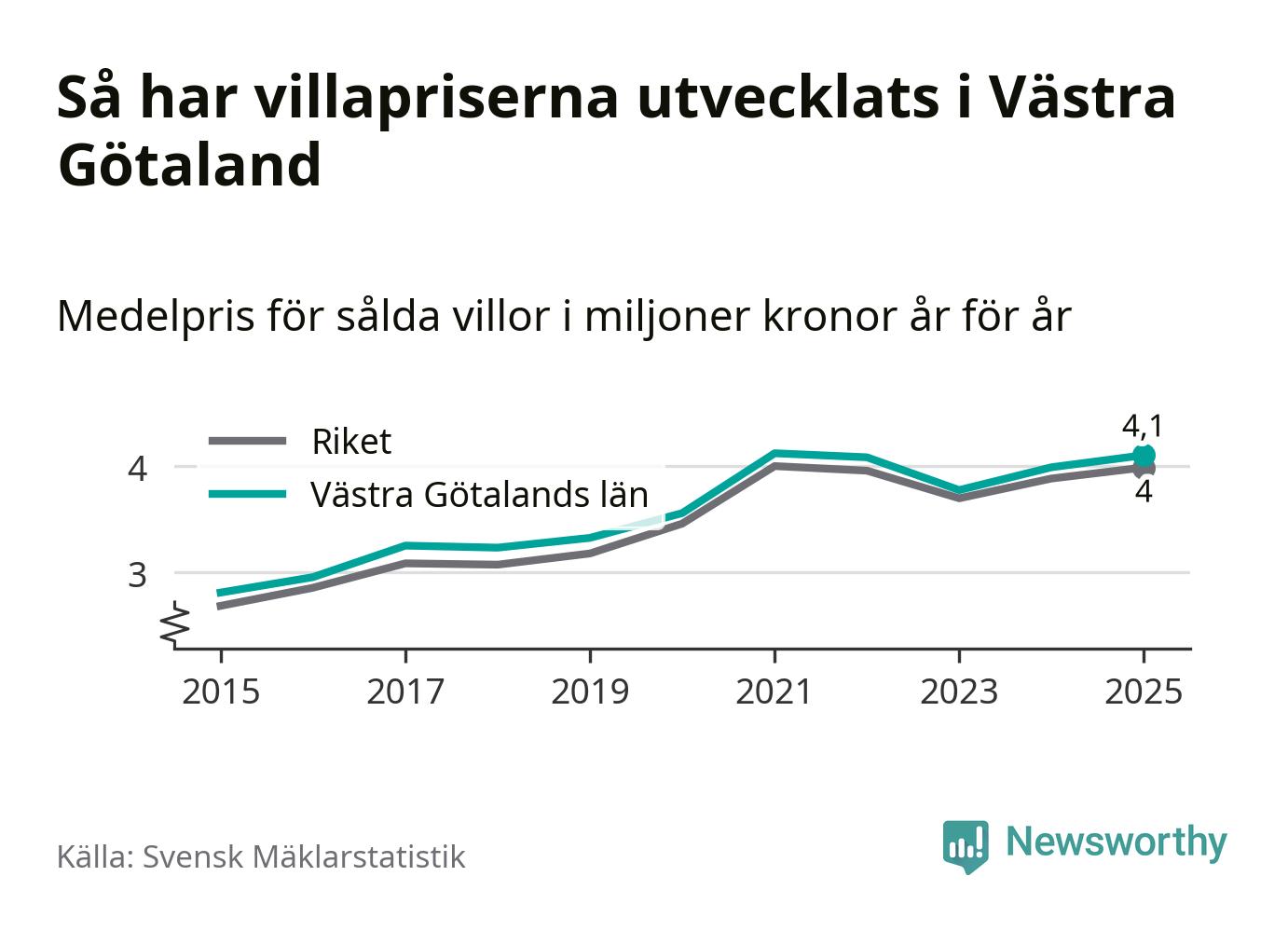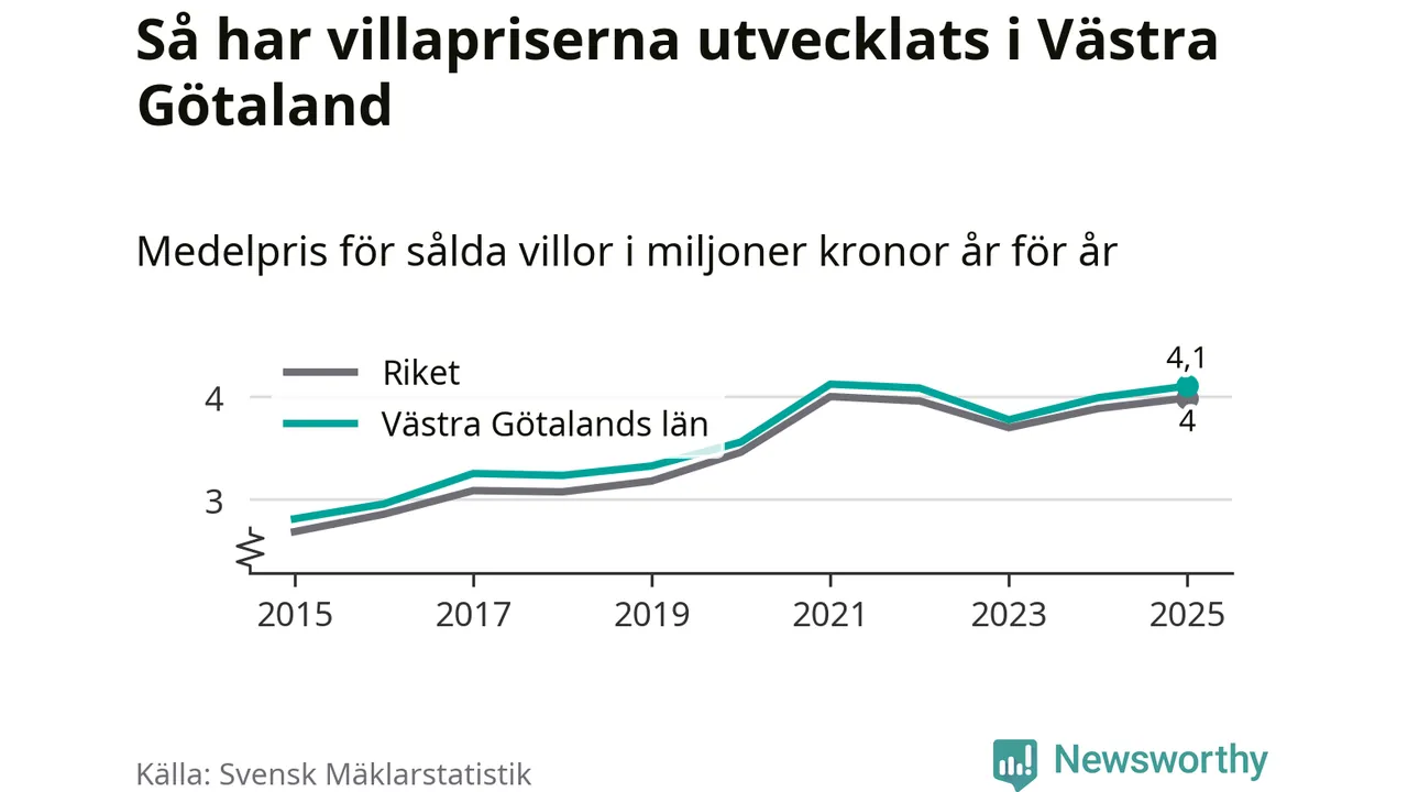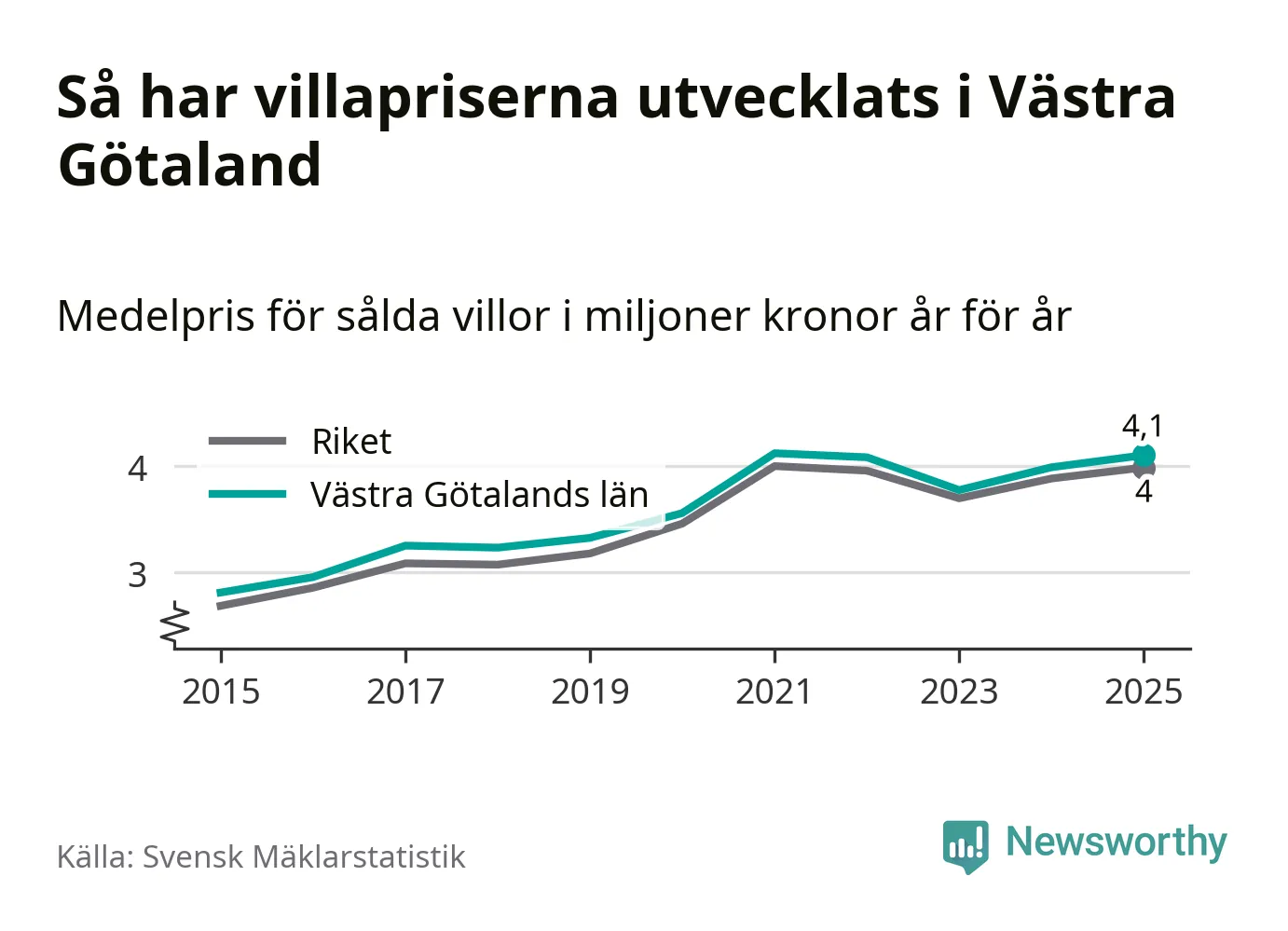 4,1 miljoner kronor är medelpriset för de villor som såldes i Västra Götalands län under året, eller 33 099 kronor per kvadratmeter. Det innebär en prisökning med tre procent på ett år och är andra året i rad som priserna ökar i länet.