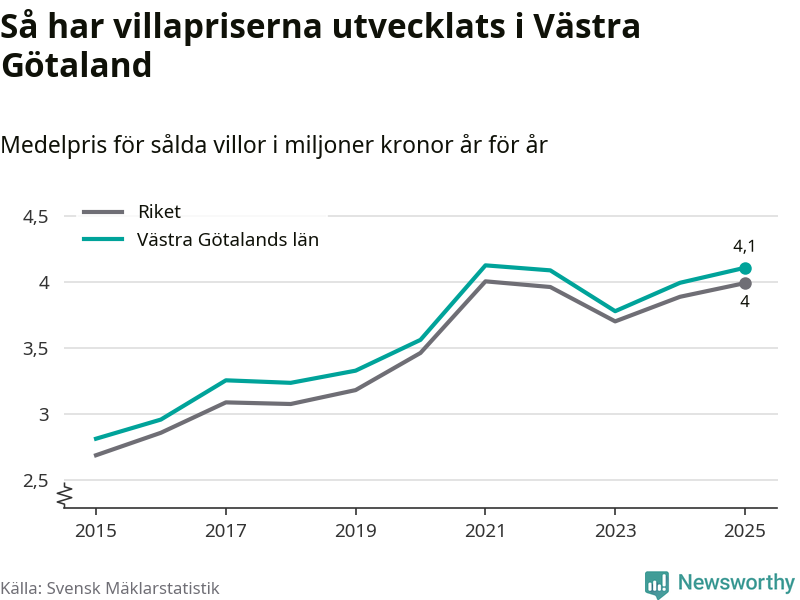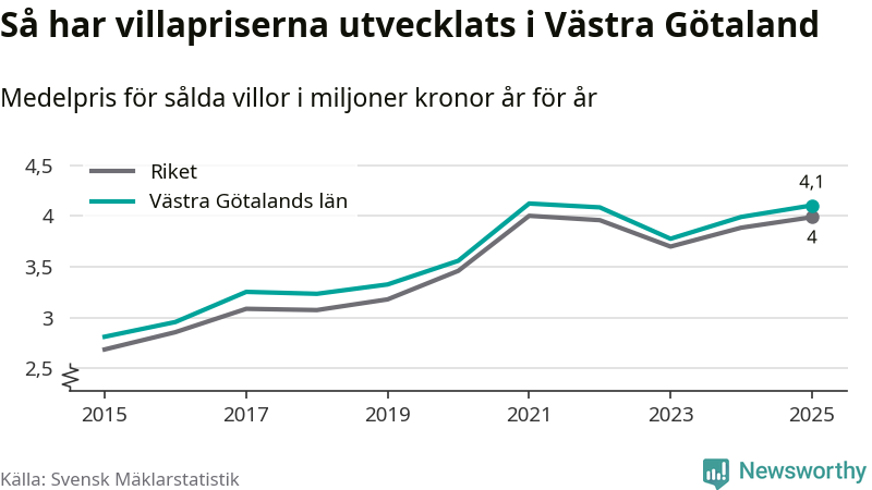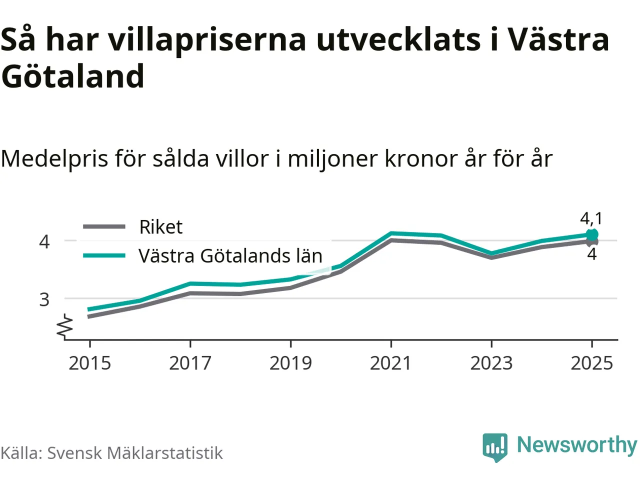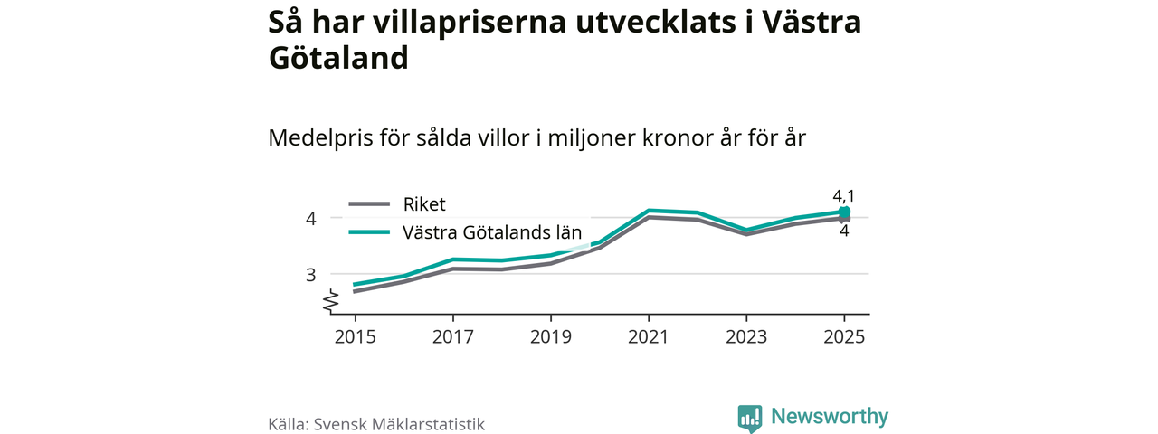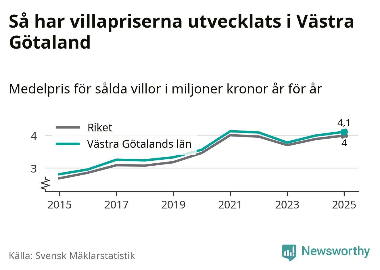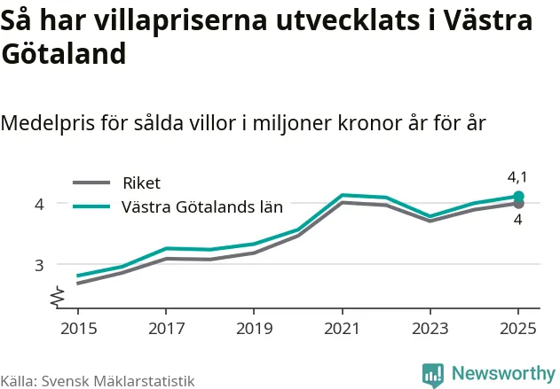 4,1 miljoner kronor är medelpriset för de villor som såldes i Västra Götalands län under året, eller 33 099 kronor per kvadratmeter. Det innebär en prisökning med tre procent på ett år och är andra året i rad som priserna ökar i länet.
