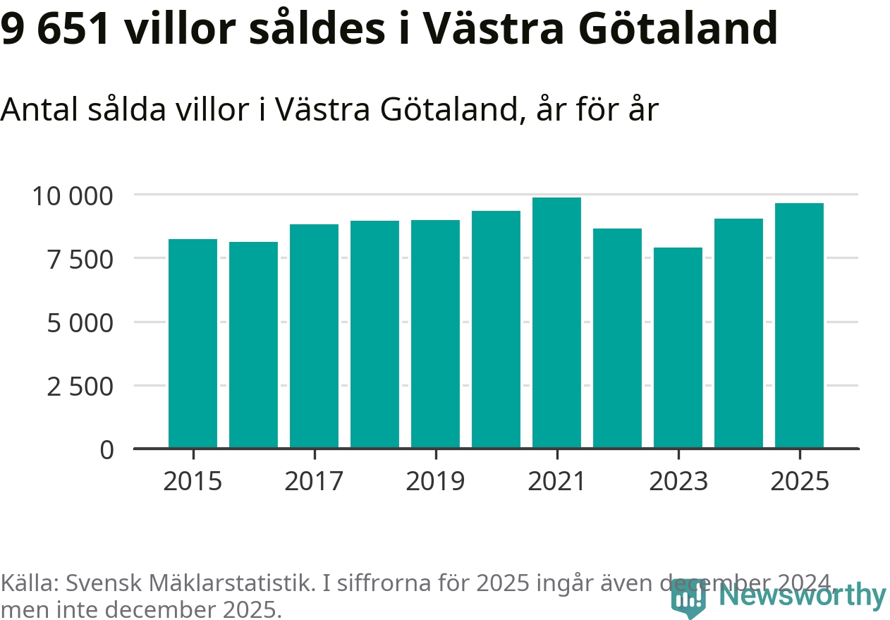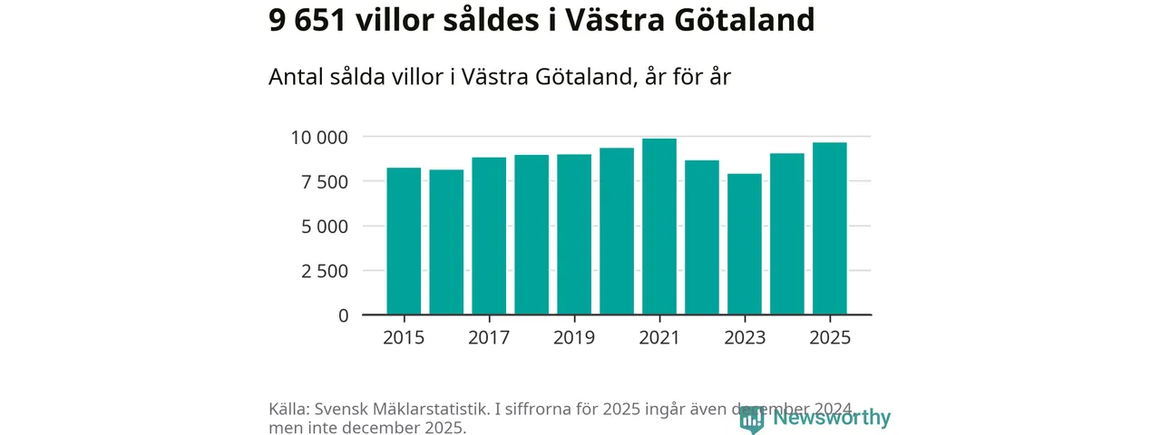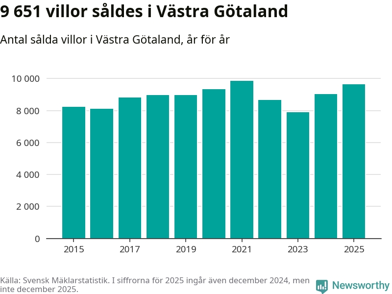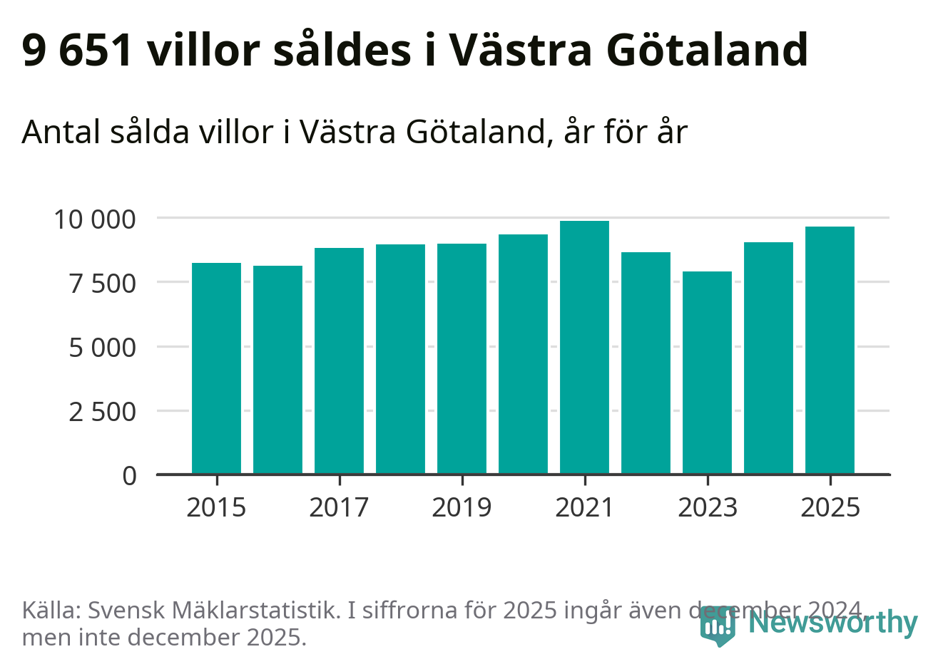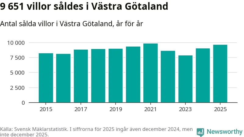 Antalet sålda villor ökade också. Totalt såldes 9 651 villor, att jämföra med 9 043 under 2024. Det är andra året i rad som antalet sålda villor ökar i länet.