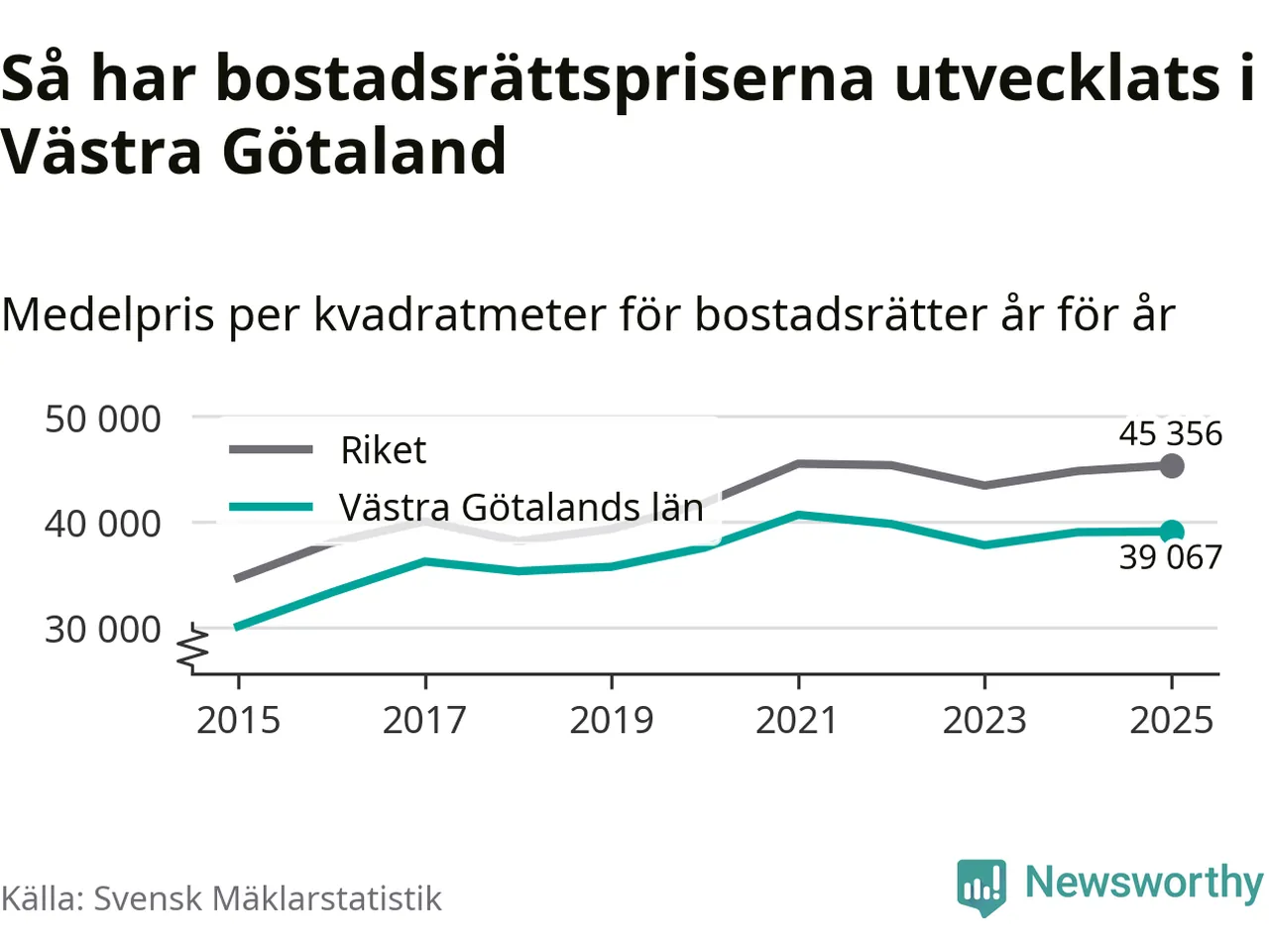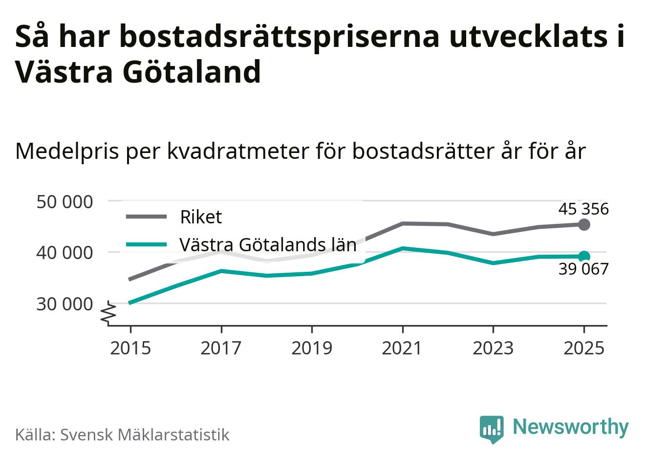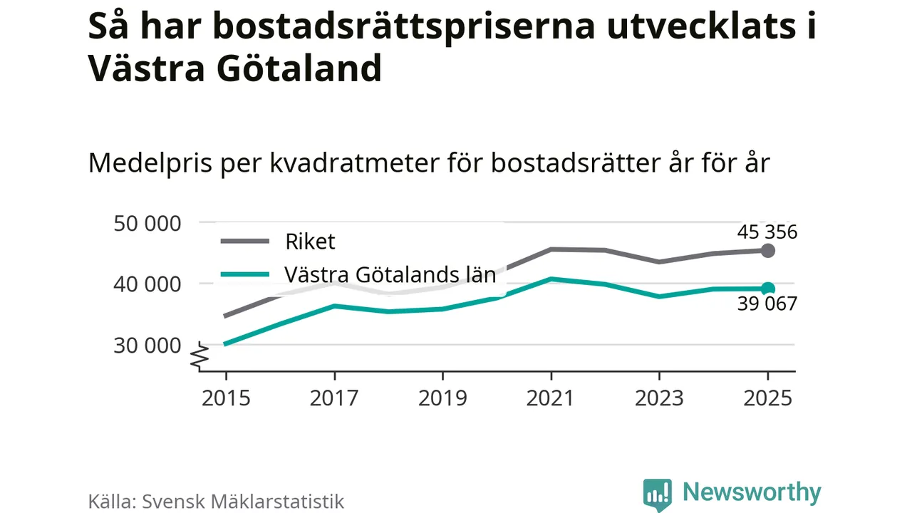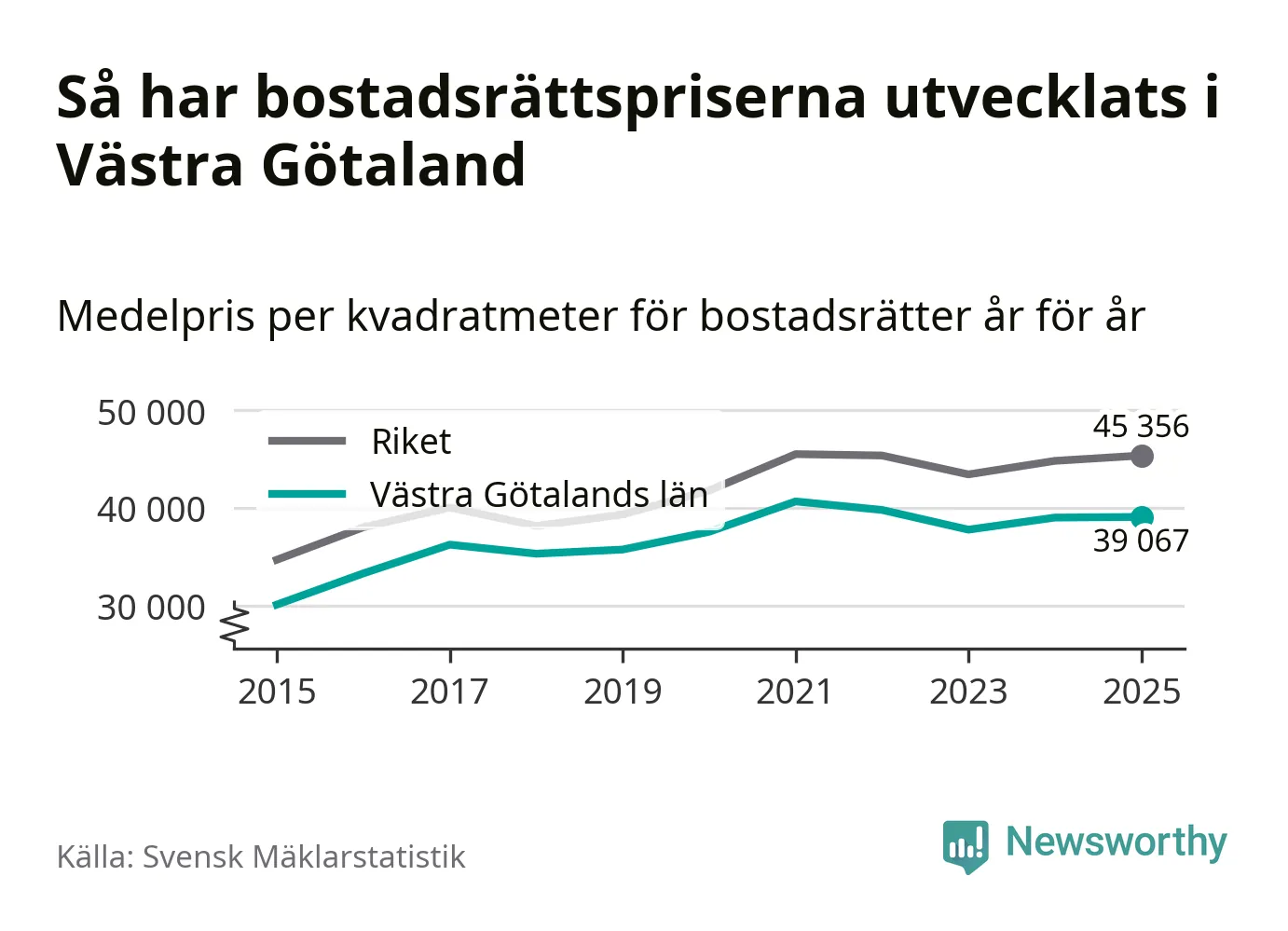 Det såldes totalt 15 624 bostadsrätter i Västra Götalands län under året. Genomsnittspriset per kvadratmeter landade på 39 067 kronor, vilket är ungefär samma nivå som förra året.