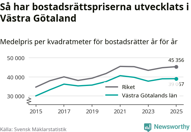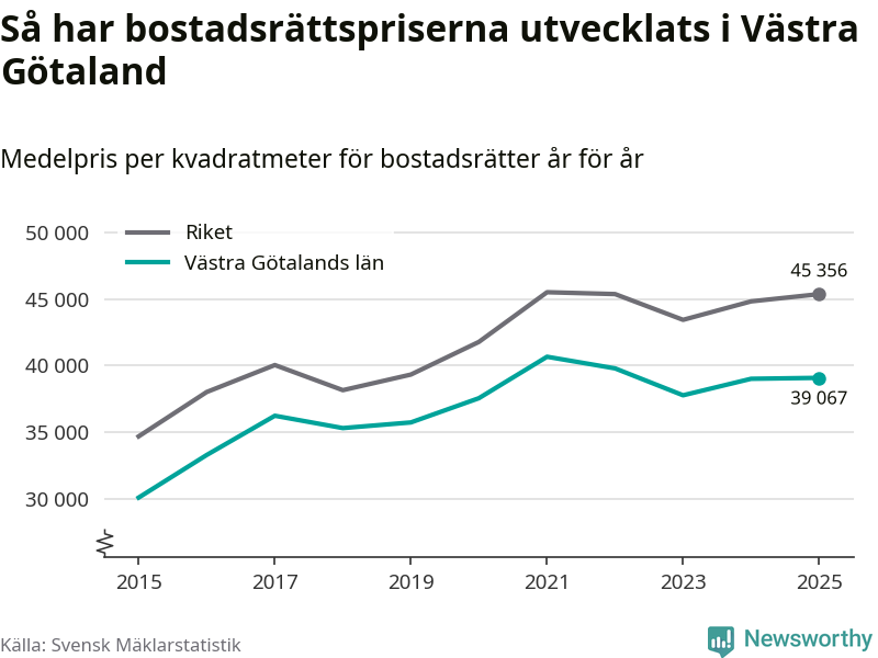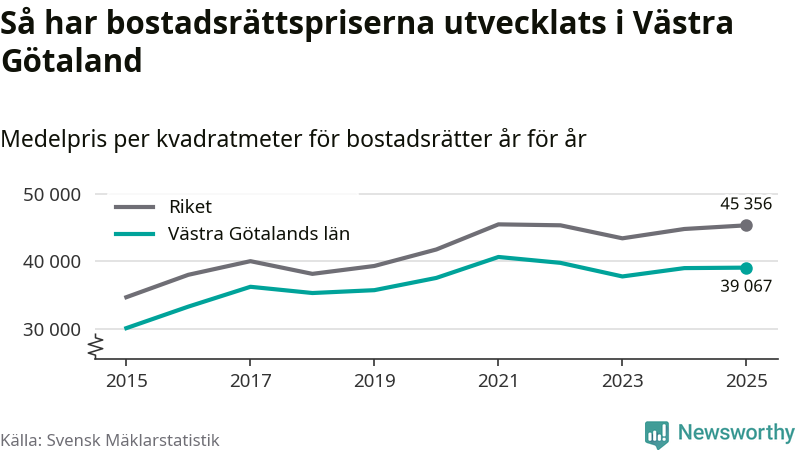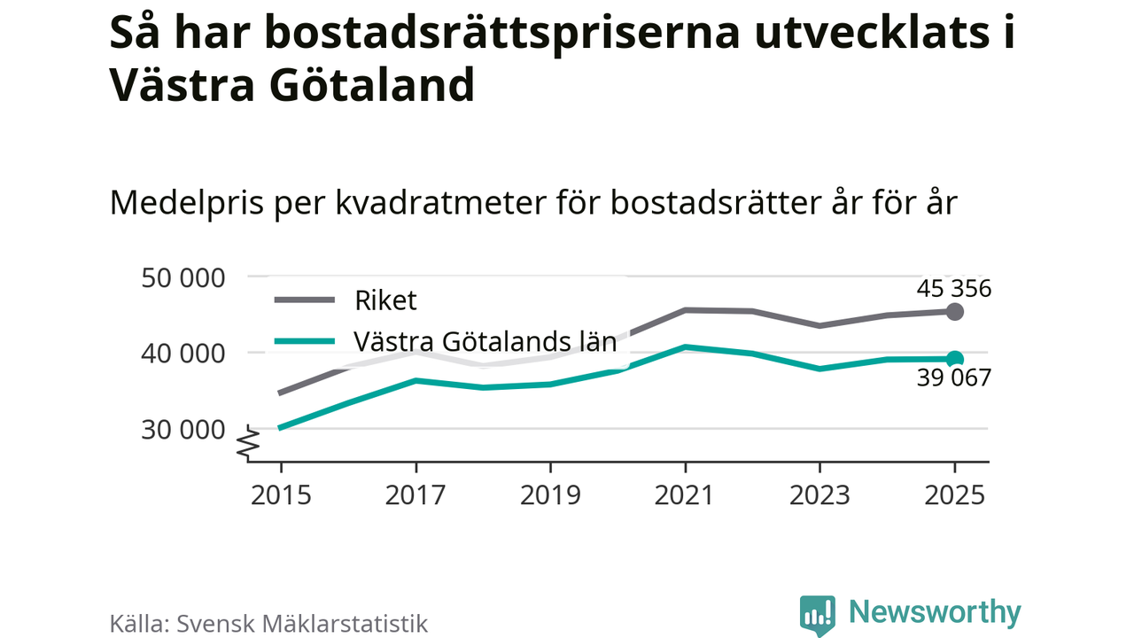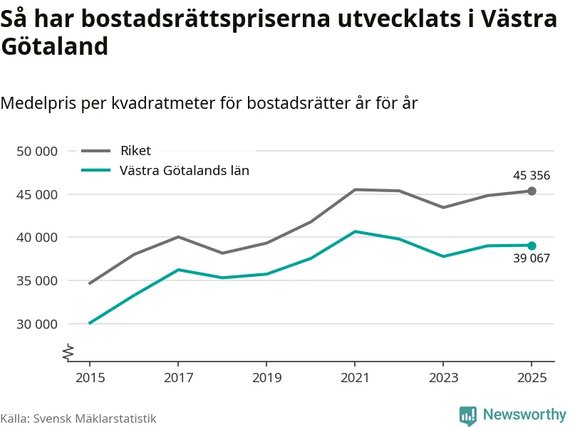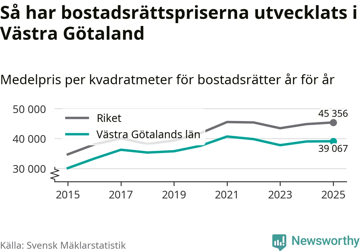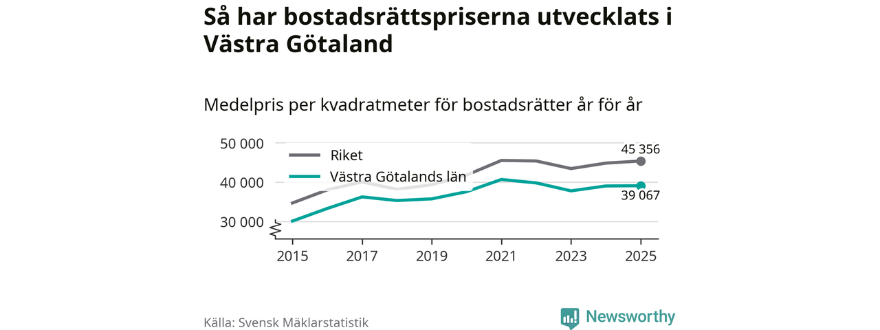 Det såldes totalt 15 624 bostadsrätter i Västra Götalands län under året. Genomsnittspriset per kvadratmeter landade på 39 067 kronor, vilket är ungefär samma nivå som förra året.