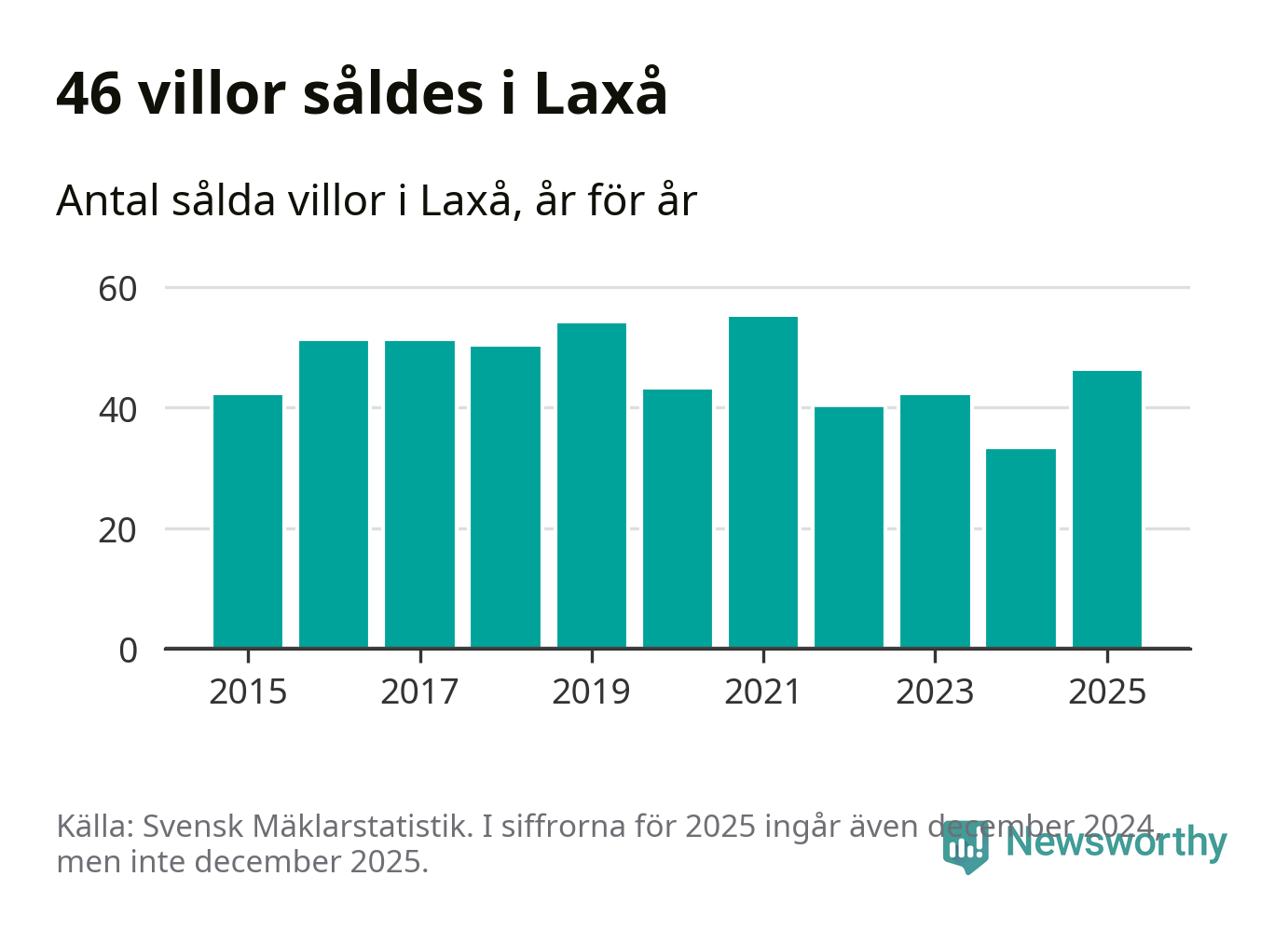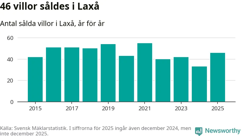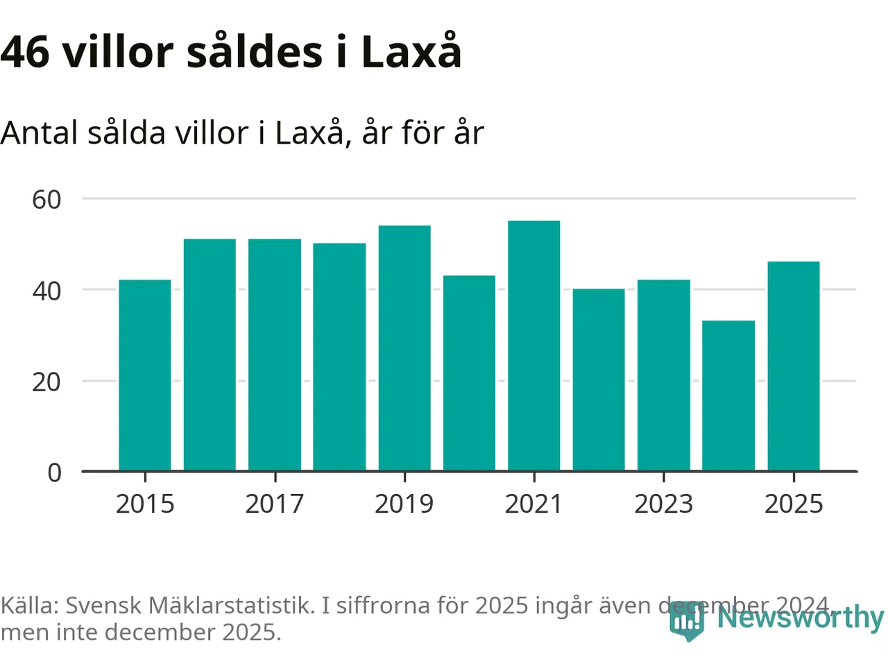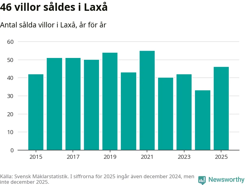 Antalet sålda villor ökade också. Totalt såldes 46 villor, att jämföra med 33 under 2024.