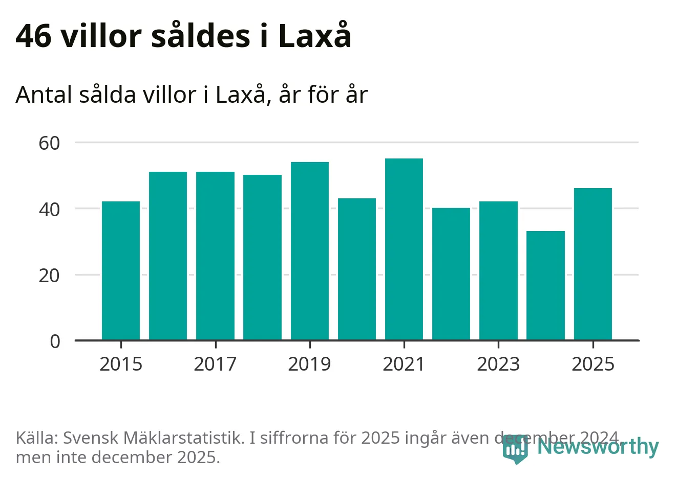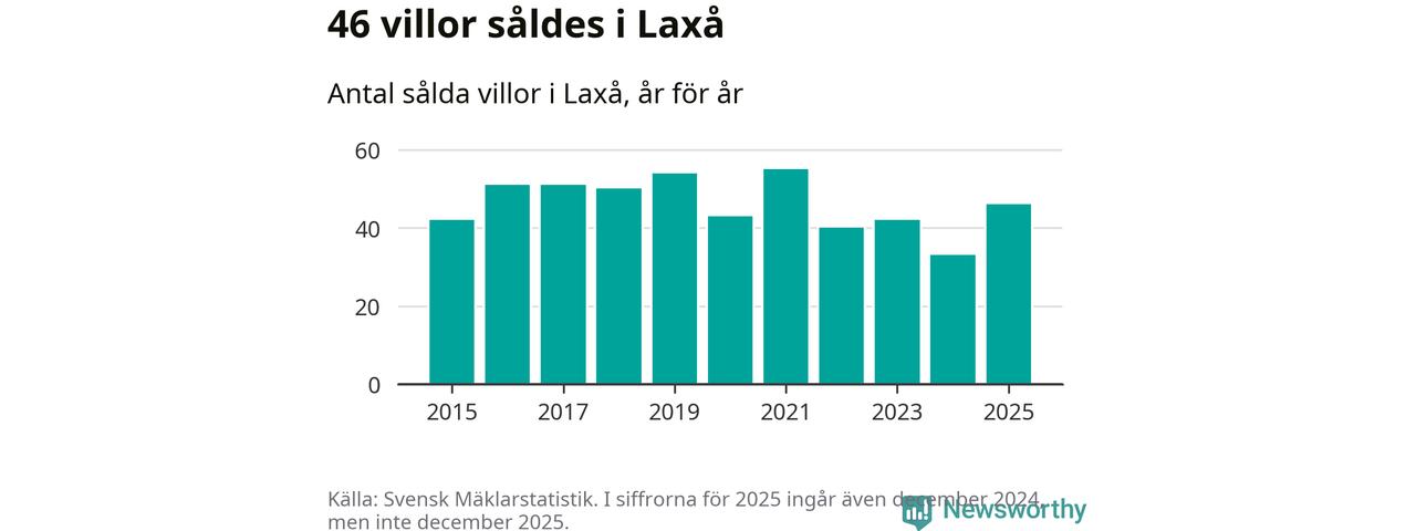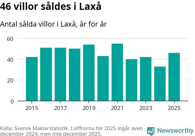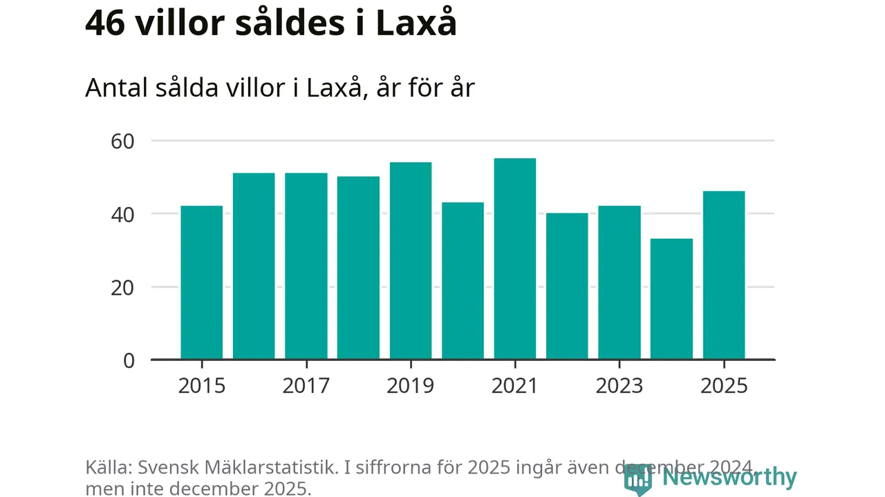 Antalet sålda villor ökade också. Totalt såldes 46 villor, att jämföra med 33 under 2024.