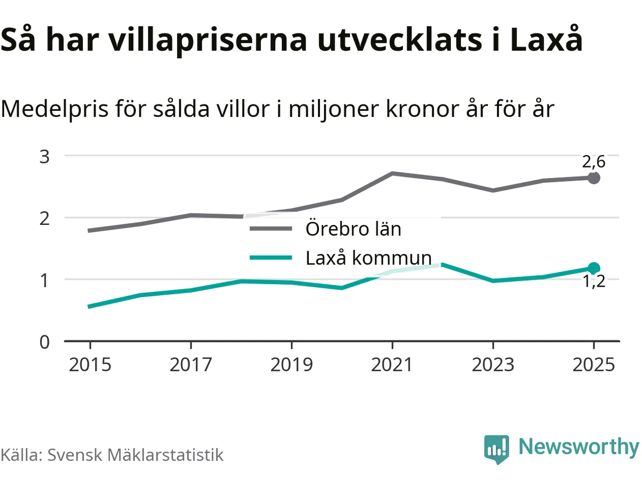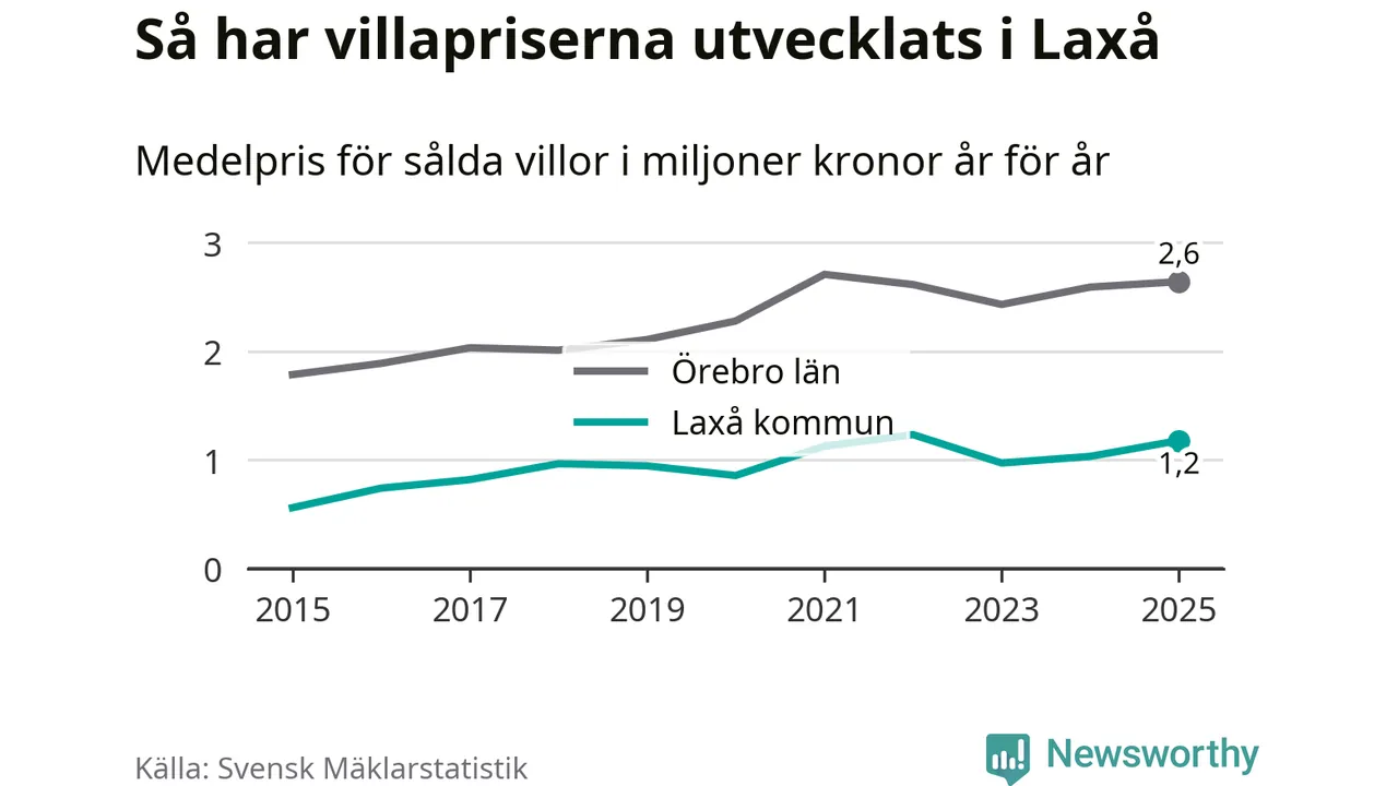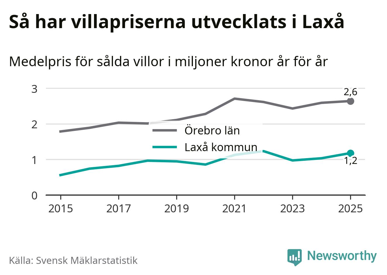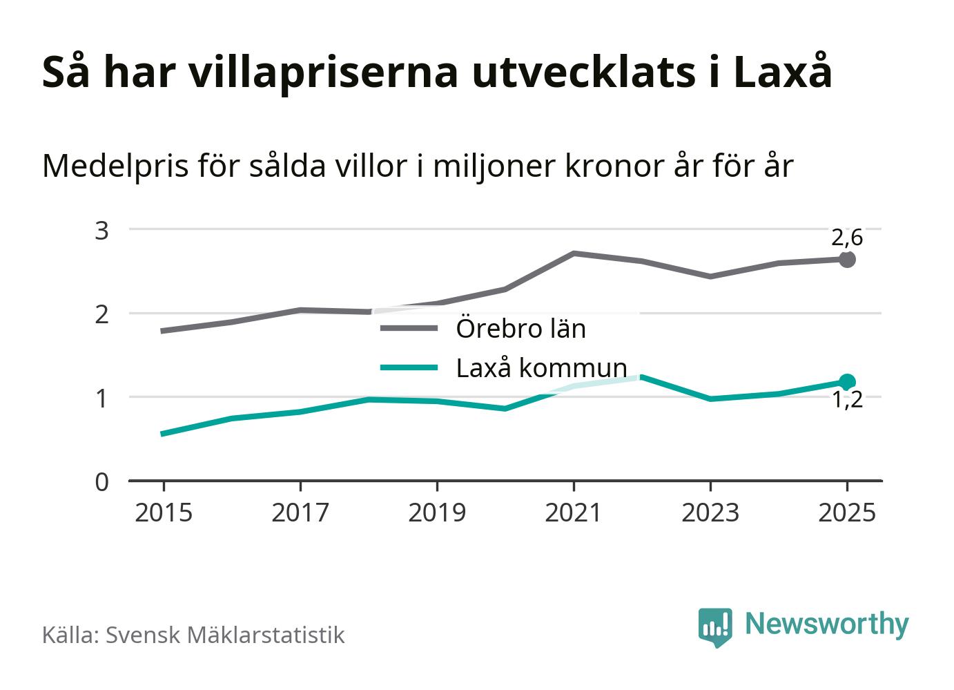 1,2 miljoner kronor är medelpriset för de villor som såldes i Laxå kommun under året, eller 11 556 kronor per kvadratmeter. Det innebär en prisökning med 14 procent på ett år och är andra året i rad som priserna ökar i kommunen.