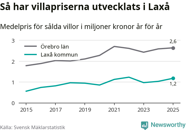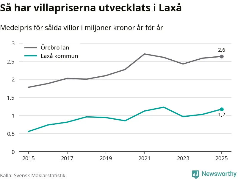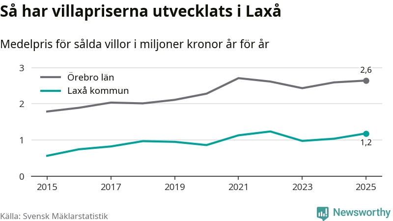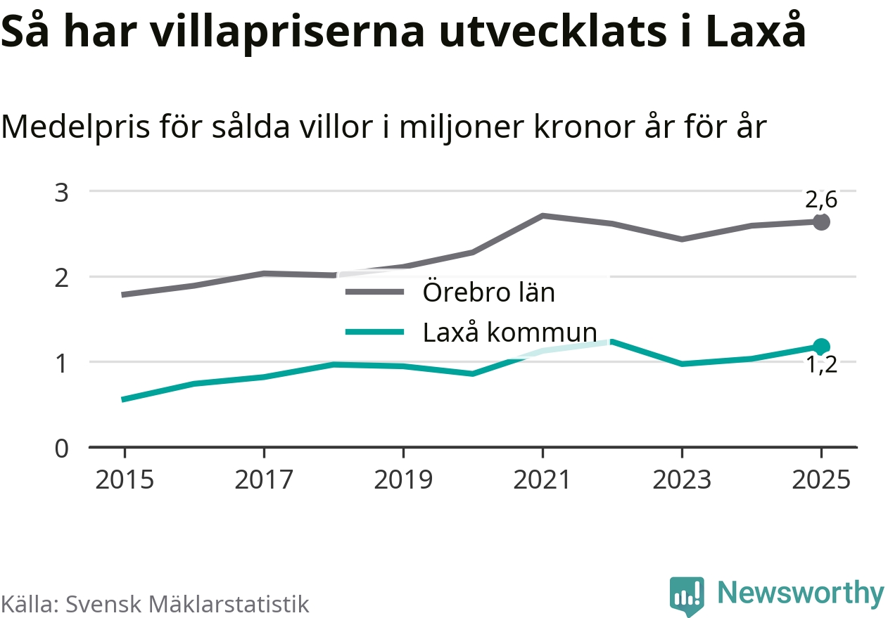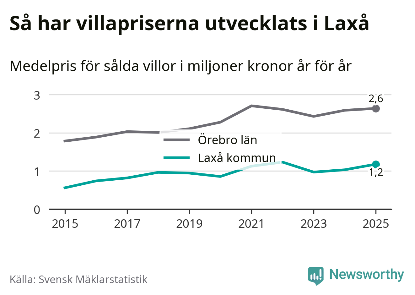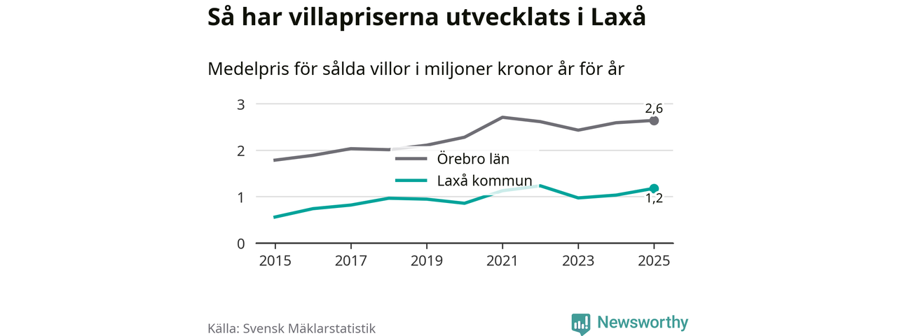 1,2 miljoner kronor är medelpriset för de villor som såldes i Laxå kommun under året, eller 11 556 kronor per kvadratmeter. Det innebär en prisökning med 14 procent på ett år och är andra året i rad som priserna ökar i kommunen.