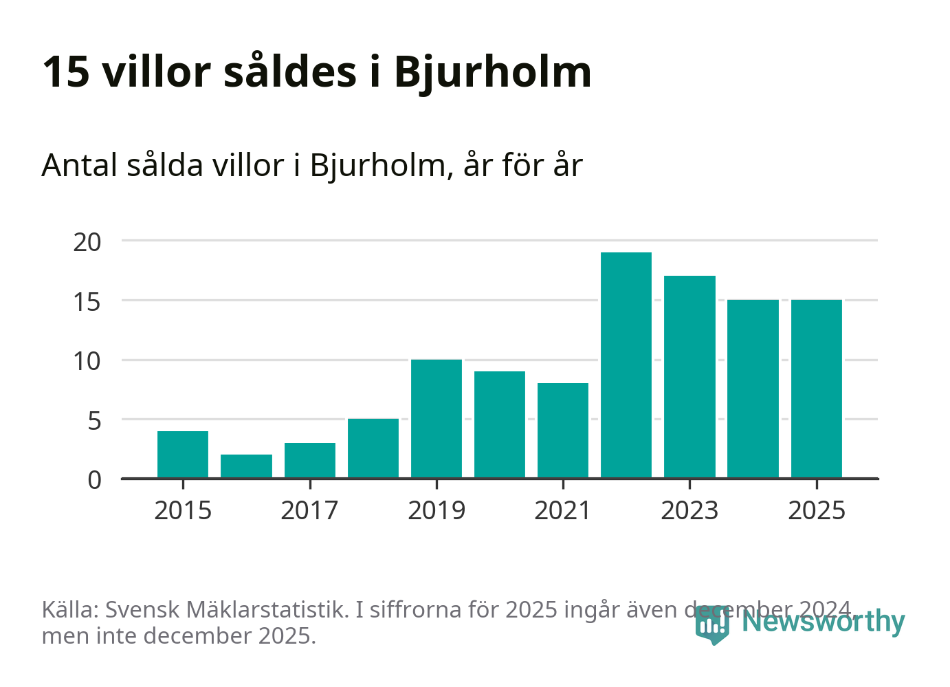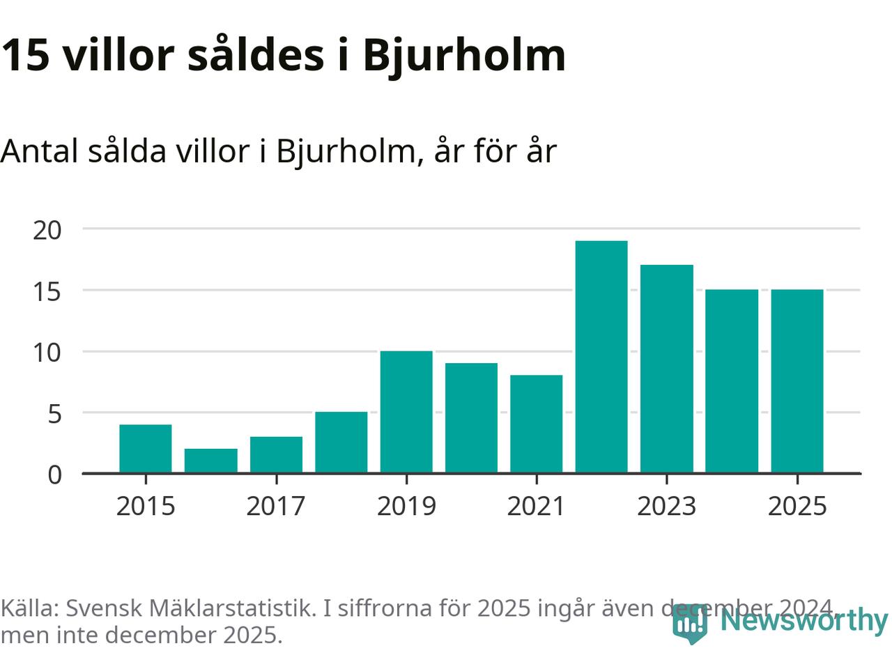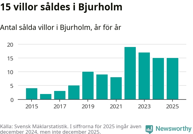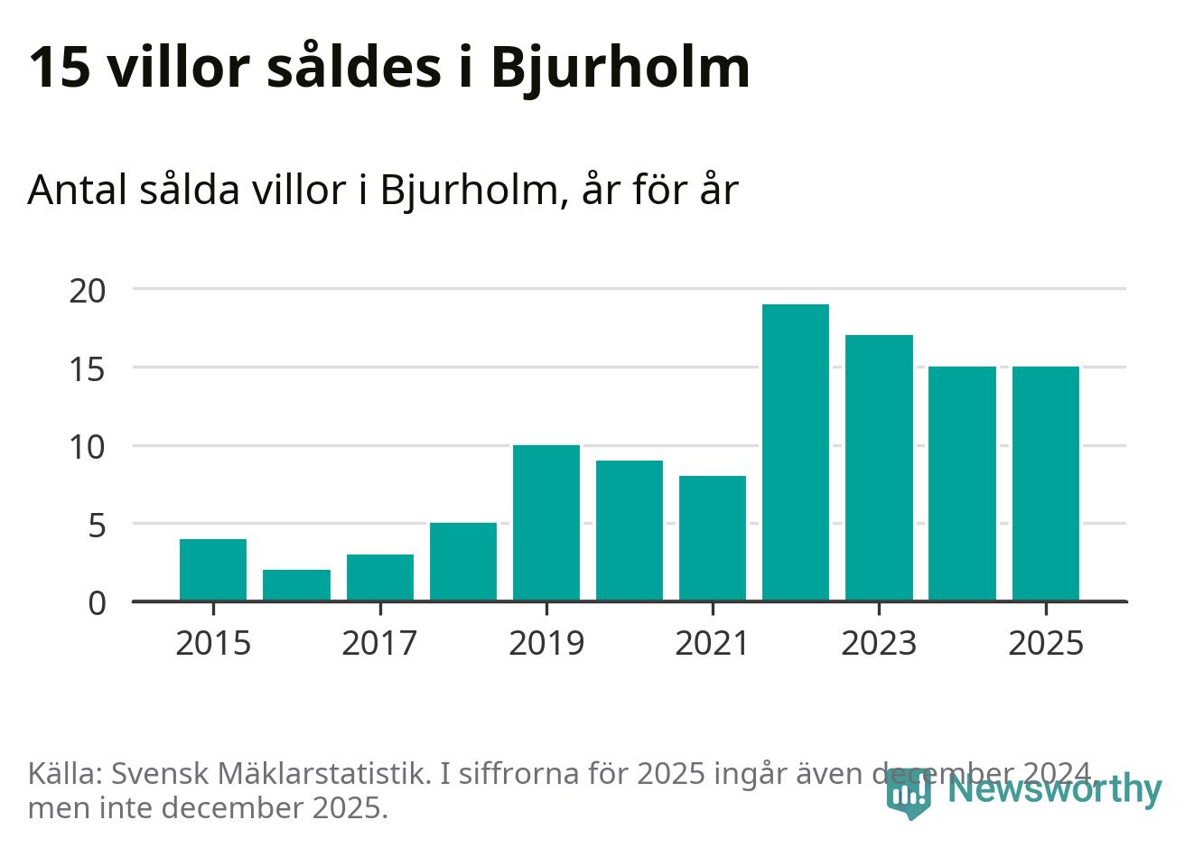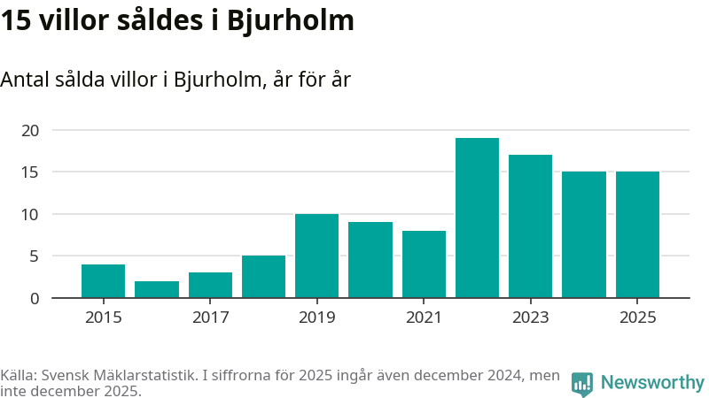 något. Totalt såldes 15 villor, vilket är lika många som året innan.Totalt såldes 15 villor, att jämföra med 15 under 2024.