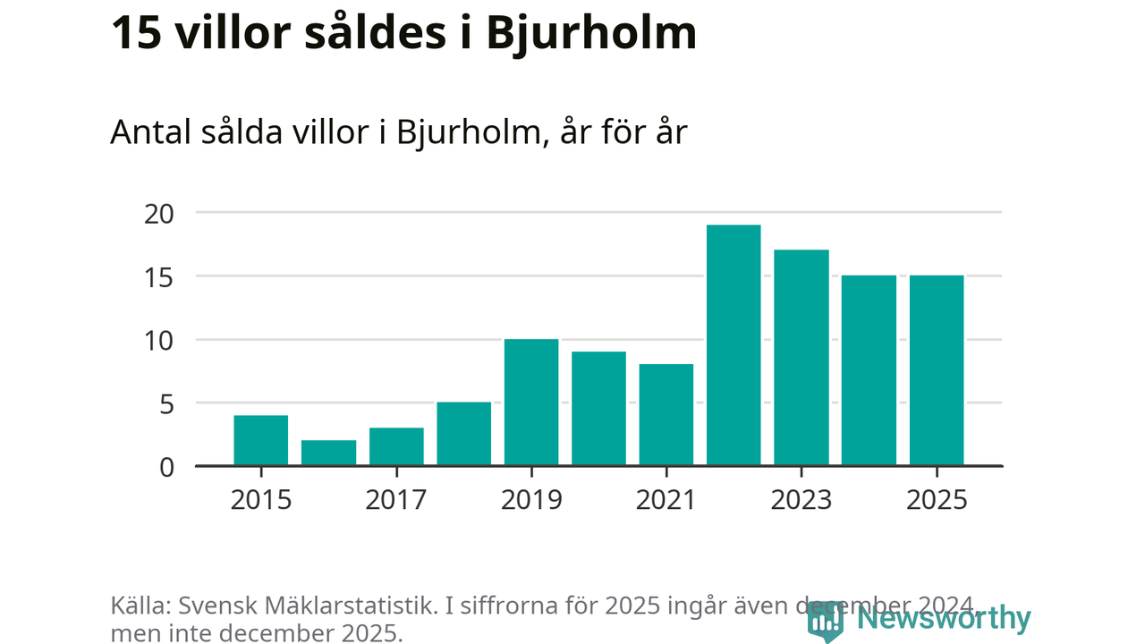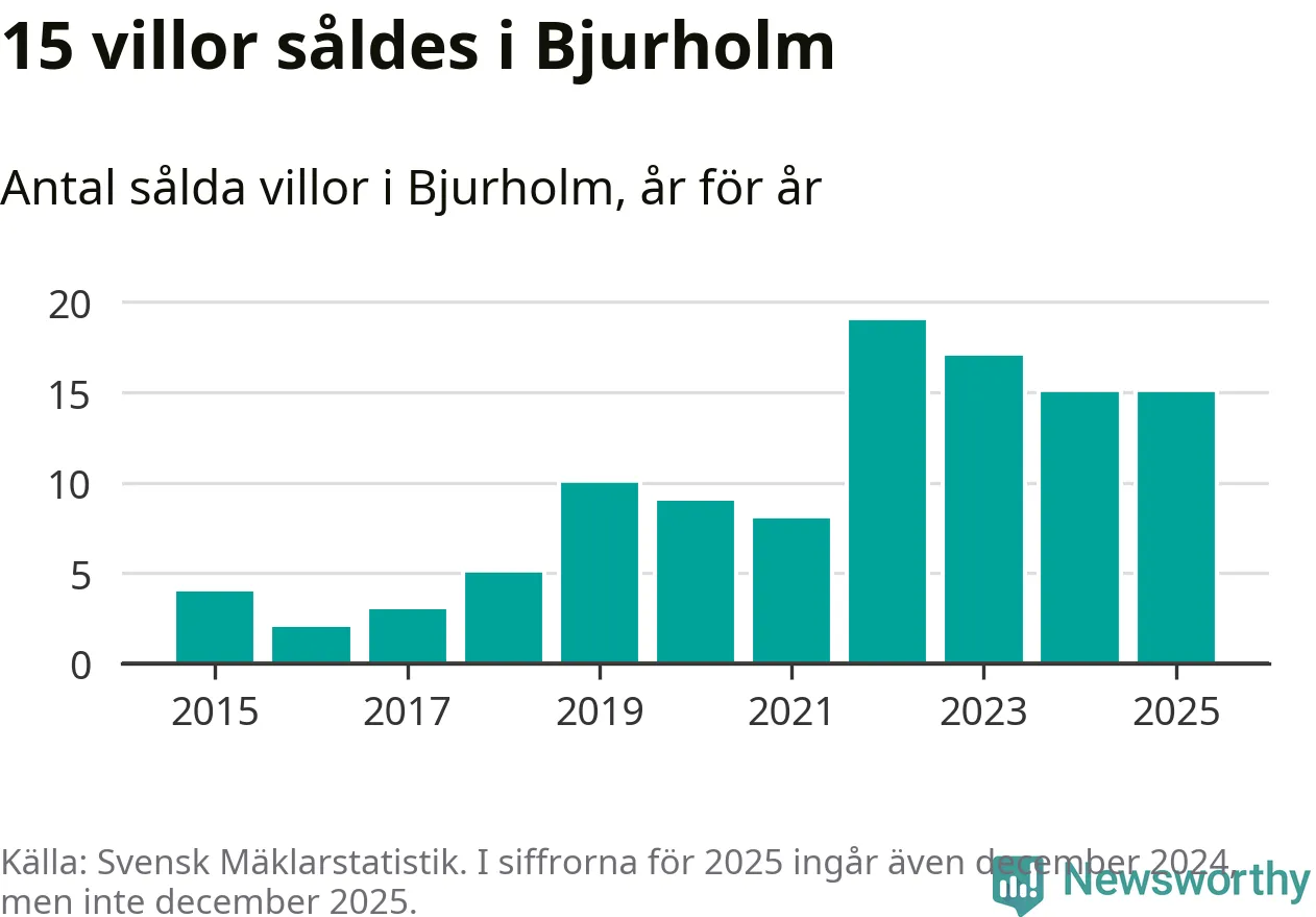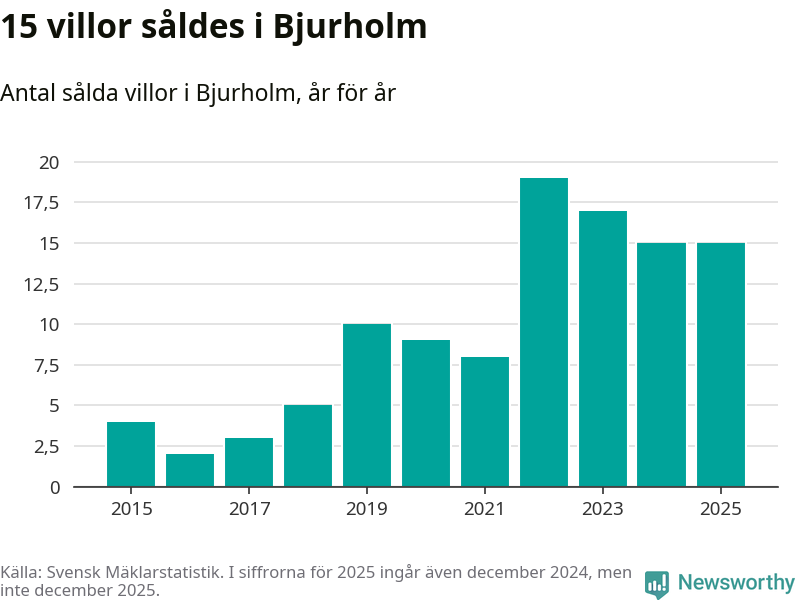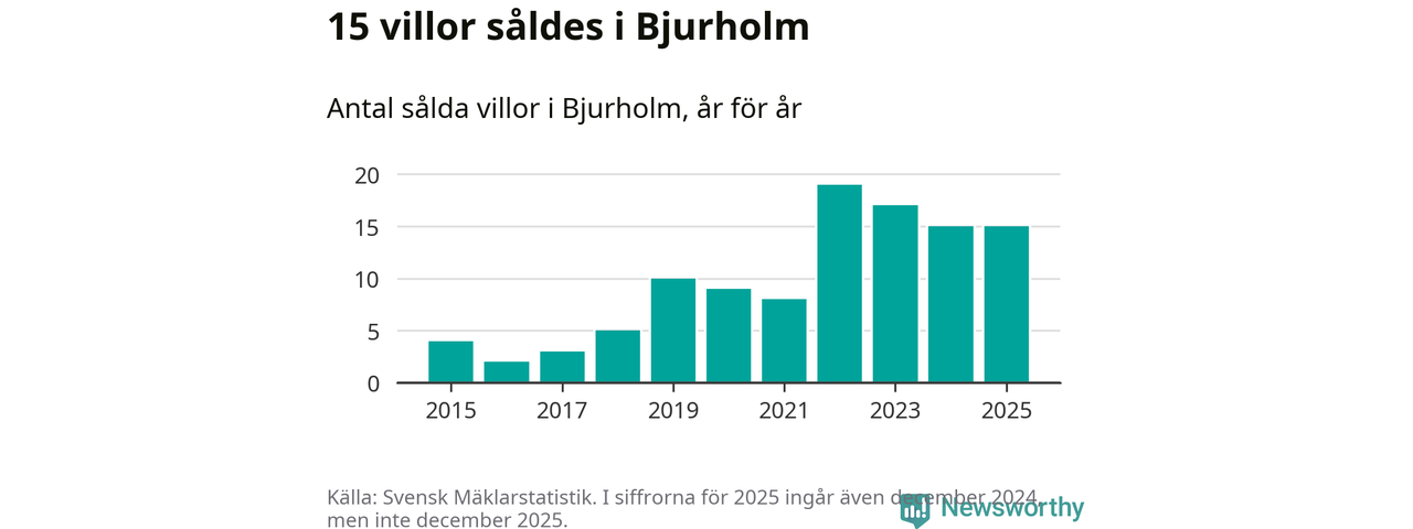 något. Totalt såldes 15 villor, vilket är lika många som året innan.Totalt såldes 15 villor, att jämföra med 15 under 2024.
