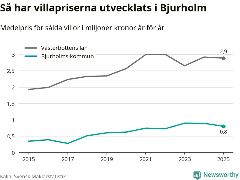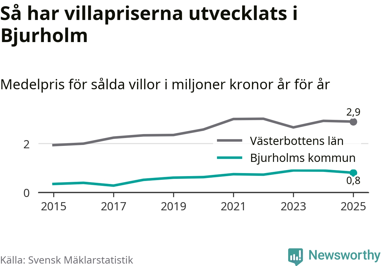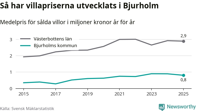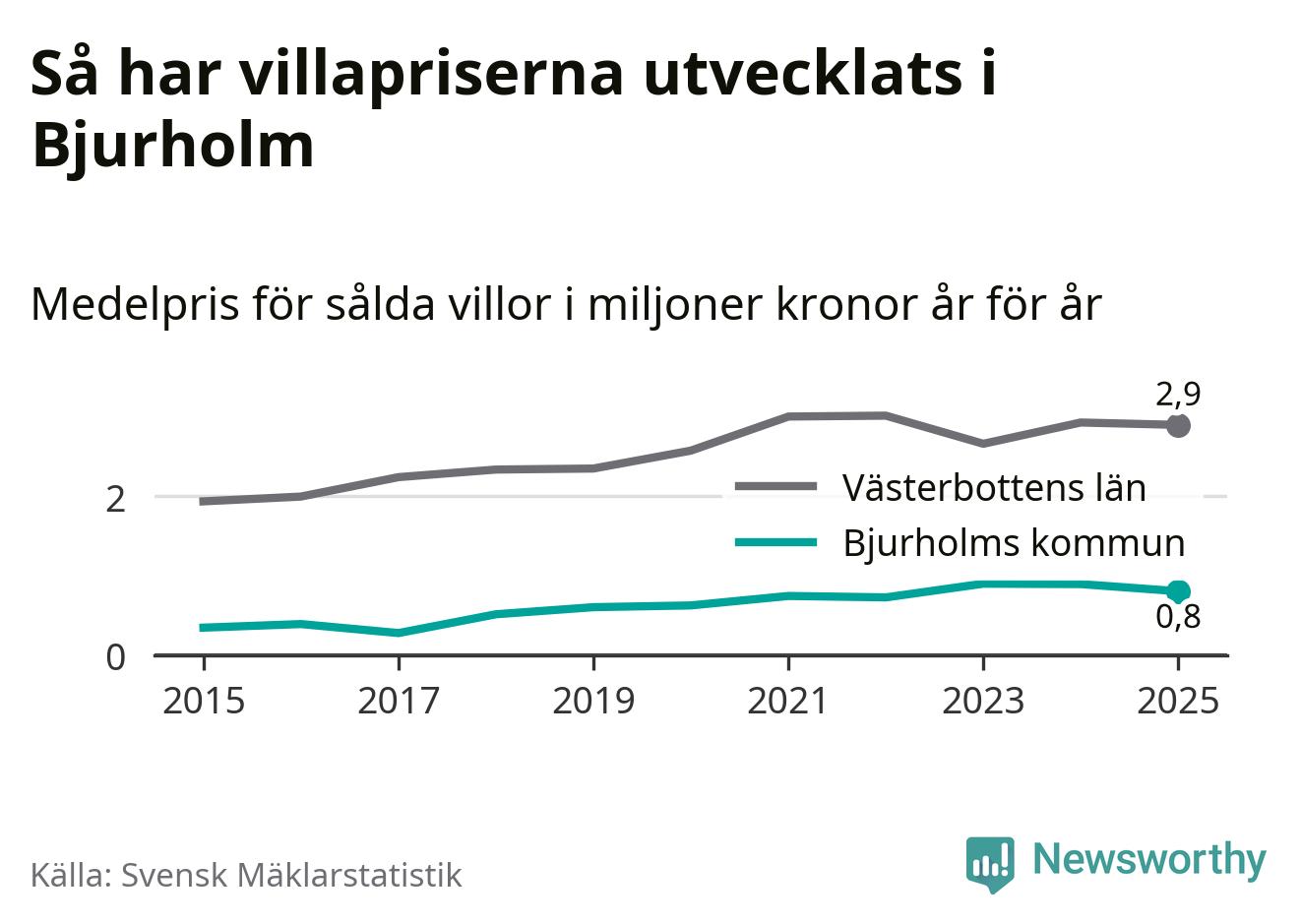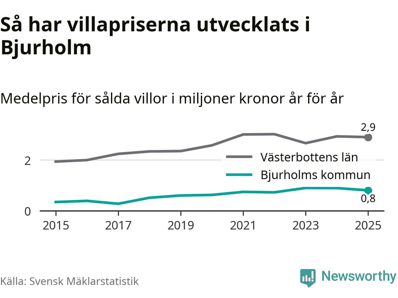 805 000 kronor är medelpriset för de villor som såldes i Bjurholms kommun under året, eller 6 651 kronor per kvadratmeter. Det innebär en prisminskning med tio procent på ett år och är andra året i rad som priserna sjunker i kommunen.
