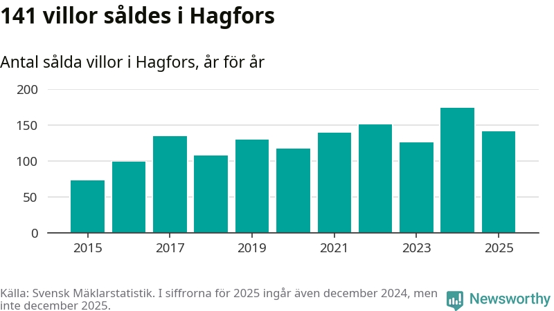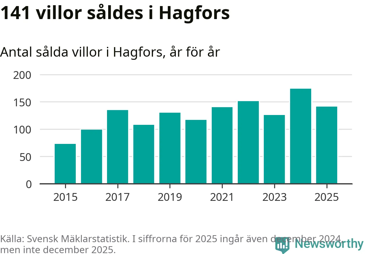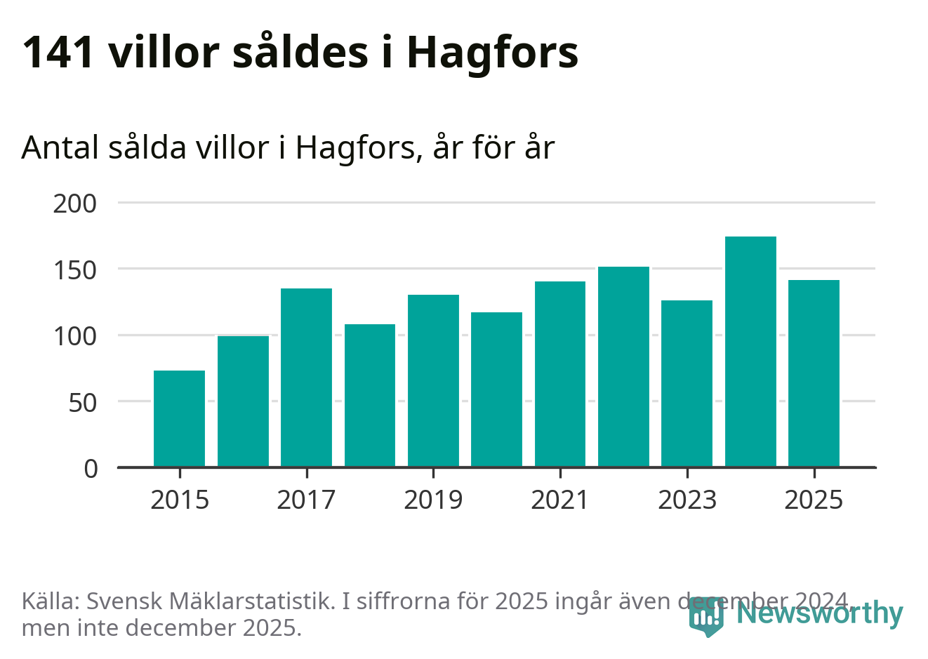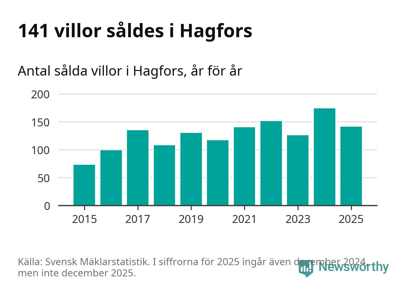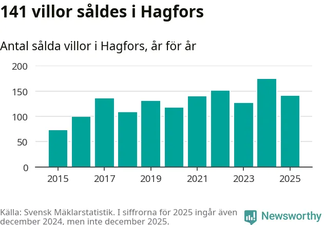 Antalet sålda villor minskade också. Totalt såldes 141 villor, att jämföra med 174 under 2024.