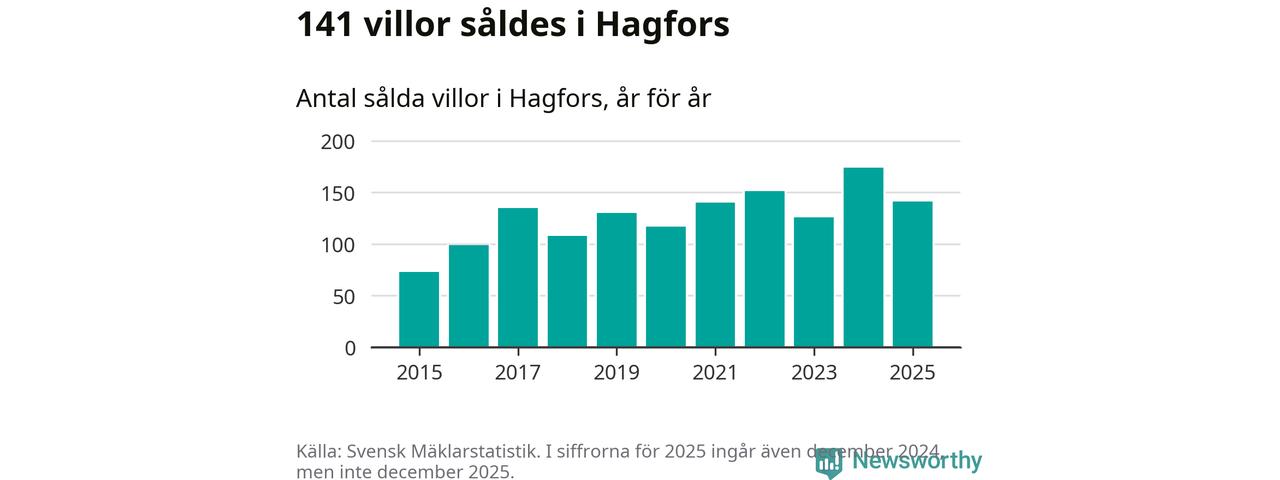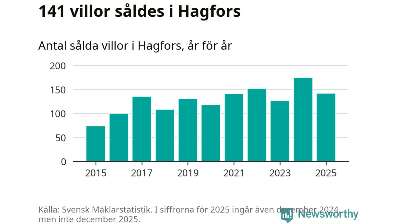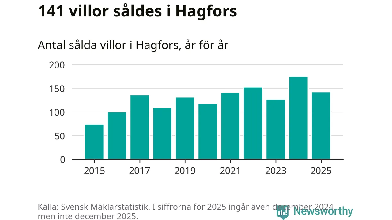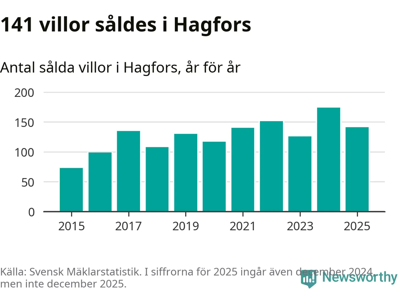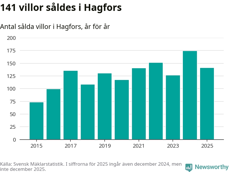 Antalet sålda villor minskade också. Totalt såldes 141 villor, att jämföra med 174 under 2024.