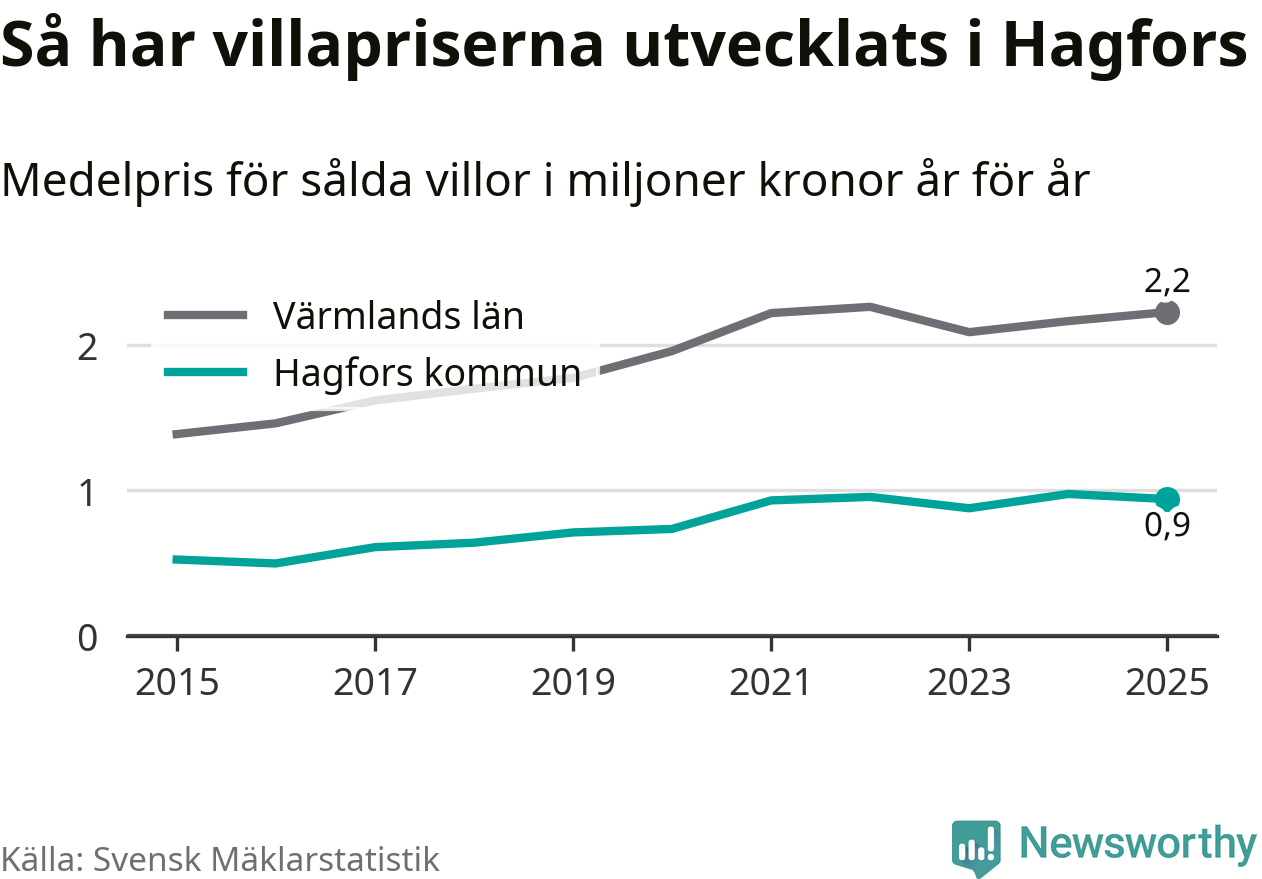 940 000 kronor är medelpriset för de villor som såldes i Hagfors kommun under året, eller 8 965 kronor per kvadratmeter. Det innebär en prisminskning med fyra procent på ett år.