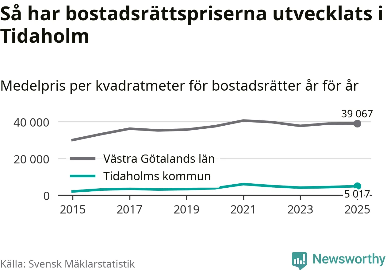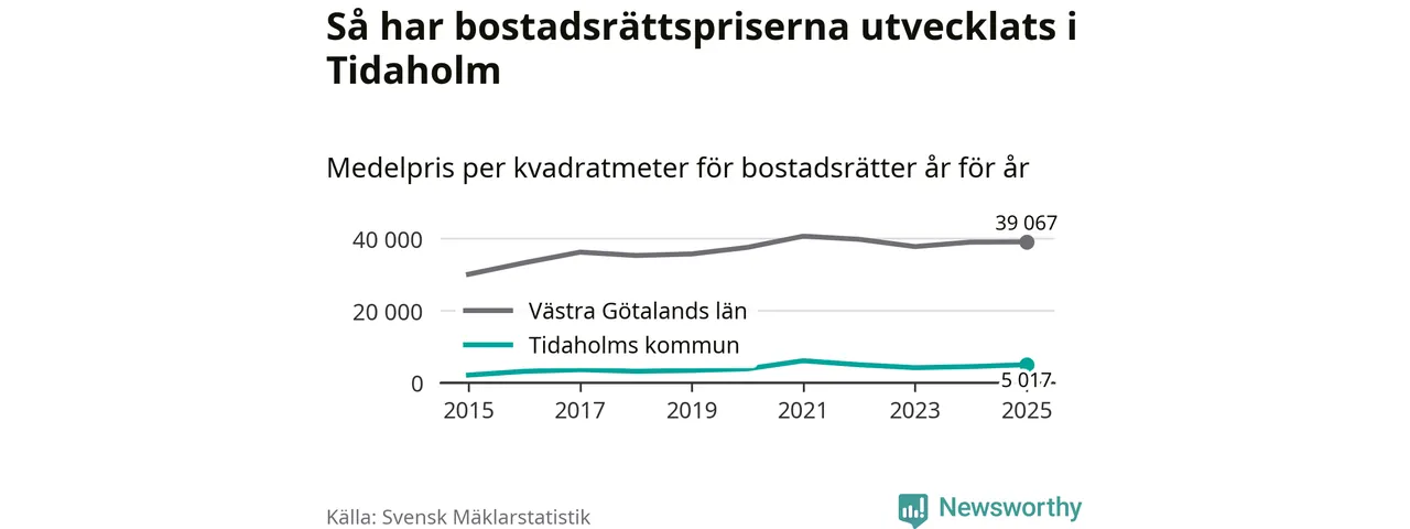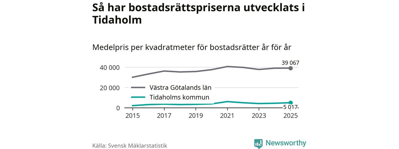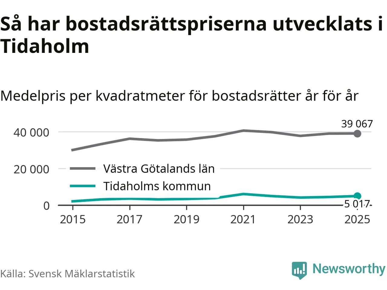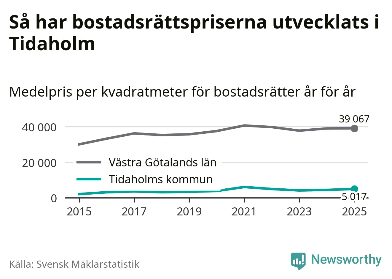 Det såldes totalt 106 bostadsrätter i Tidaholms kommun under året. Genomsnittspriset per kvadratmeter landade på 5 017 kronor. Det är en ökning med tolv procent i kommunen på ett år.