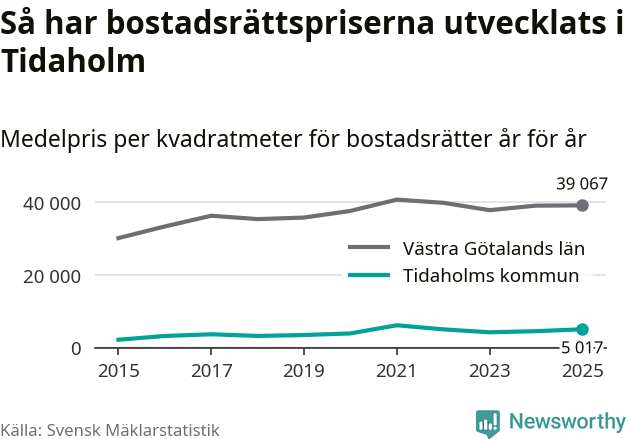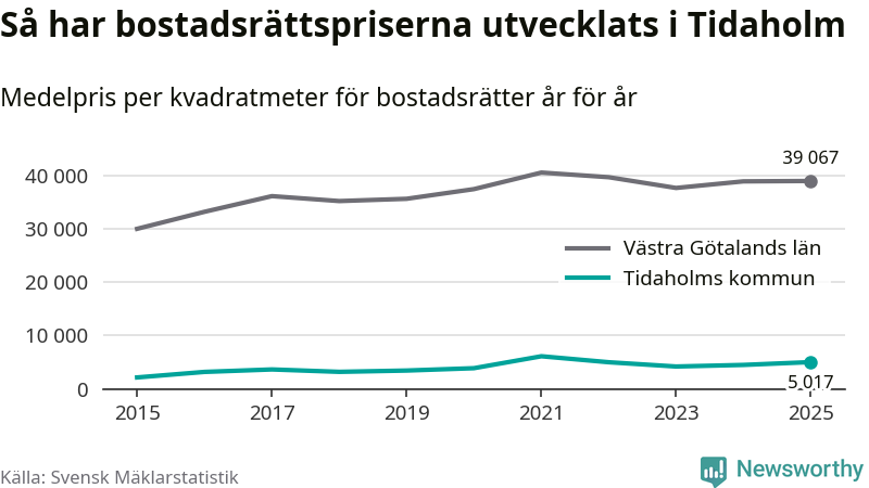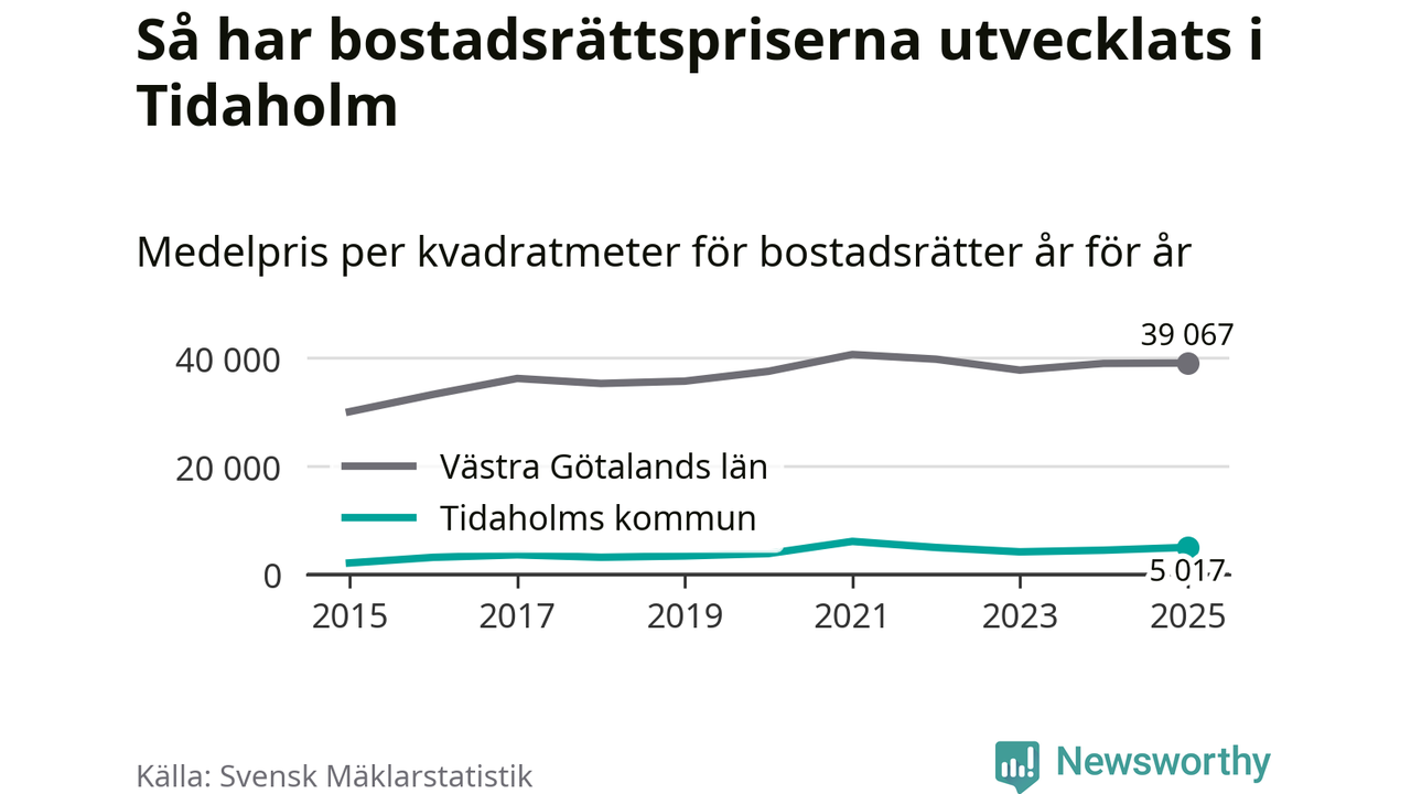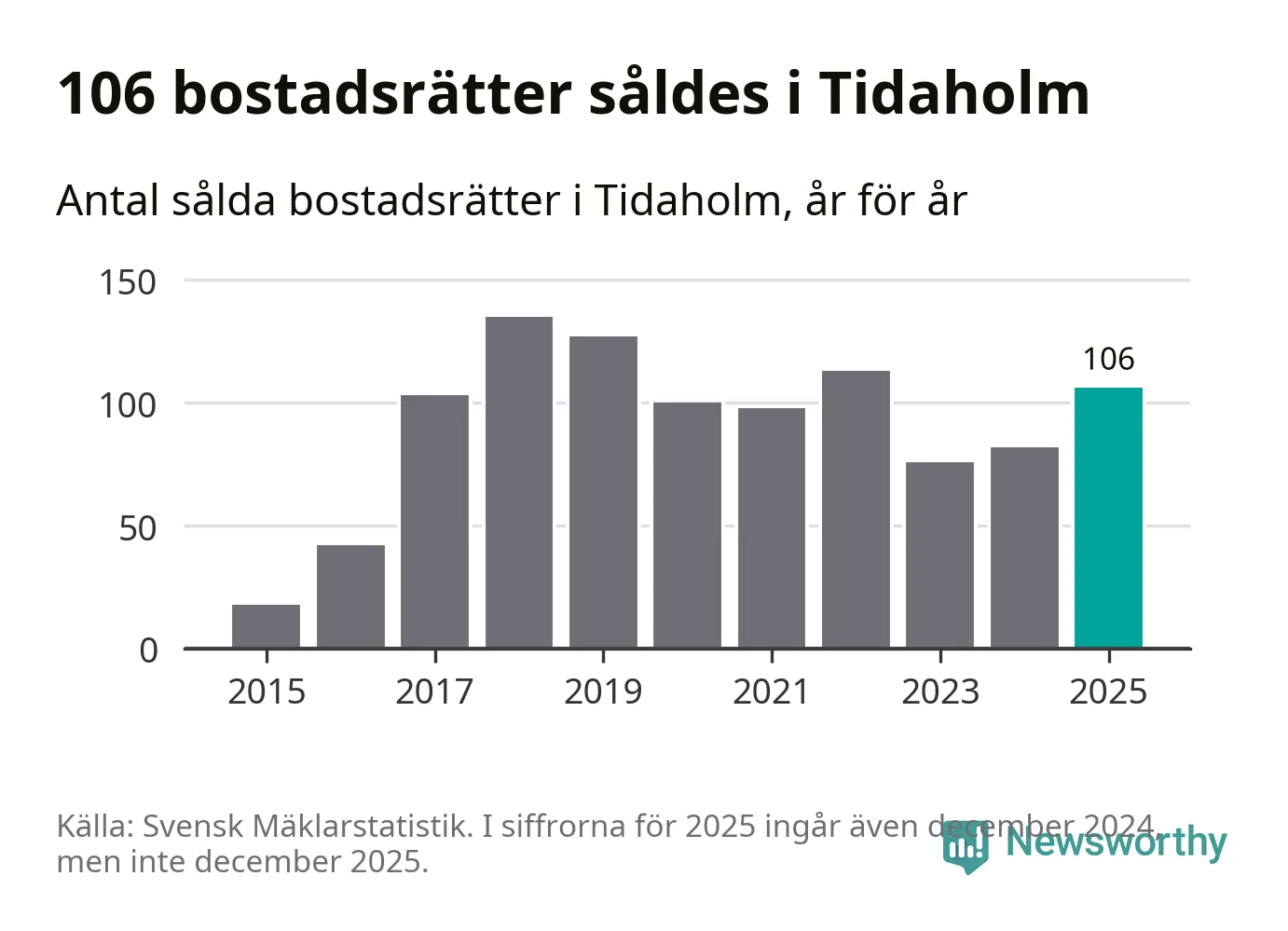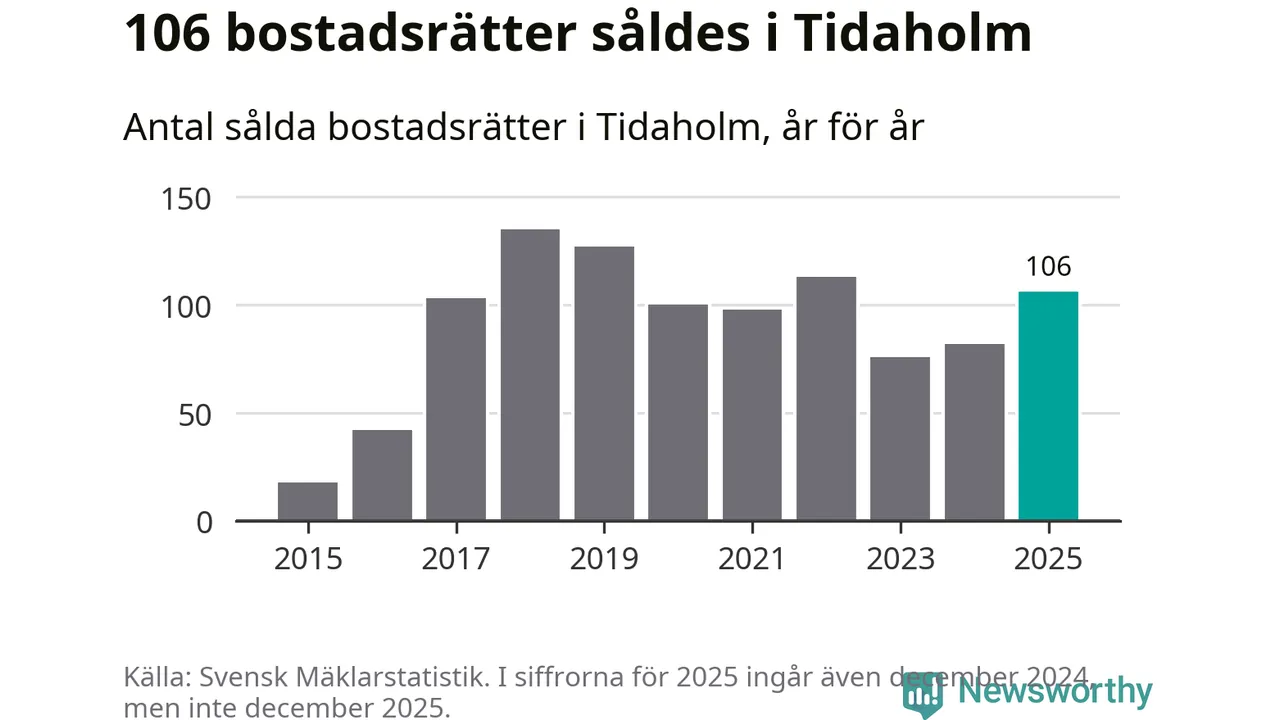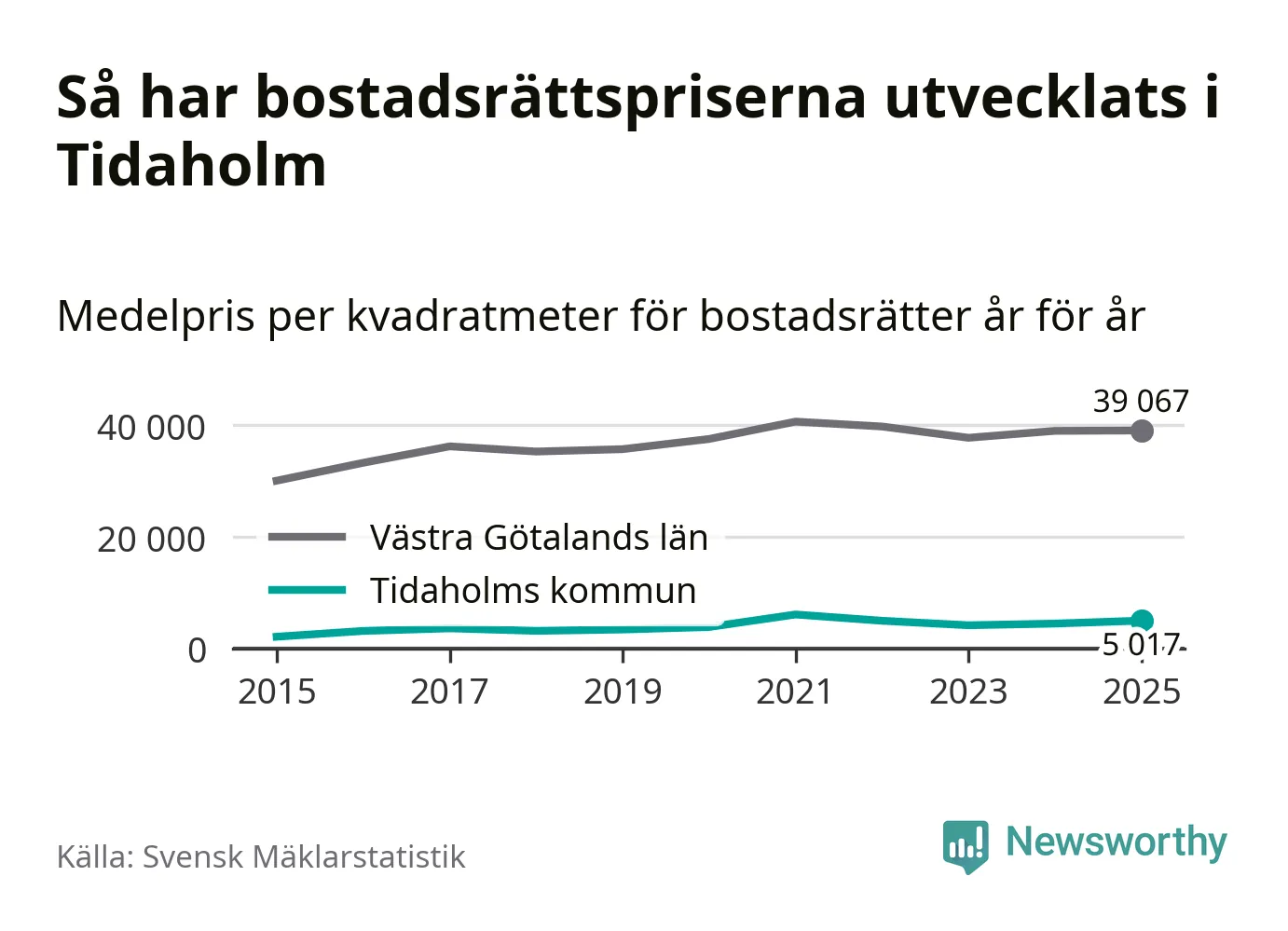 Det såldes totalt 106 bostadsrätter i Tidaholms kommun under året. Genomsnittspriset per kvadratmeter landade på 5 017 kronor. Det är en ökning med tolv procent i kommunen på ett år.
