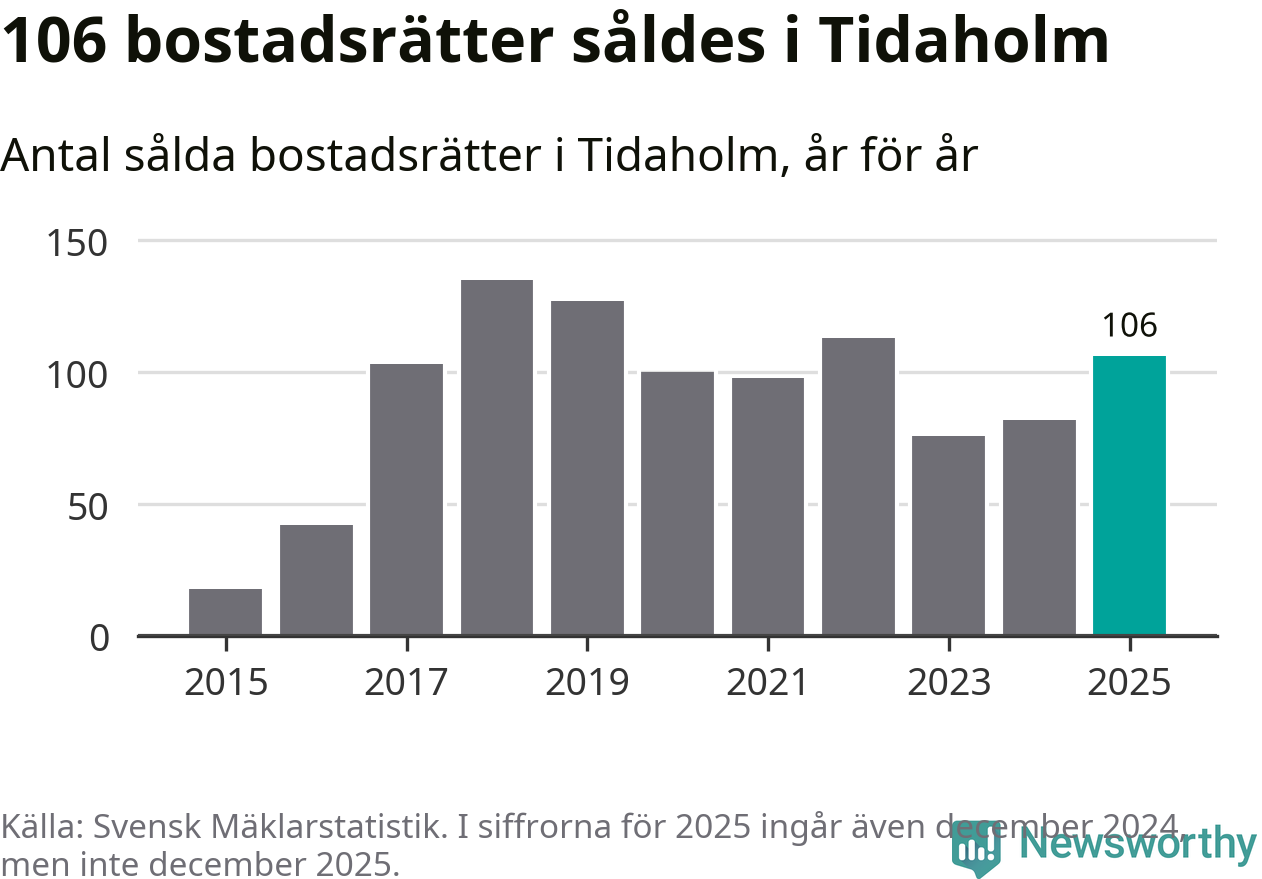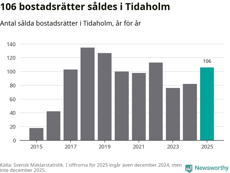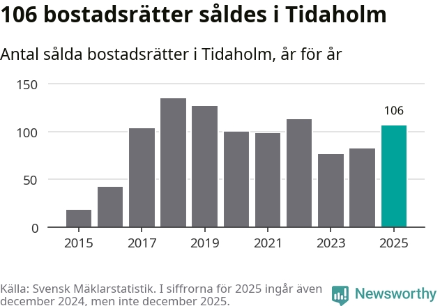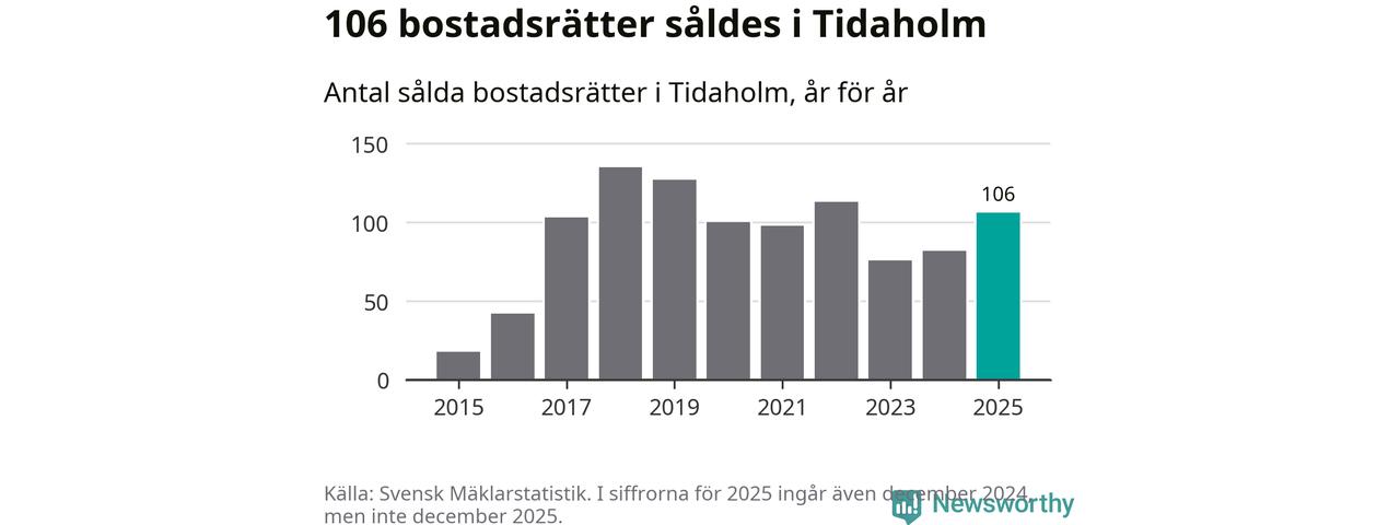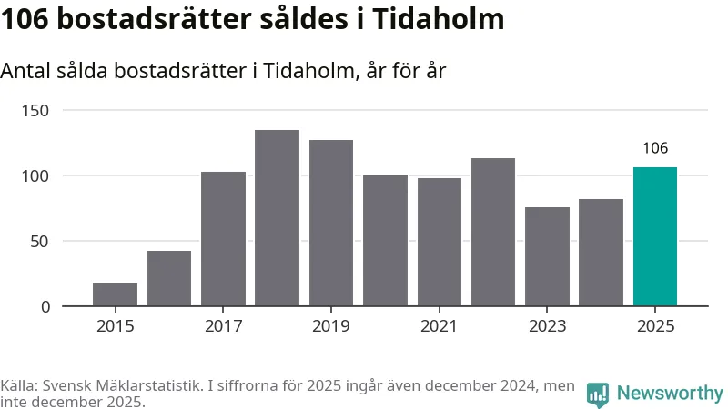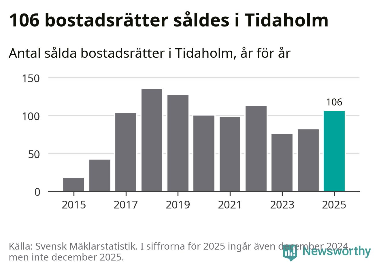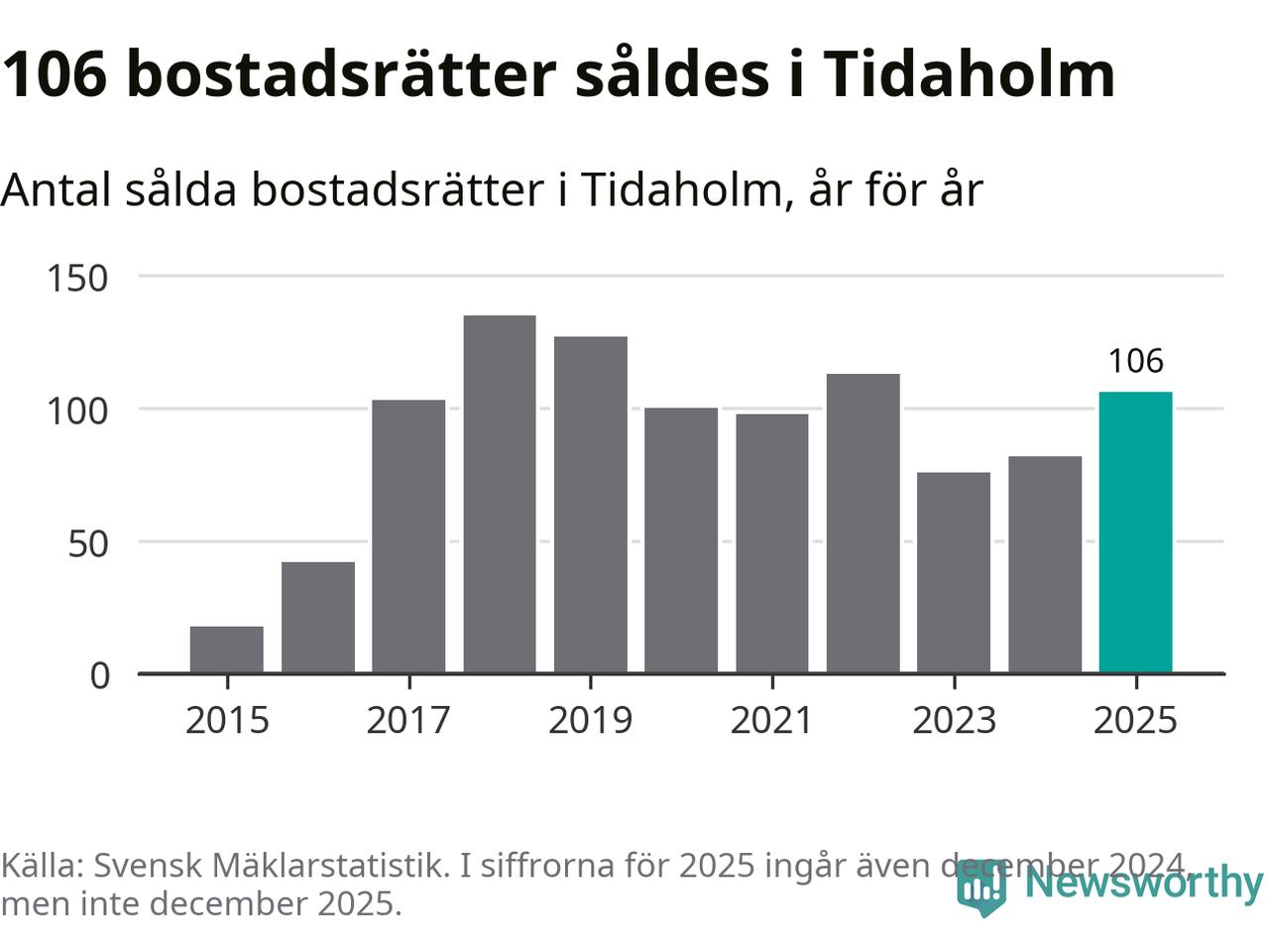 Det såldes totalt 106 bostadsrätter i Tidaholms kommun under året. Genomsnittspriset per kvadratmeter landade på 5 017 kronor. Det är en ökning med tolv procent i kommunen på ett år.