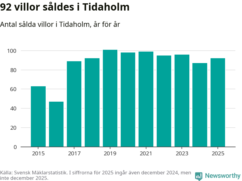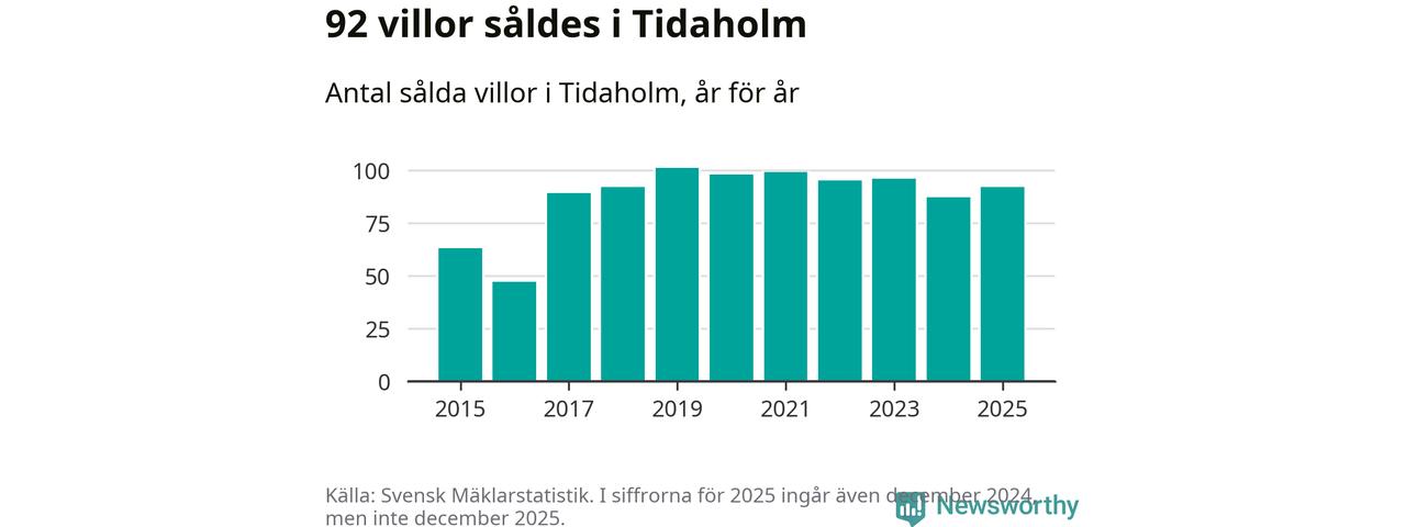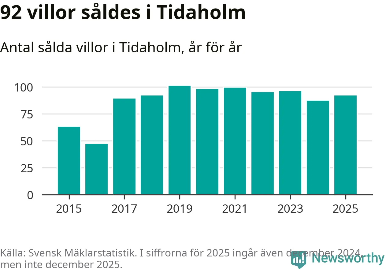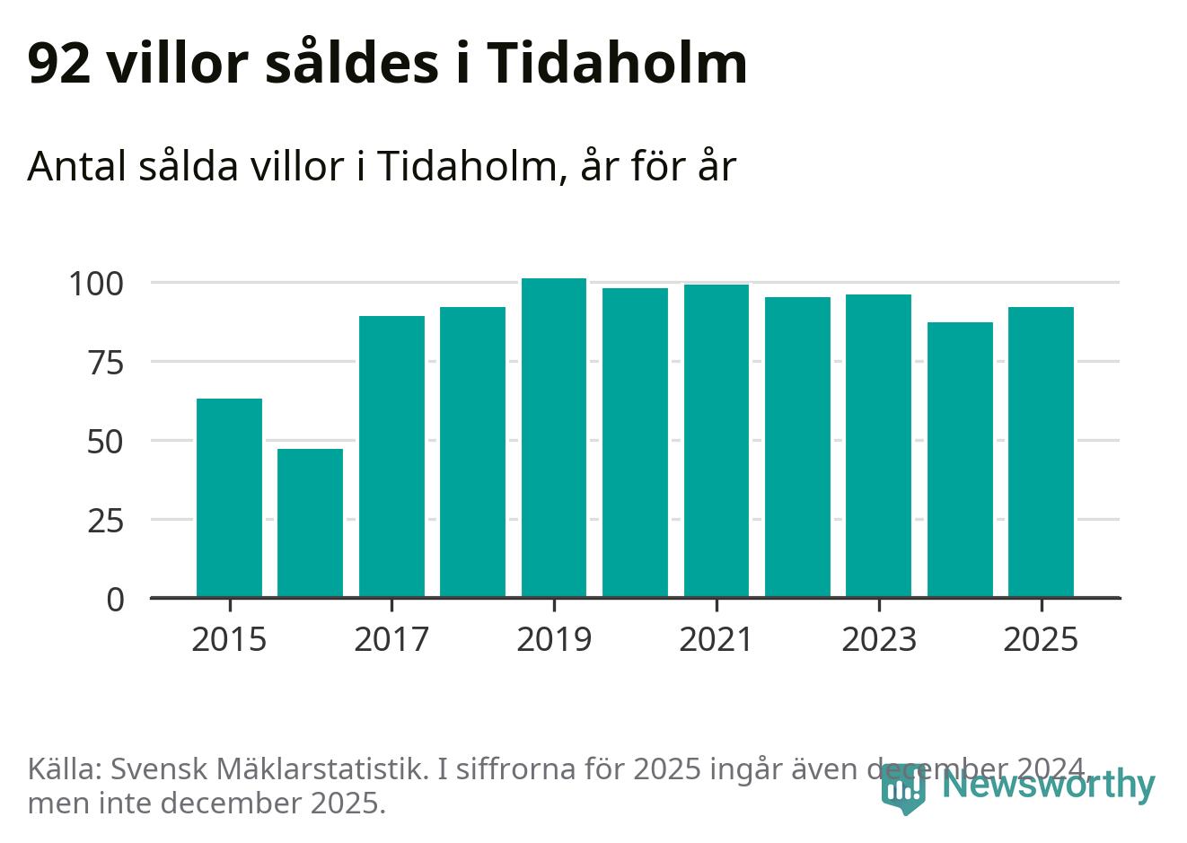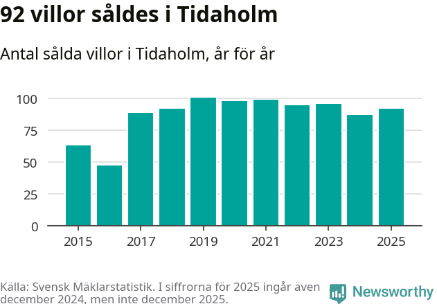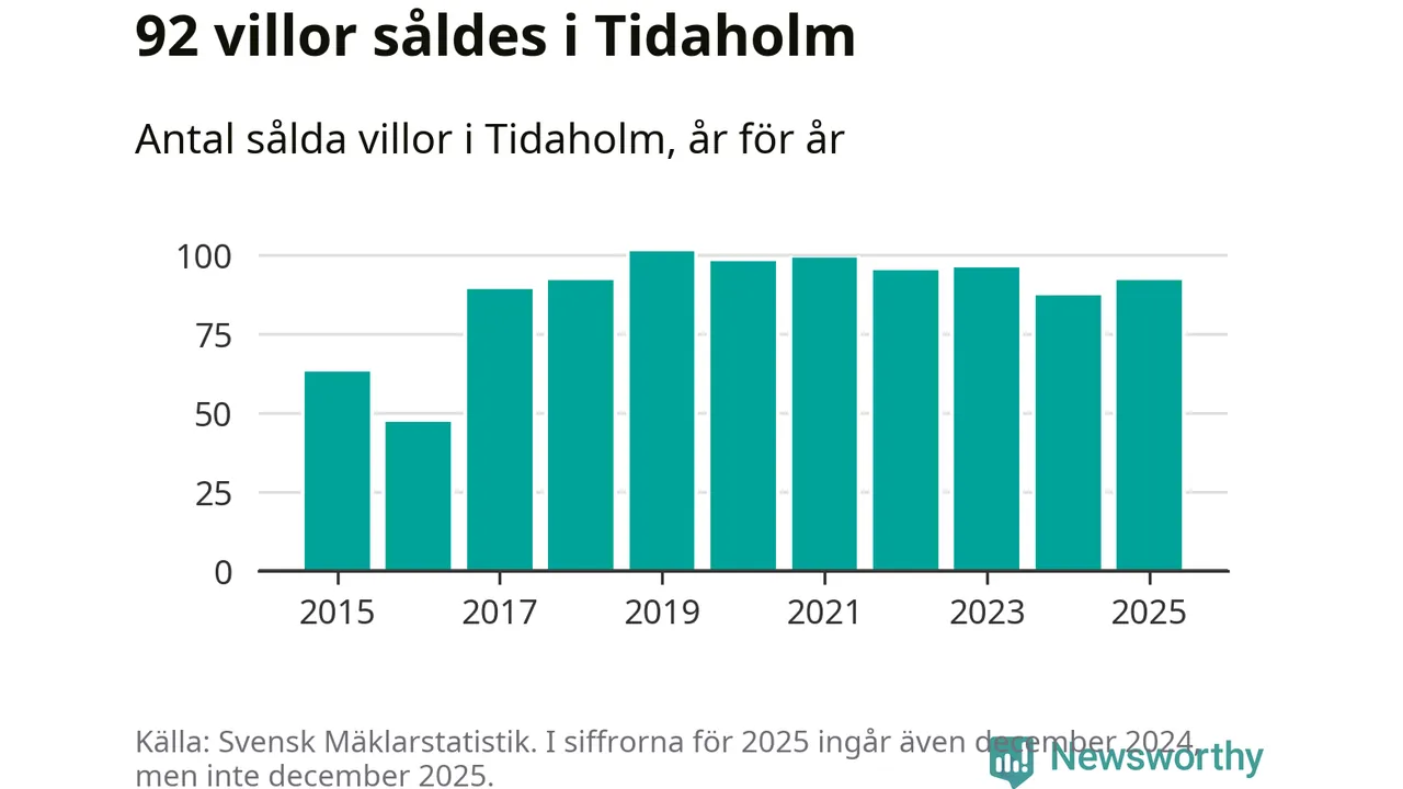 Däremot ökade antalet sålda villor. Totalt såldes 92 villor, att jämföra med 87 under 2024.