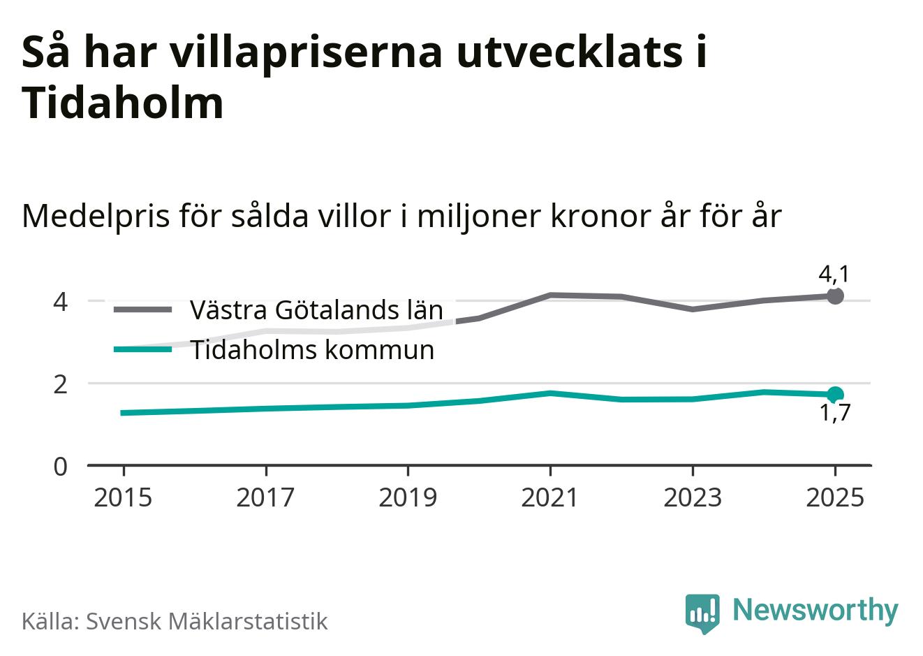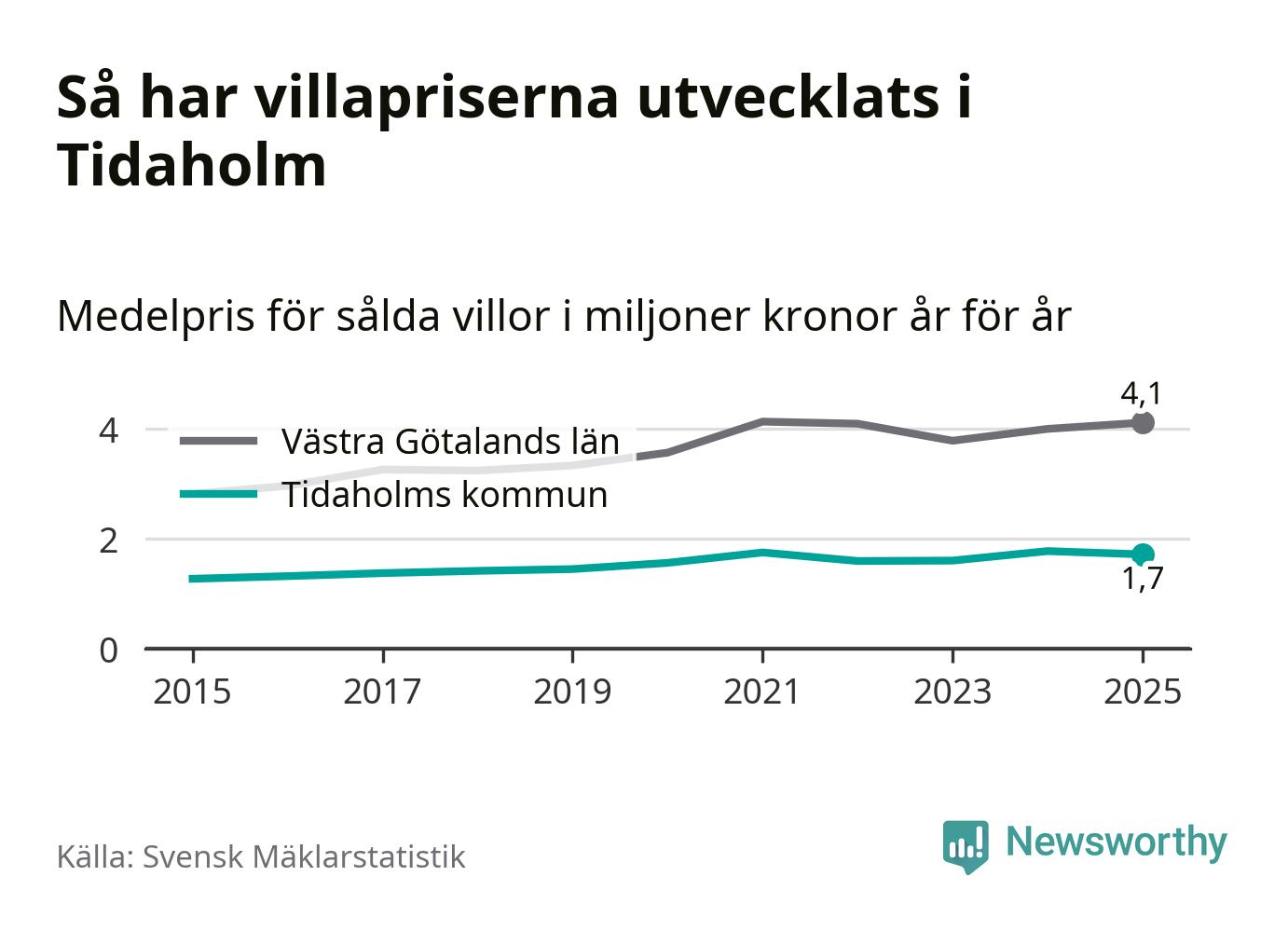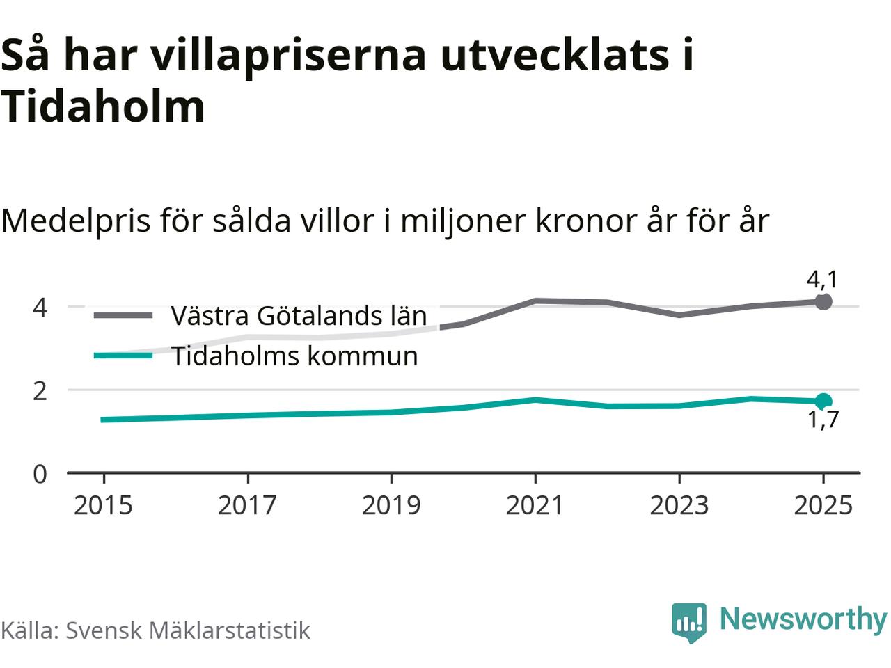 1,7 miljoner kronor är medelpriset för de villor som såldes i Tidaholms kommun under året, eller 15 496 kronor per kvadratmeter. Det innebär en prisminskning med tre procent på ett år.