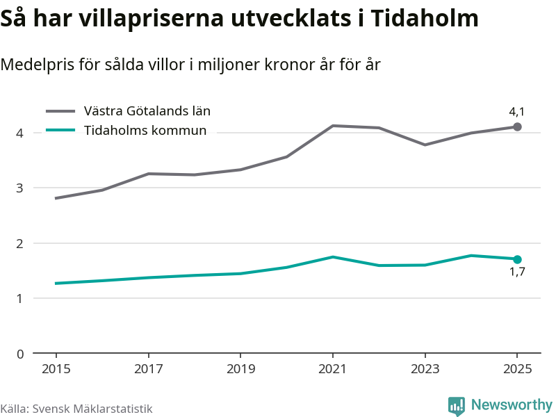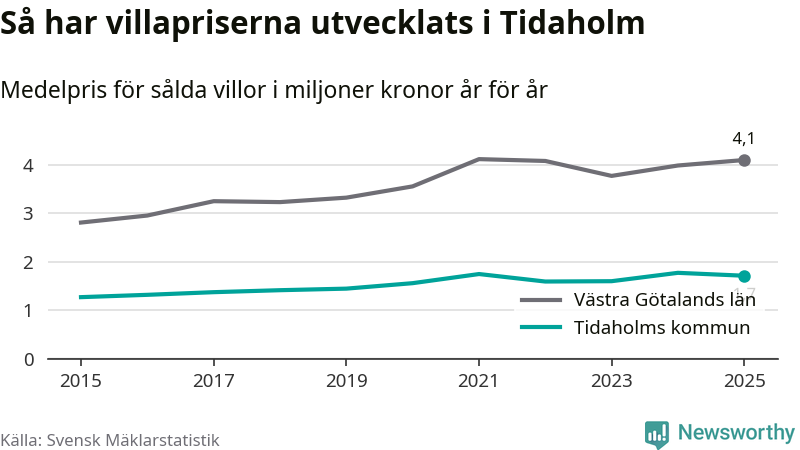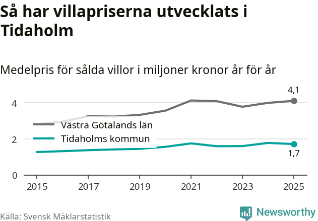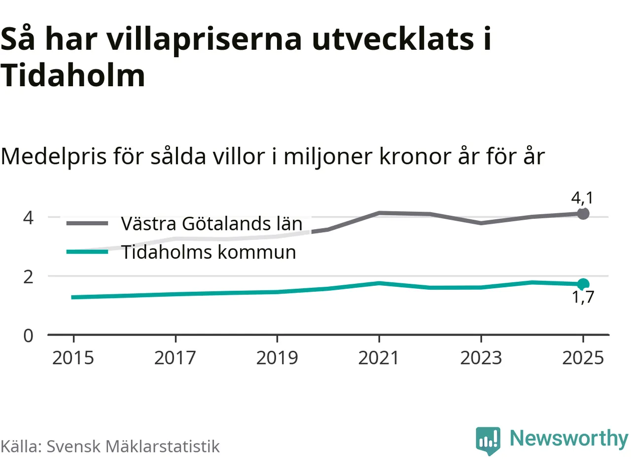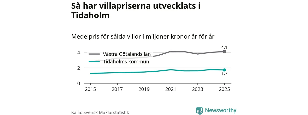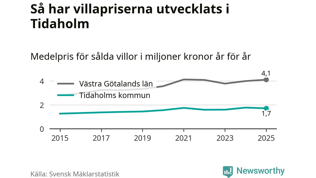 1,7 miljoner kronor är medelpriset för de villor som såldes i Tidaholms kommun under året, eller 15 496 kronor per kvadratmeter. Det innebär en prisminskning med tre procent på ett år.