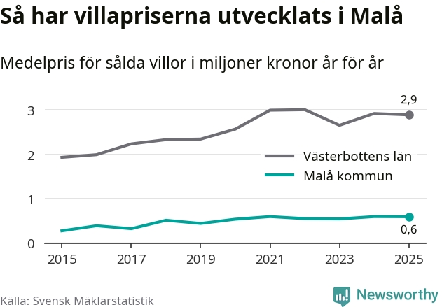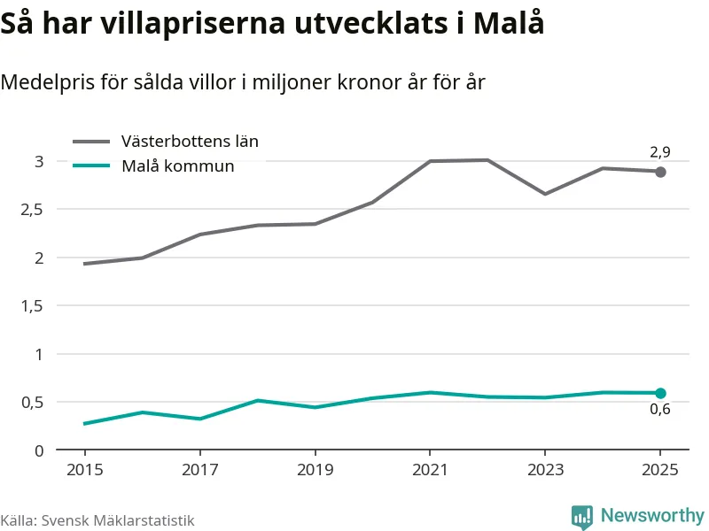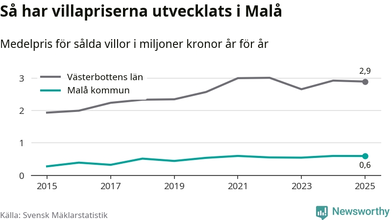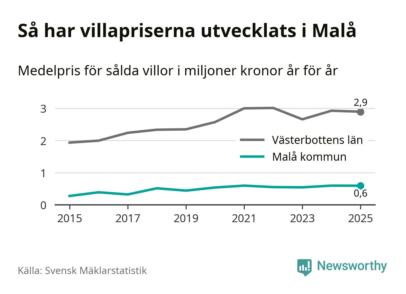 Priserna på villor i Västerbottens län som helhet har minskat med en procent sedan förra året.